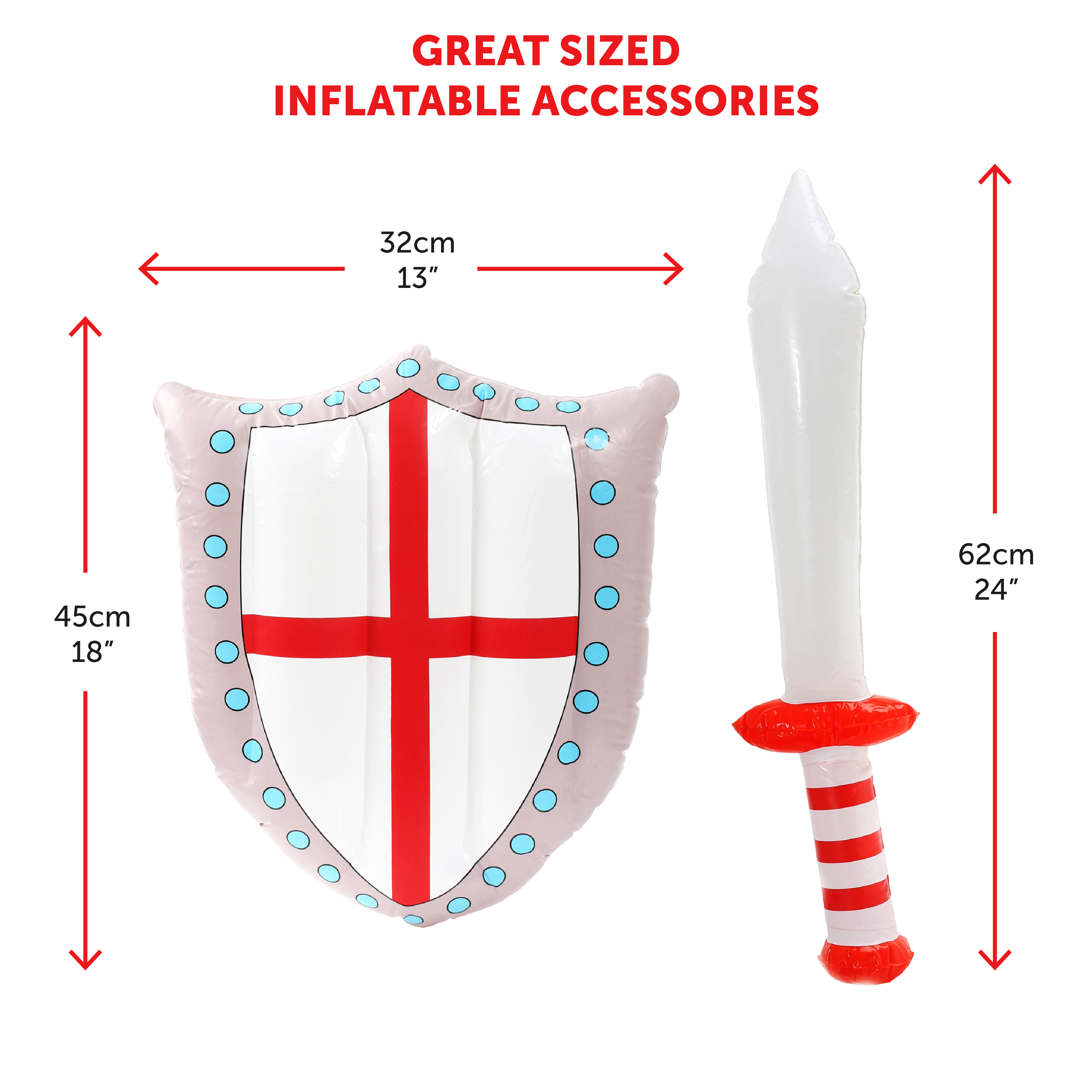 GREAT SIZE INFLATABLES: The Sword and Shield both have a valve designed for easy inflation by pump or breath! Once inflated, the Sword measures a length of 62cm (24"), and the Shield measures 45cm x 32cm (18" x 13")