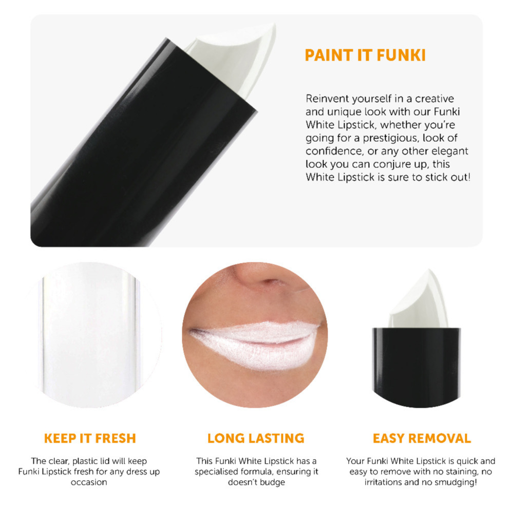 - PERFECT FOR ANY FANCY DRESS, MAKE UP, AND OUTINGS: Whether it be to complete a fancy-dress costume with some unique, stylish lipstick, completing looks for Halloween, or any other brilliant scenario you can think of, use our Funki White Lipstick!