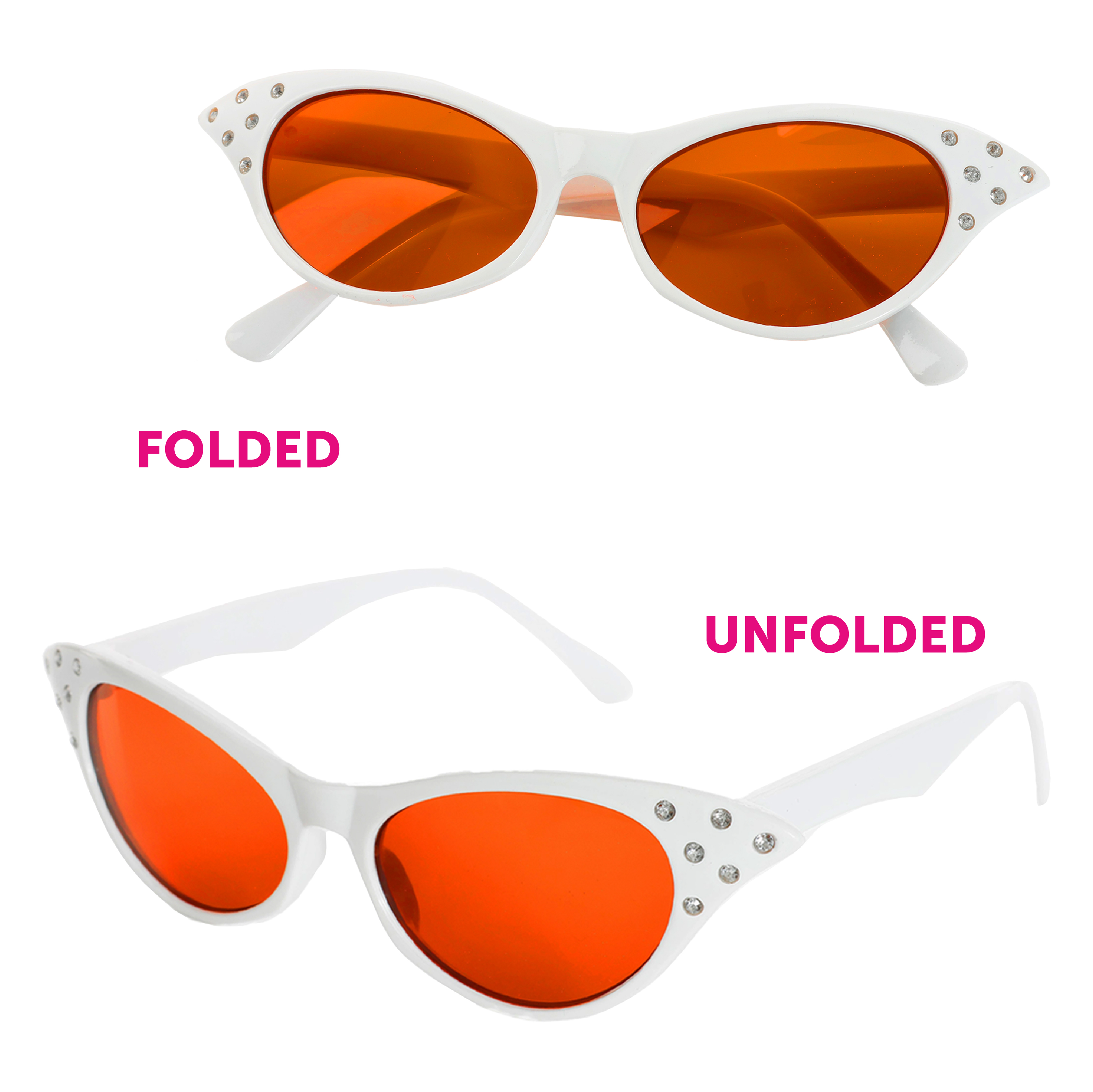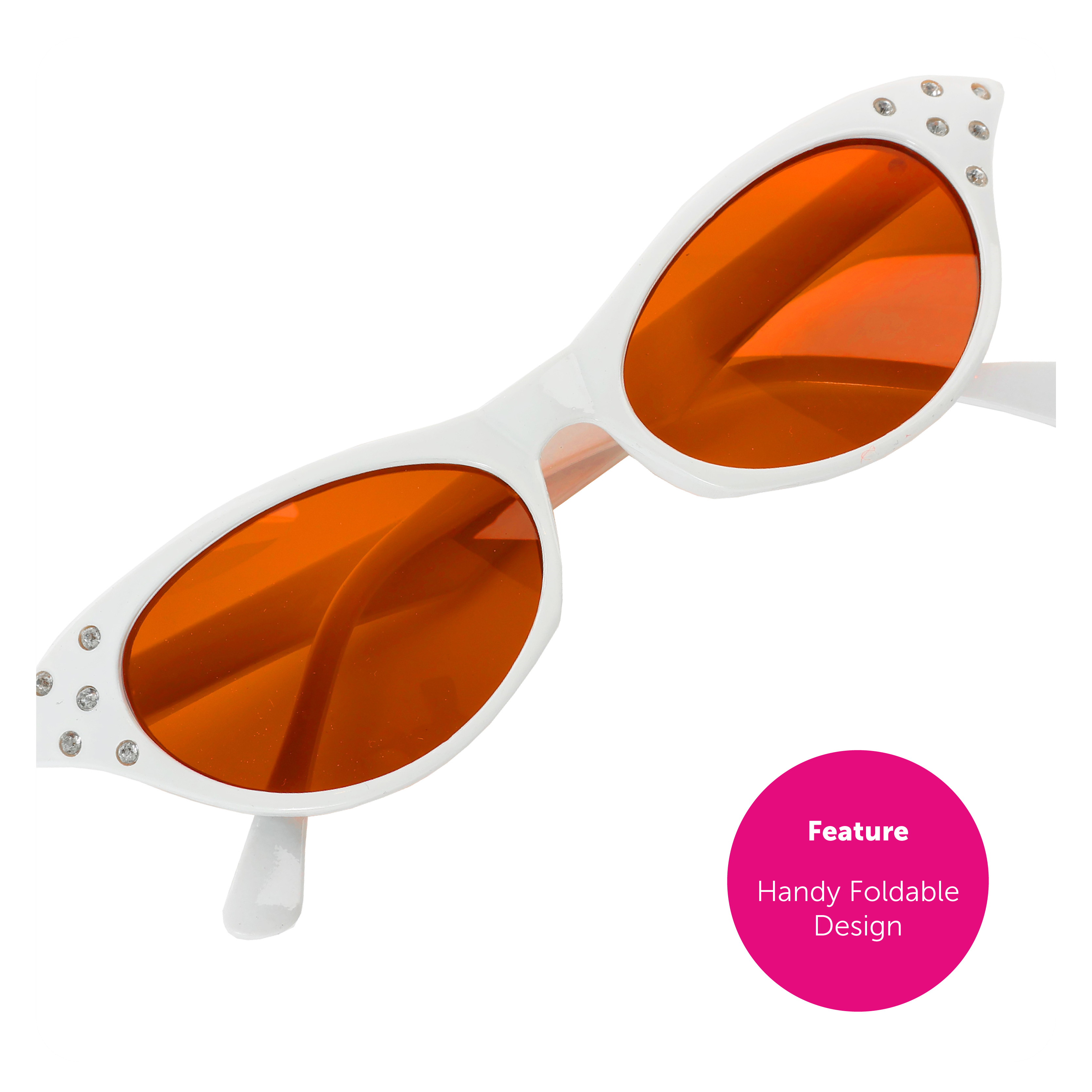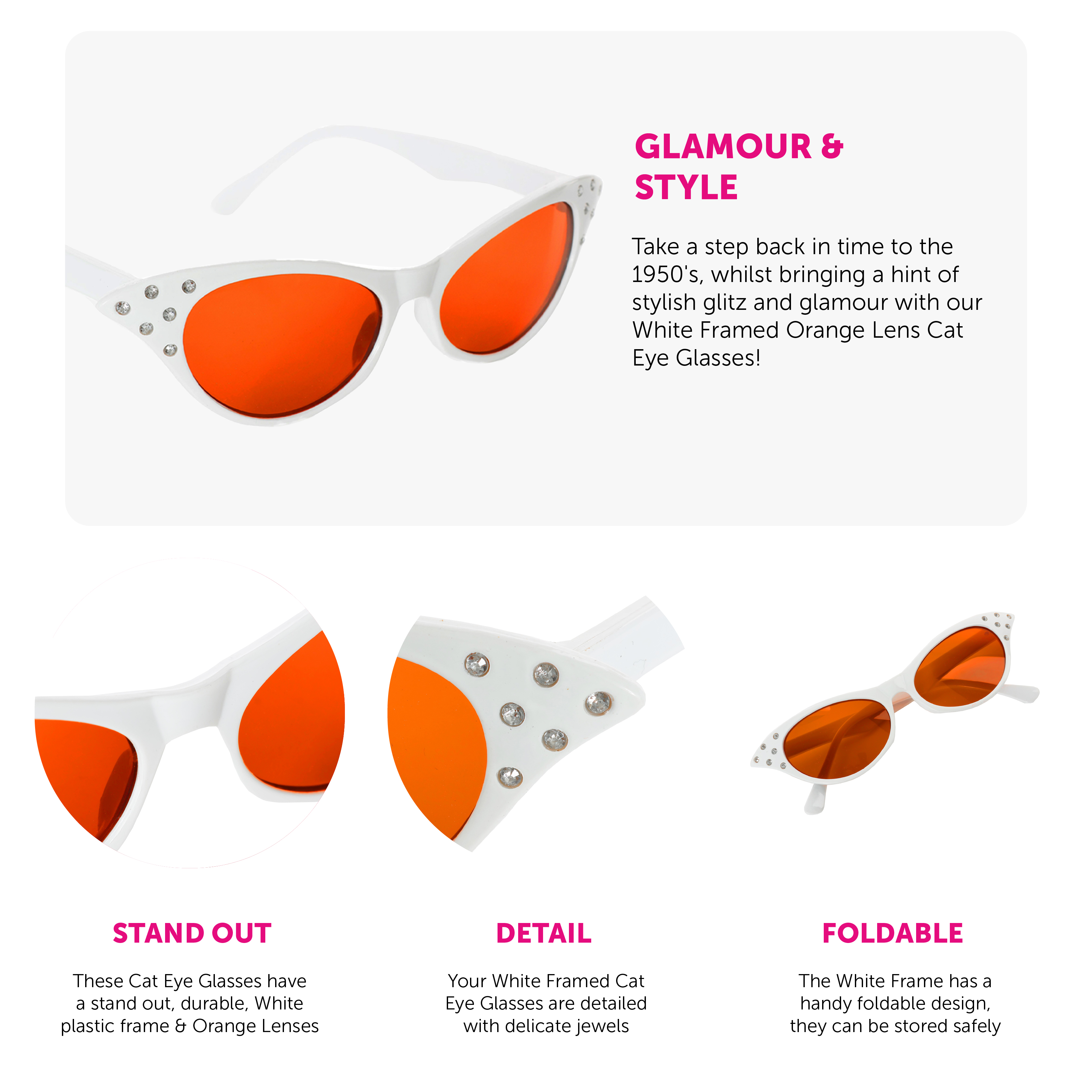 PERFECT FOR 50'S FANCY DRESS: Whether you're dolling yourself up ready for a 1950's themed fancy dress party or a special Hen Party, you'll need an elegant finishing touch to your costume with our White Framed Orange Lens Cat Eye Glasses!