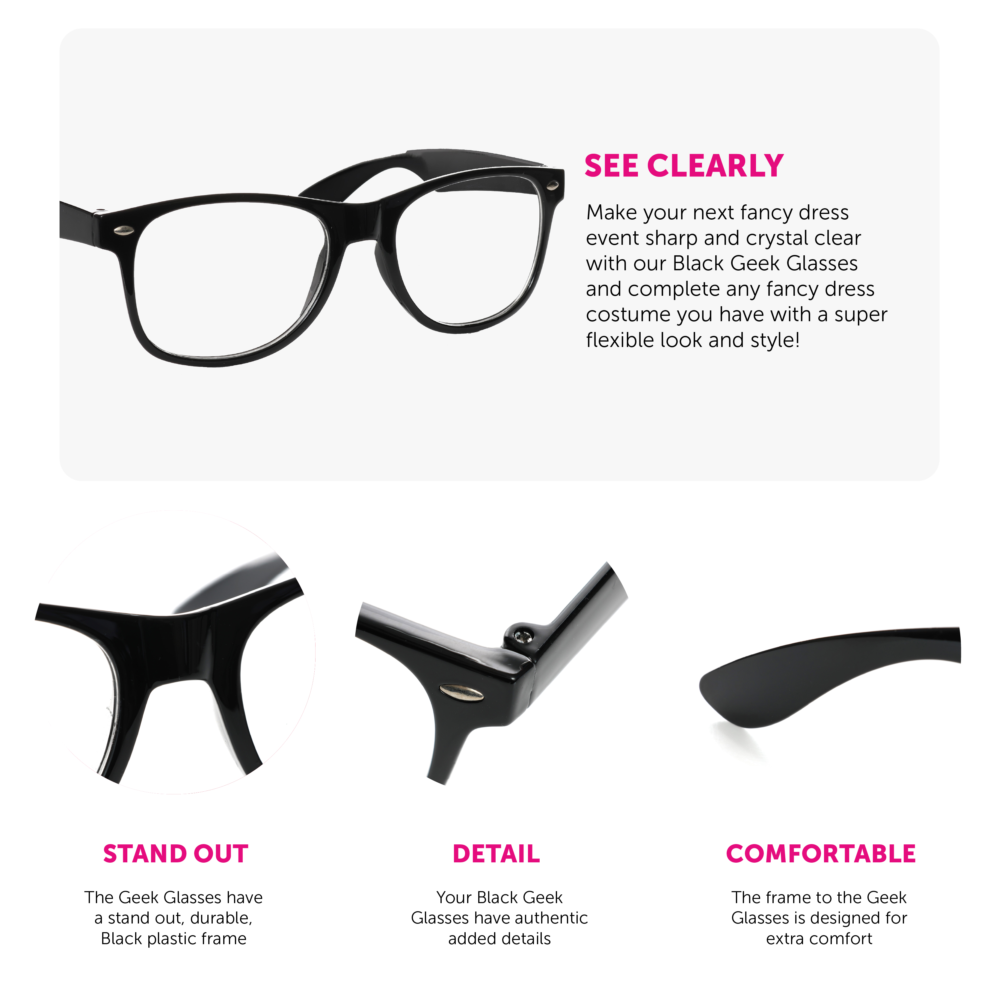 GREAT ACCESSORY TO ANY COSTUME: No Matter what costume you wear to any Fancy Dress party, there’s always somewhere for a pair of Black Geek Glasses to shake up an appearance for the next fancy dress event!