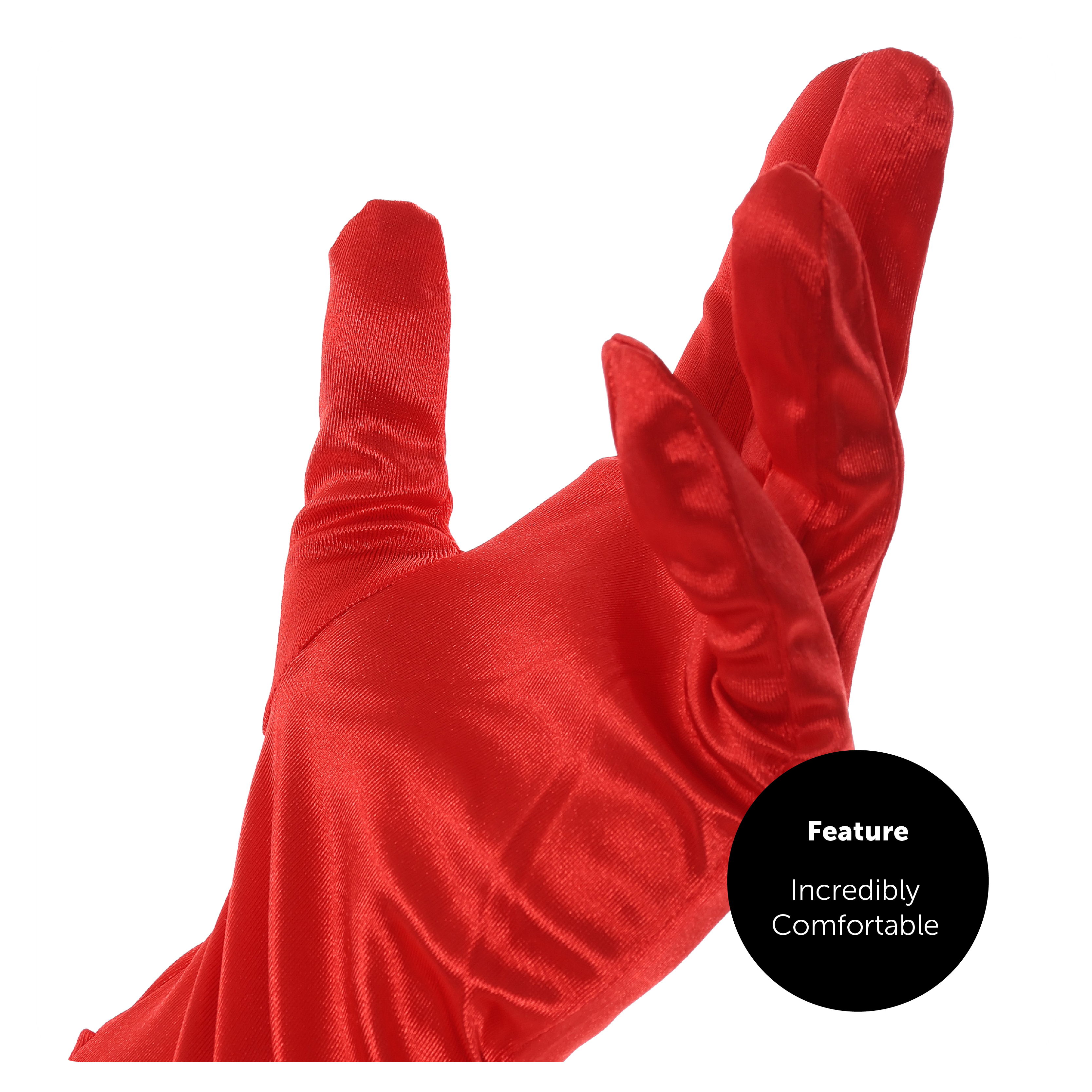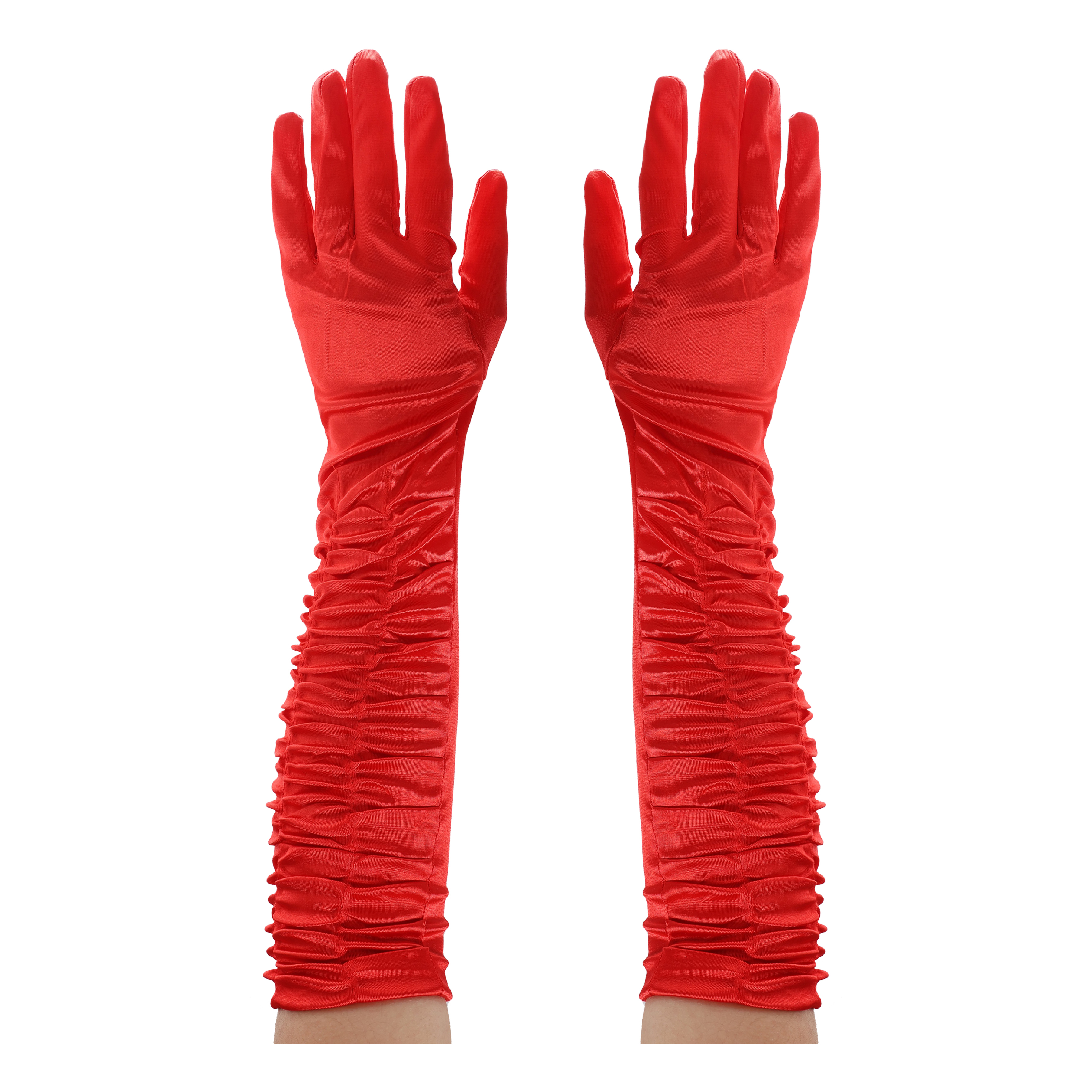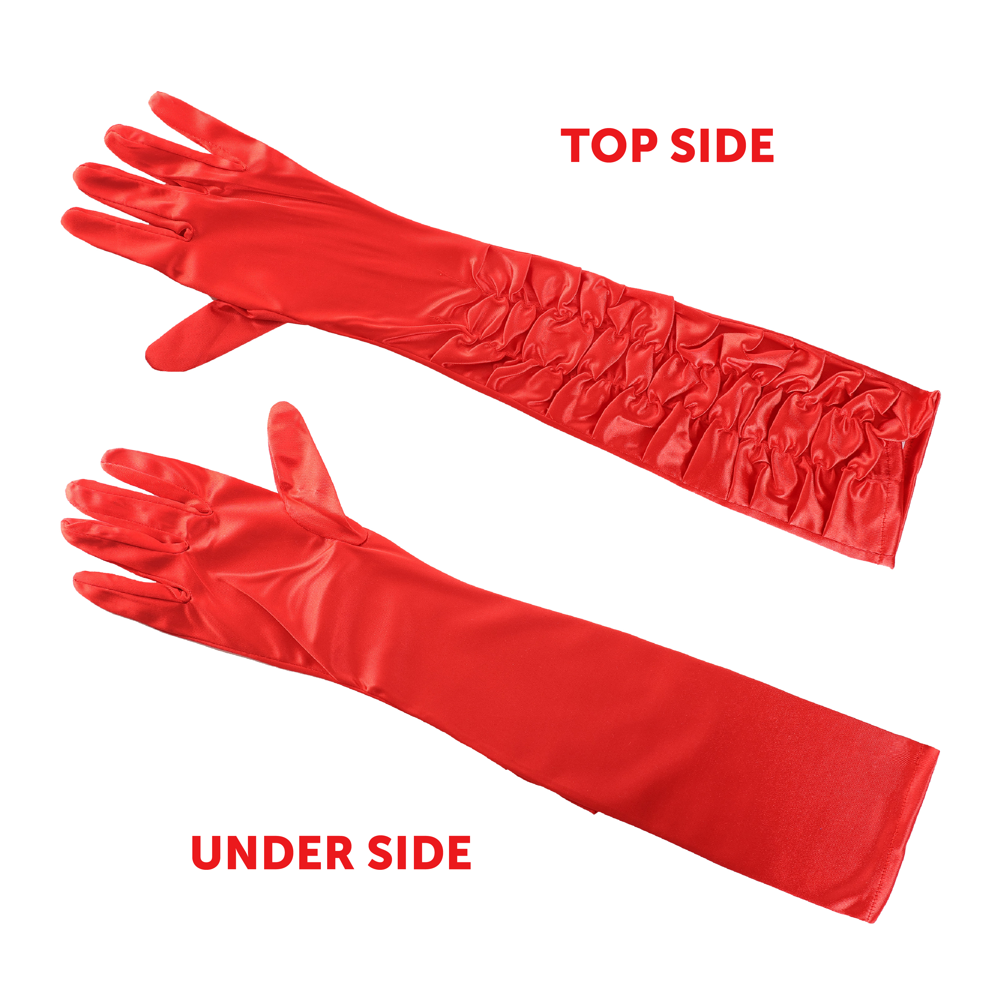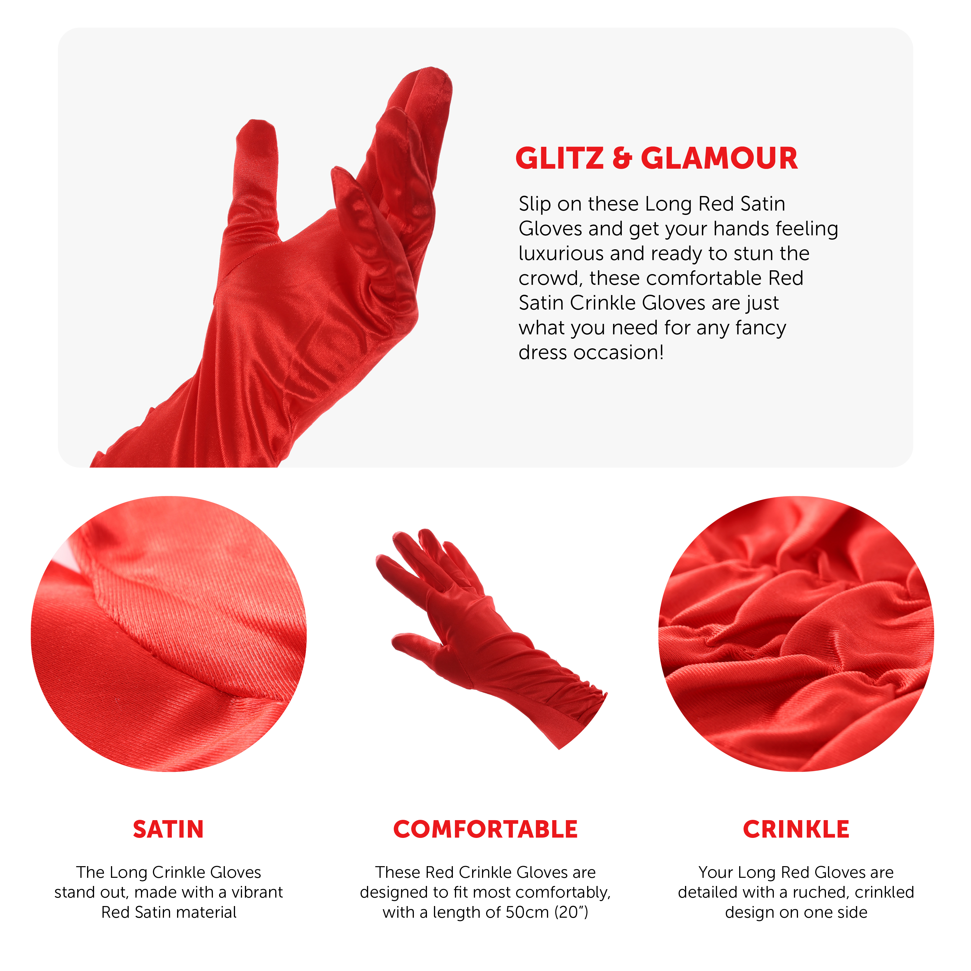 RED GLOVES DETAILS: Your Adults Long Red Satin Crinkle Gloves are made from a soft comfortable Satin material that makes for easy wearing and is to be worn all day without discomfort, and look stunning!