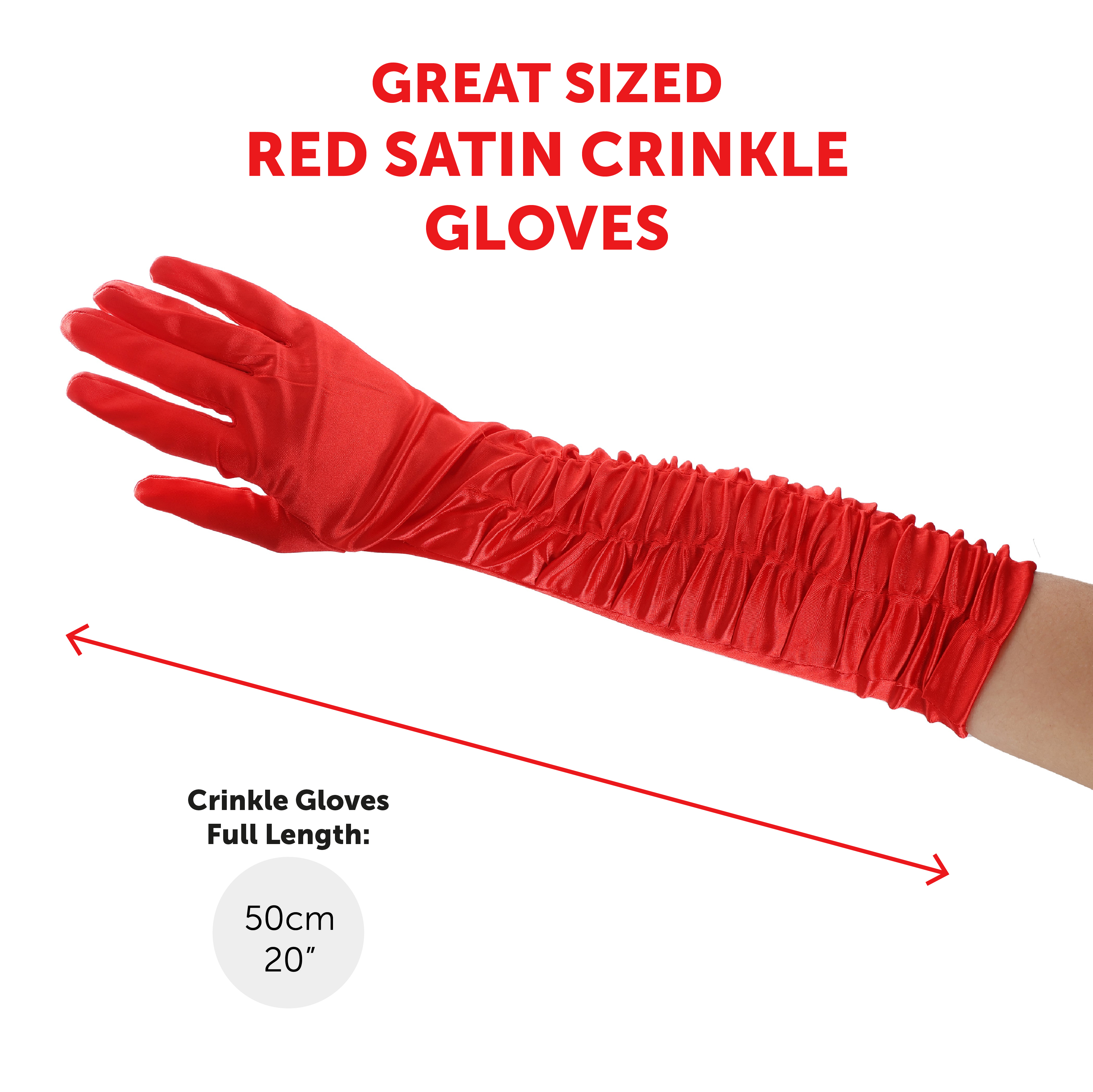 ONE SIZE FITS MOST: The Red Satin Crinkle Gloves are one size, fitting most Adults comfortably! The Gloves measure a length of 50cm (20”), the perfect Costume accessory for any event!