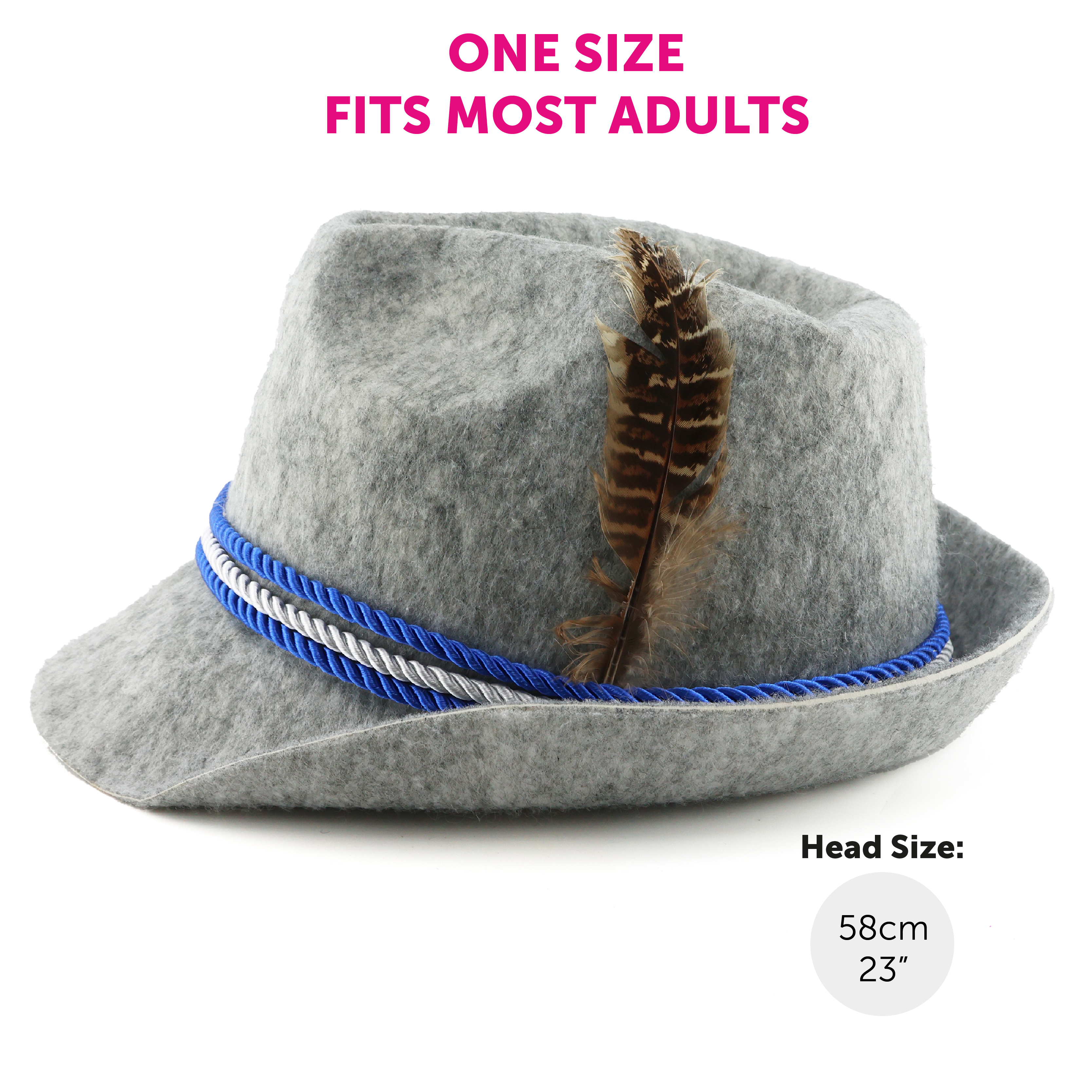 ONE SIZE FITS MOST: The Grey Bavarian Hat is designed to fit most Adults comfortably with a head size measuring up to 58cm (23")