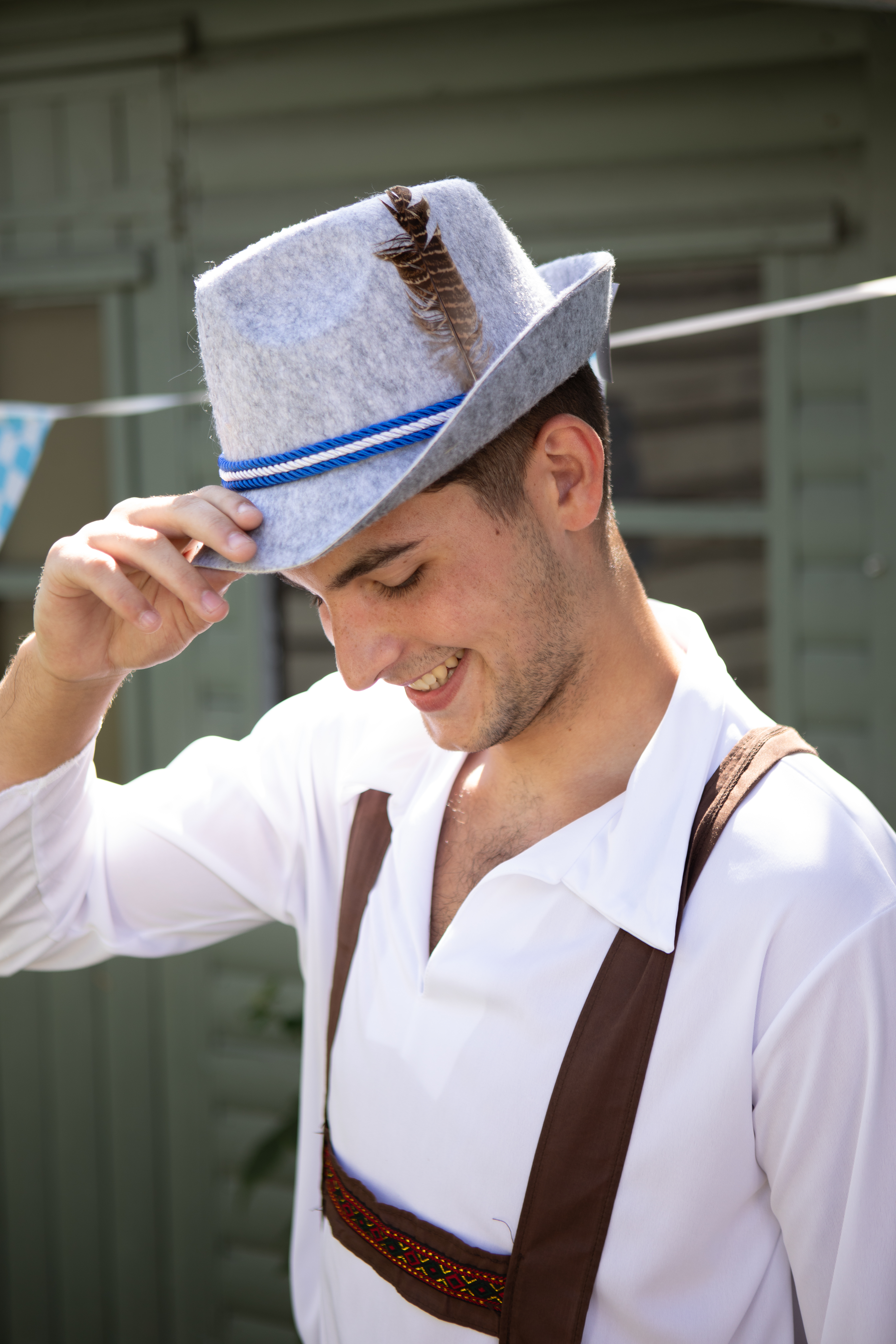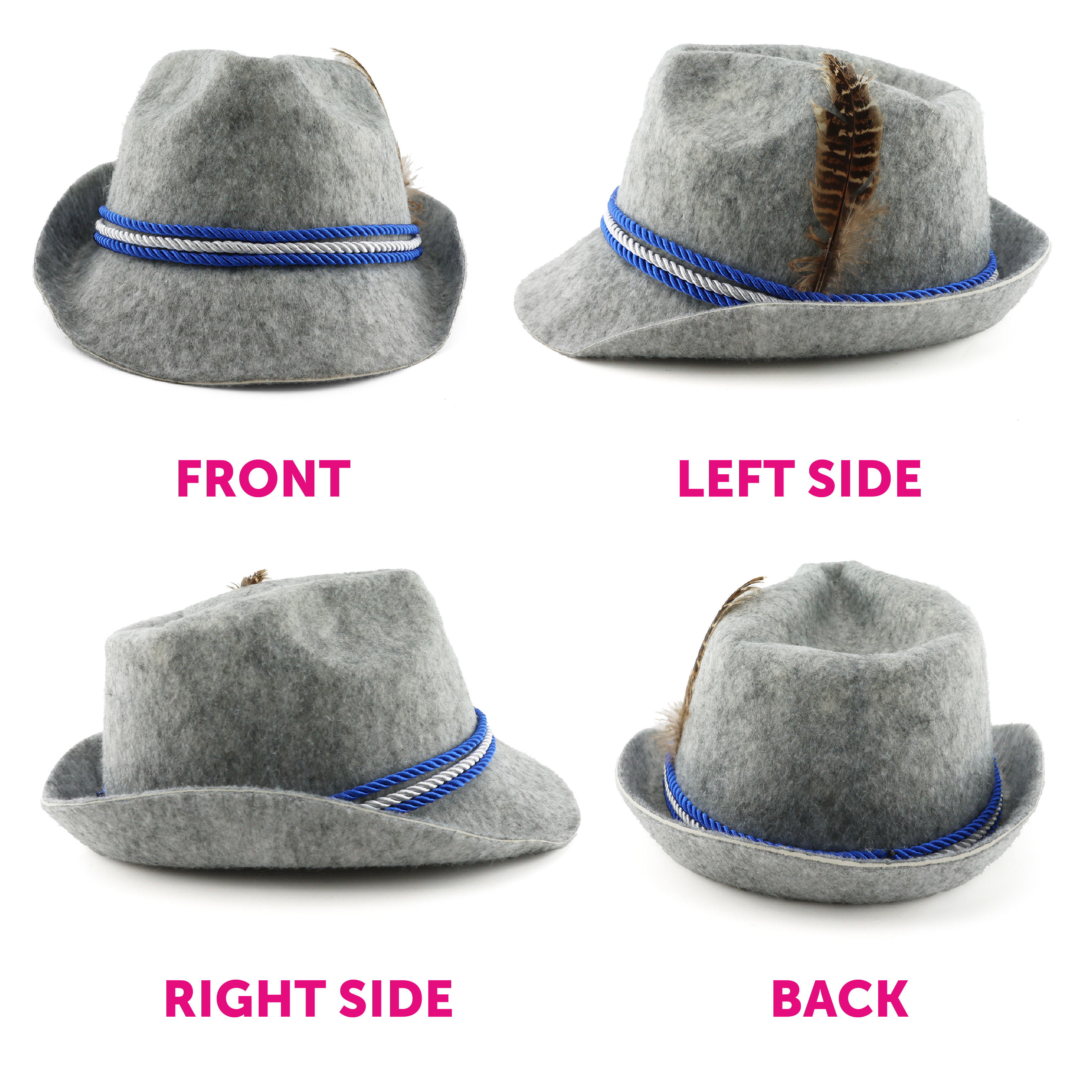 SET INCLUDES: Your Bavarian Set includes a high quality Grey Bavarian Hat with an alternating Blue and White Rope band, and Brown Feather detail, and a pair of knee high Bavarian Socks to complete the look!