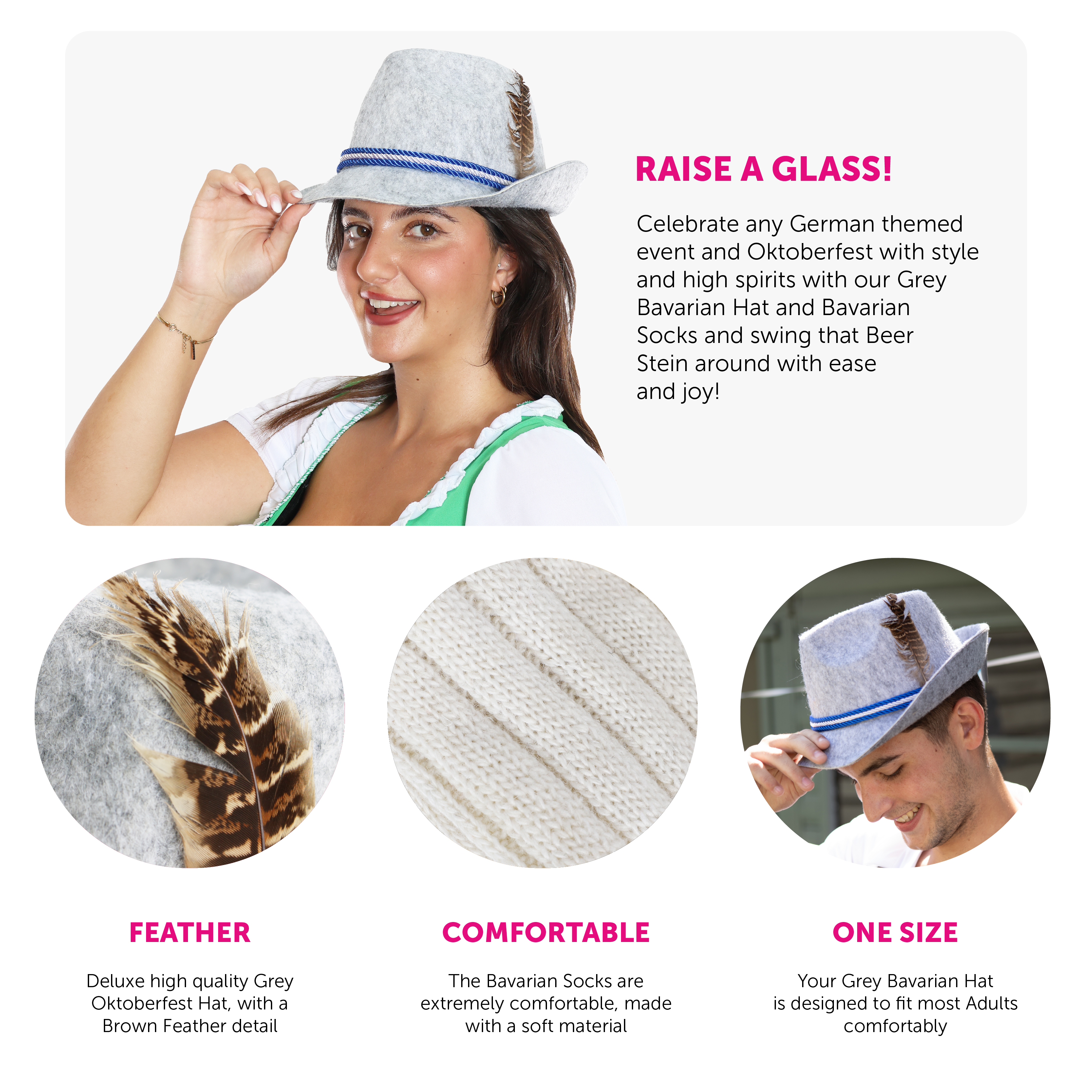 PERFECT FOR OKTOBERFEST & GERMAN THEMED PARTIES: Whether you’re enjoying a German Themed Party, or celebrating Oktoberfest with your friends and family, our Grey Bavarian Hat and Bavarian Socks is the perfect accessory for the occasion!