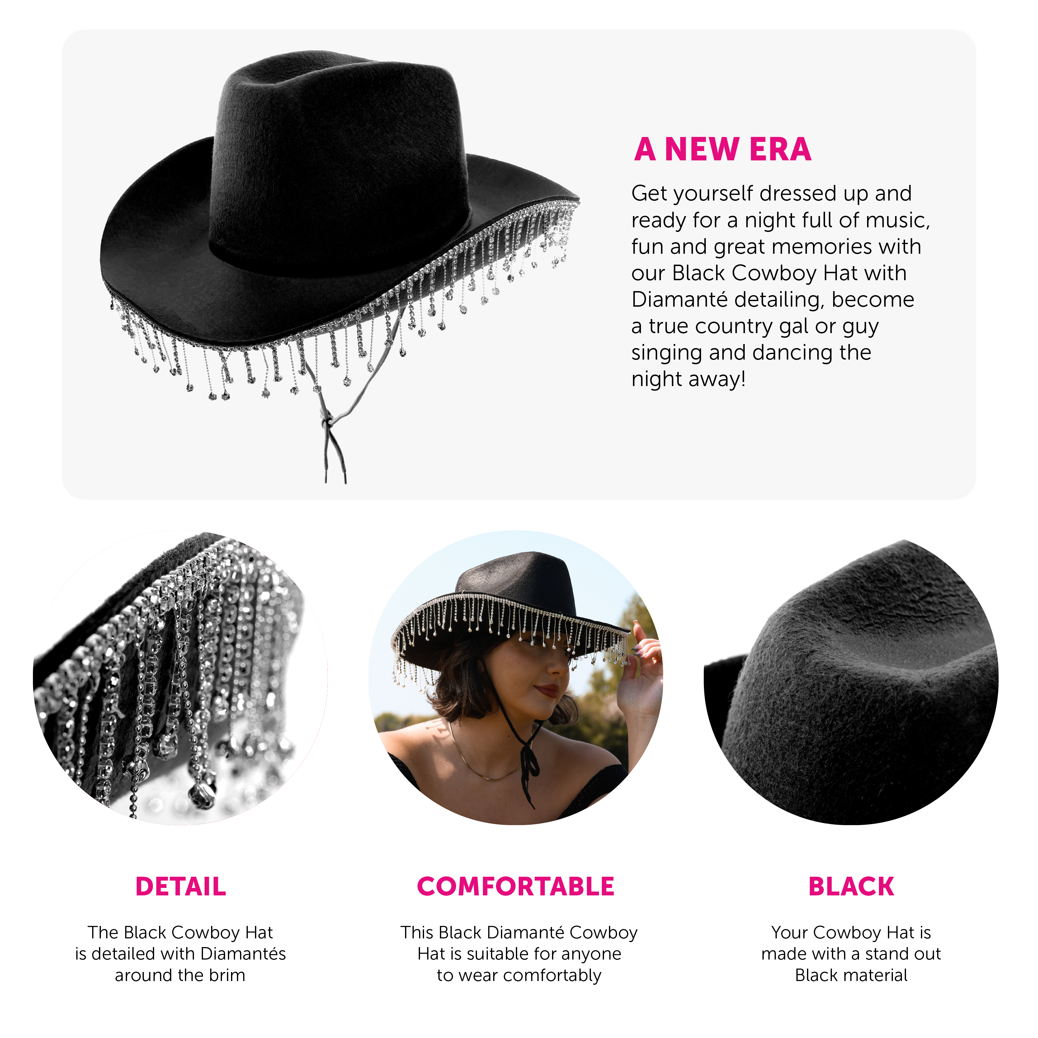 BLACK COWBOY HAT WITH DIAMANTES: Get yourself dressed up and ready for a night full of music, fun and great memories with our Black Cowboy Hat with Diamanté detailing, become a true Country Gal or Guy singing and dancing the night away!