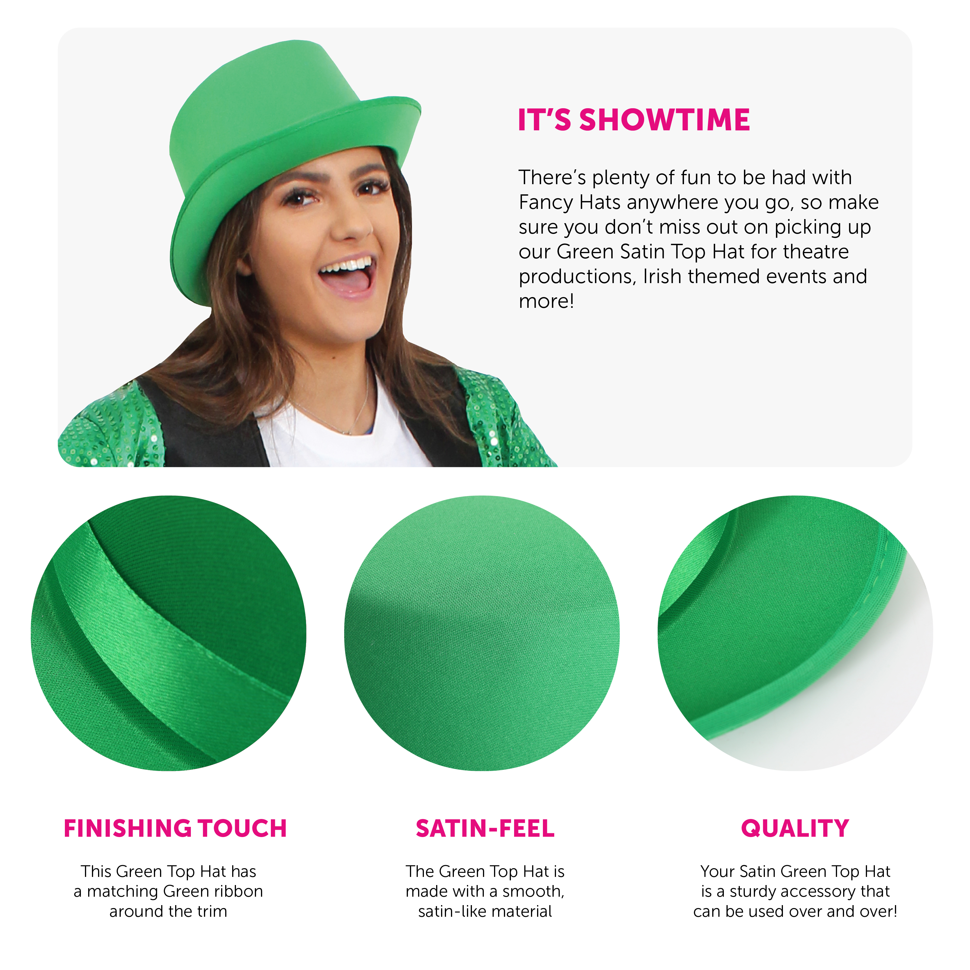 GREEN SATIN TOP HAT: There’s plenty of fun to be had with Fancy Hats anywhere you go, so make sure you don’t miss out on picking up our Green Satin Top Hat for theatre productions, Irish themed events and more!