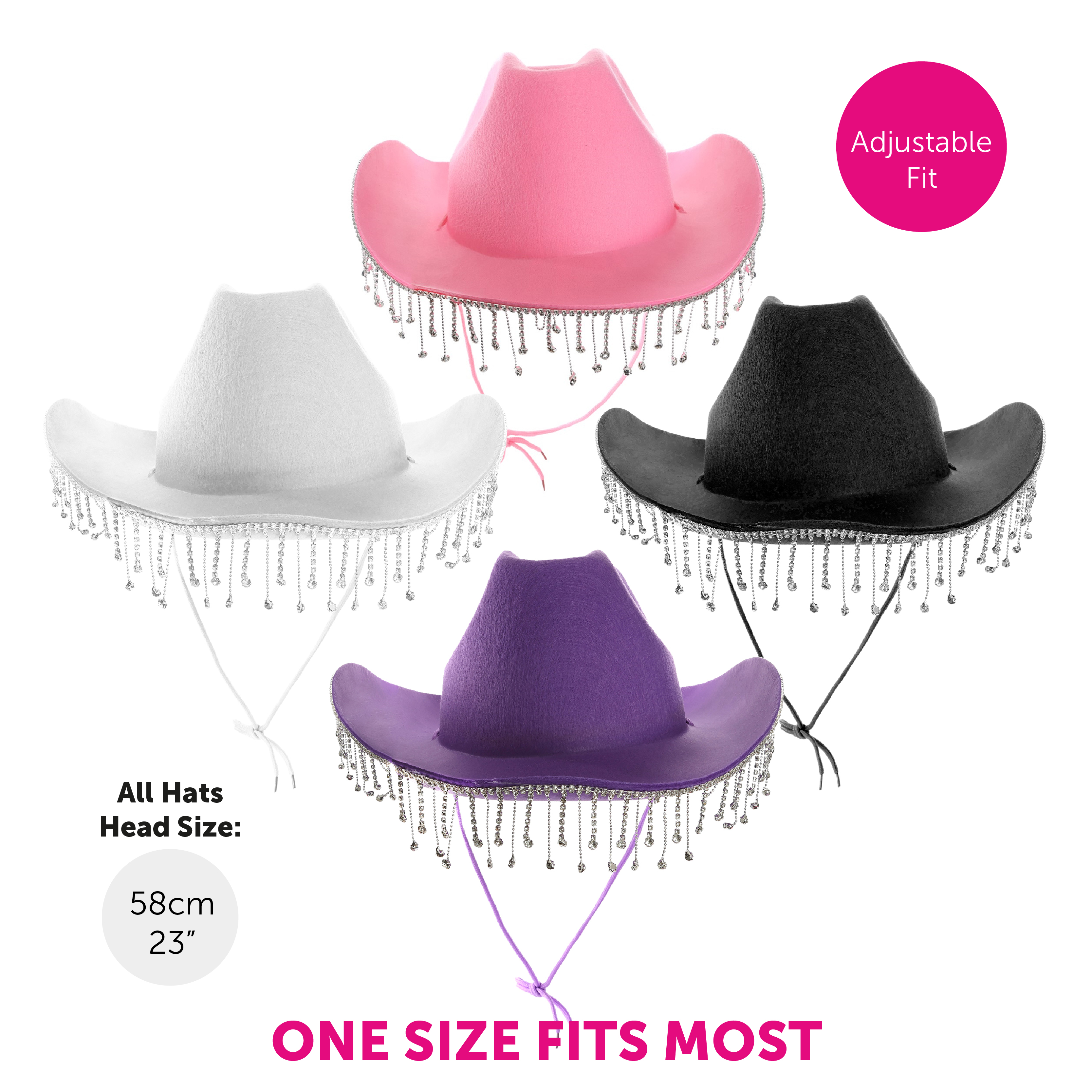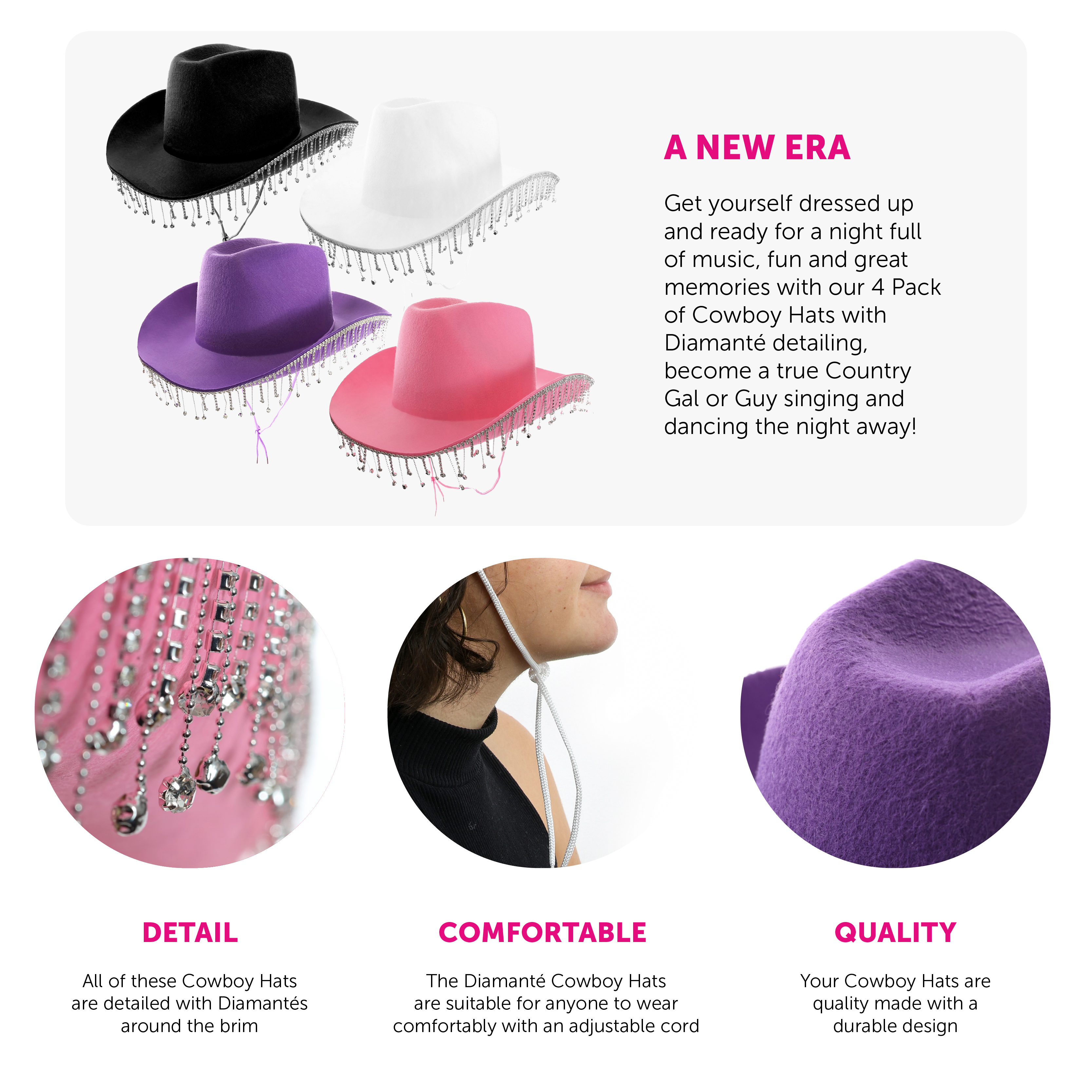 PACK INCLUDES: This 4 Pack includes 1x Purple, 1x White, 1x Pink and 1x Black Cowboy Hat, all with Diamanté detailing around the brim and an adjustable string for extra comfort, the perfect way to finish off your outfit!