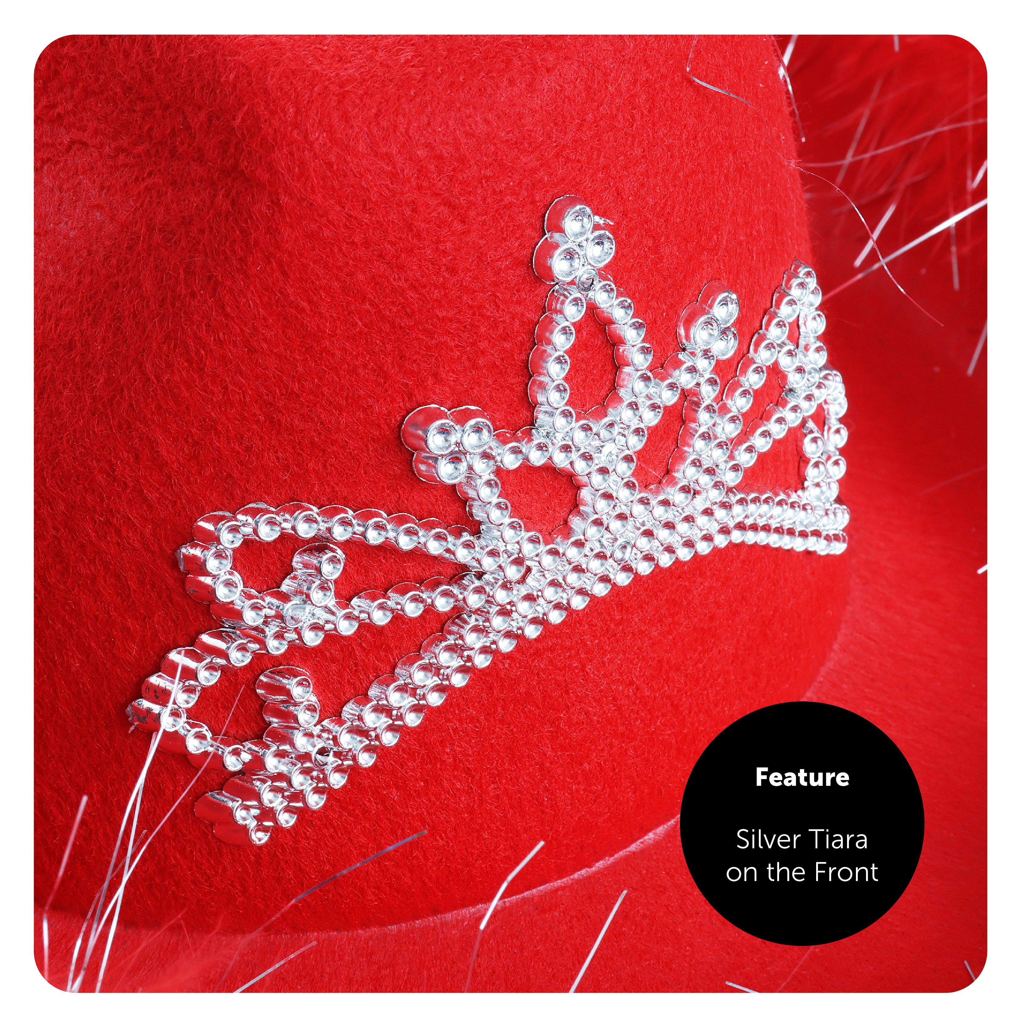 COWGIRL HAT DETAILS: This Cowgirl Hat is a beautiful Red colour, with a matching fluffy Marabou Feather trim, a Silver Tiara on the front and an adjustable string for extra comfort, the perfect way to finish off your outfit!
