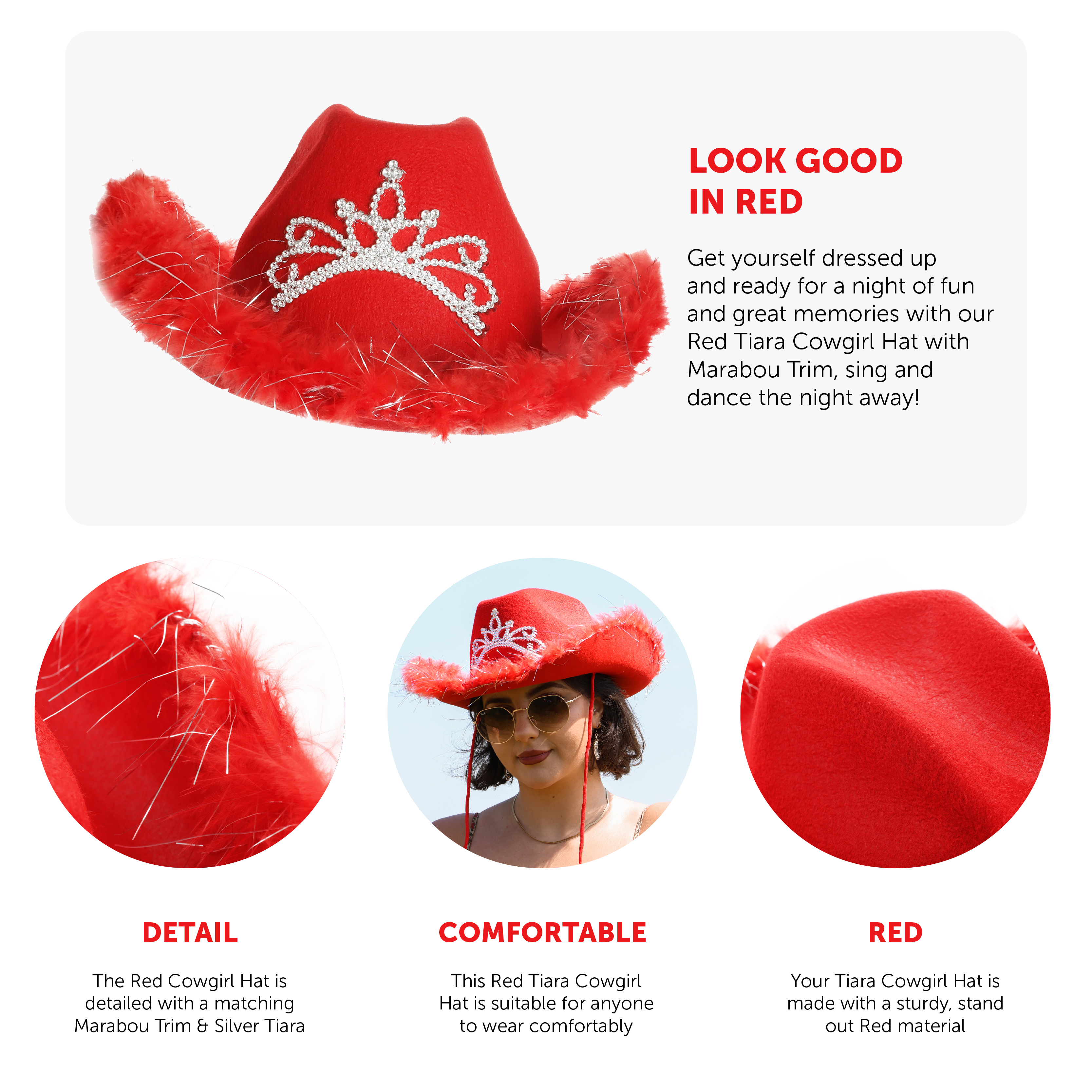 RED TIARA COWGIRL HAT WITH MARABOU TRIM: Get yourself dressed up and ready for a night of fun and great memories with our Red Tiara Cowgirl Hat with Marabou Trim, sing and dance the night away!