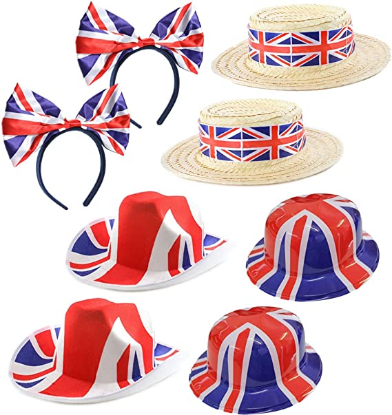 - Includes: 2x Union Jack Flag Bow on a Black Headband, 2x Straw Boater Hats with a Union Jack Flag Band, 2x Felt Cowboy Hats with a Union Jack Flag Print, 2x Plastic Bowler Hats with Union Jack Flag Print