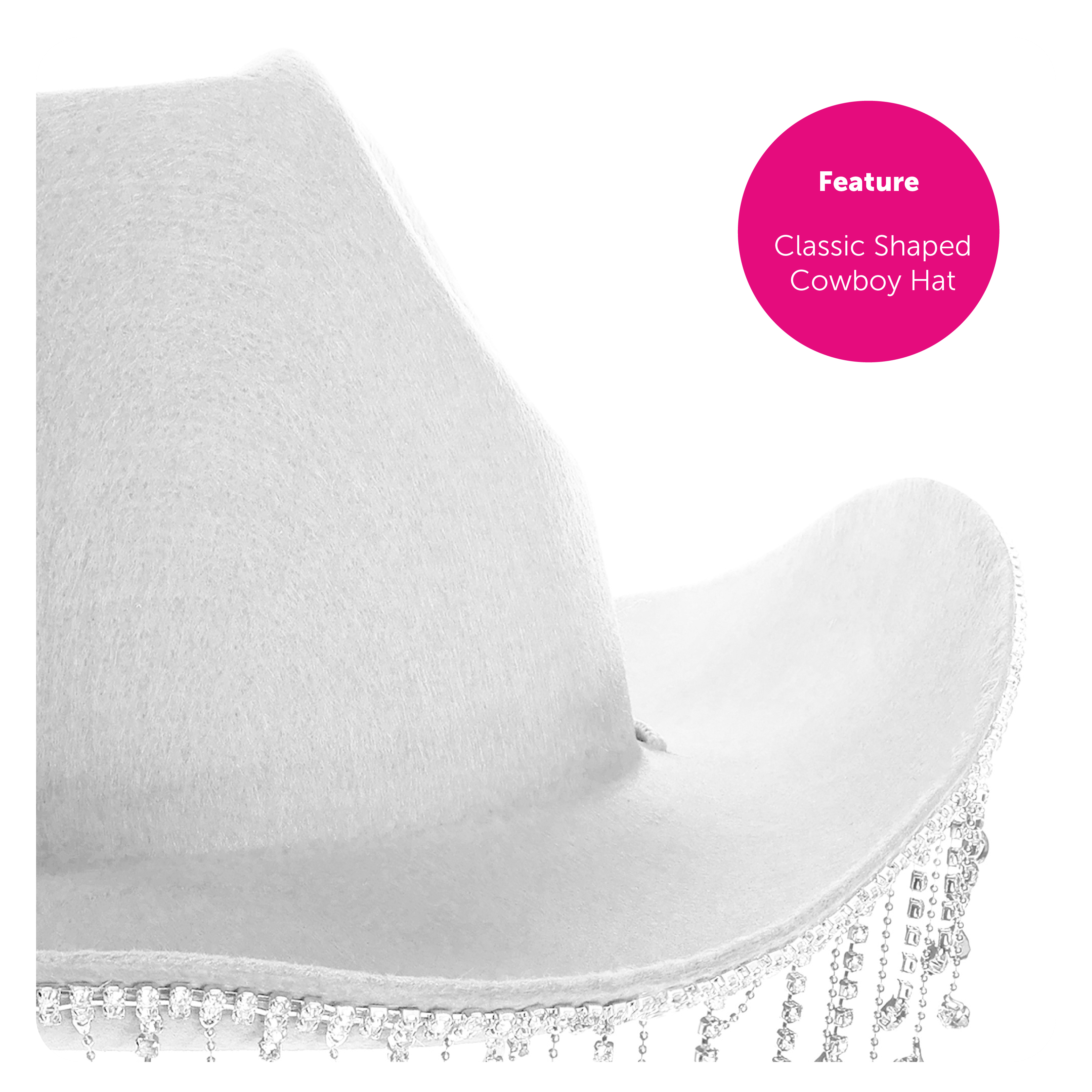 Bring the sparkle with this subtle white cowboy hat, trimmed with shimmering diamanté accents around the brim. Designed to catch the light and turn heads, this hat includes an adjustable white chin strap for all-night comfort. One size fits most, making it an easy fit for your show-ready look.