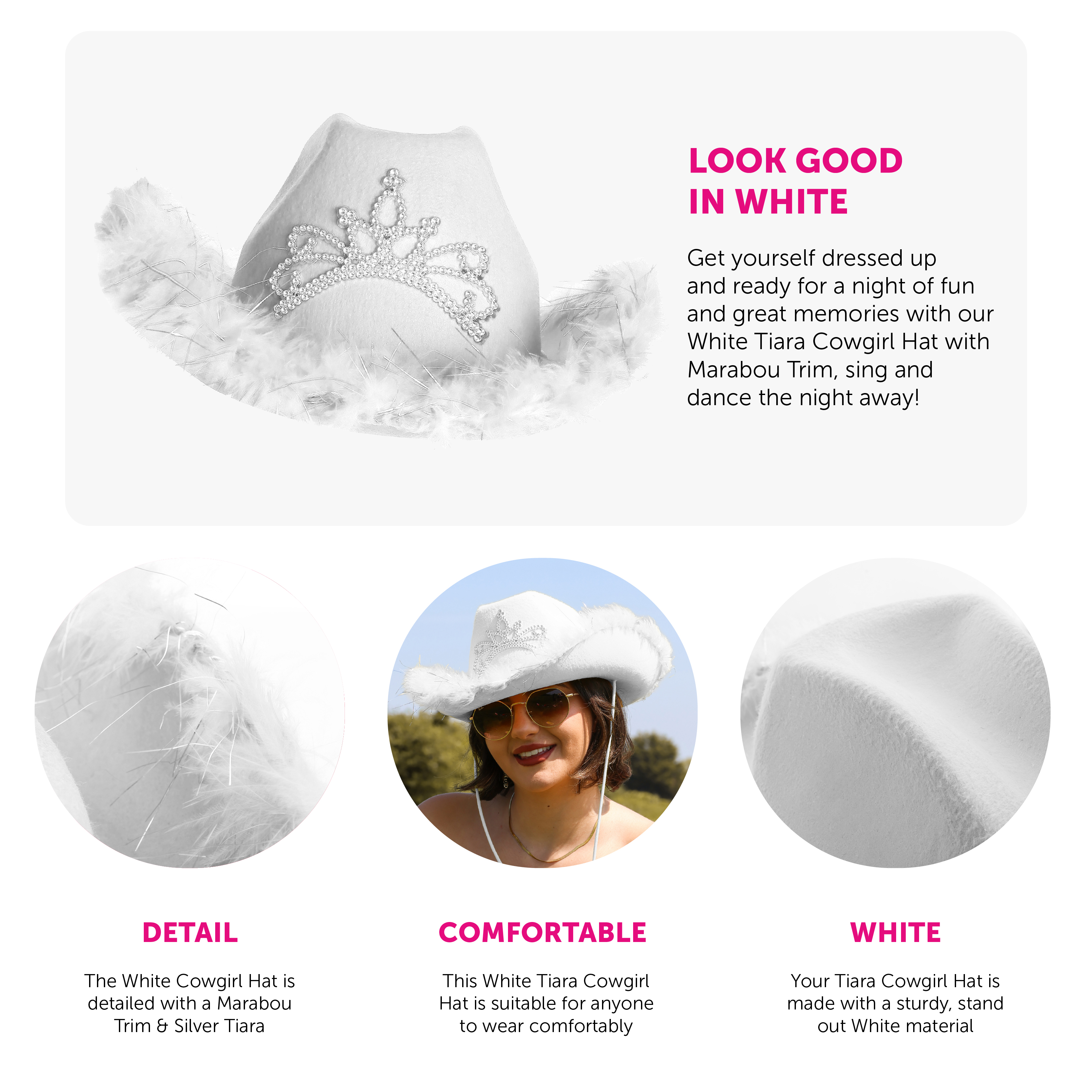 WHITE TIARA COWGIRL HAT WITH MARABOU TRIM: Get yourself dressed up and ready for a night of fun and great memories with our White Tiara Cowgirl Hat with Marabou Trim—sing and dance the night away!