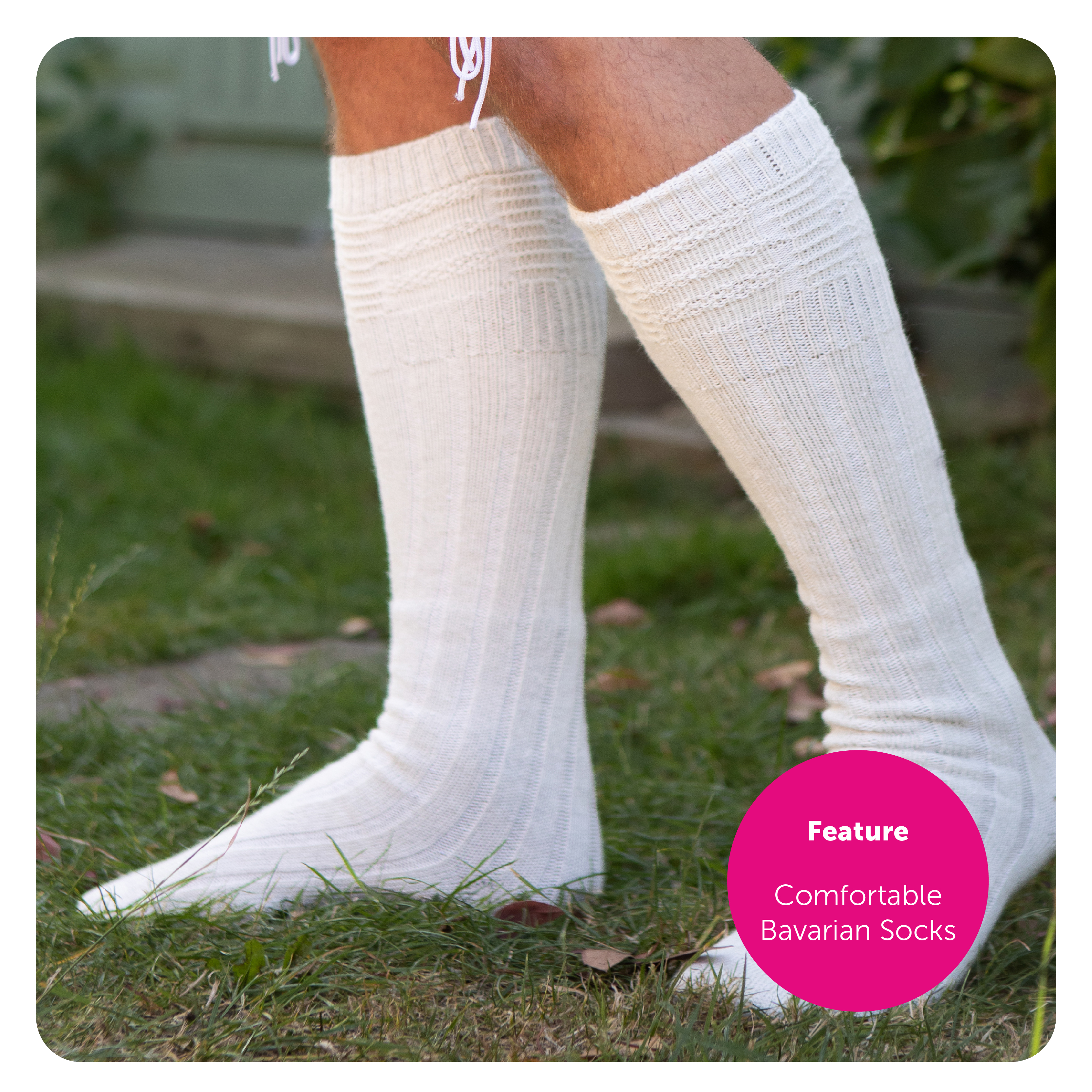 SET INCLUDES: Your Bavarian Set includes a Grey felt, Bavarian Seppel Hat with a Black Feather, Blue and White Rope band, and a White Petal Flower, and a pair of knee high Bavarian Socks, the perfect look for any upcoming Oktoberfest event!
