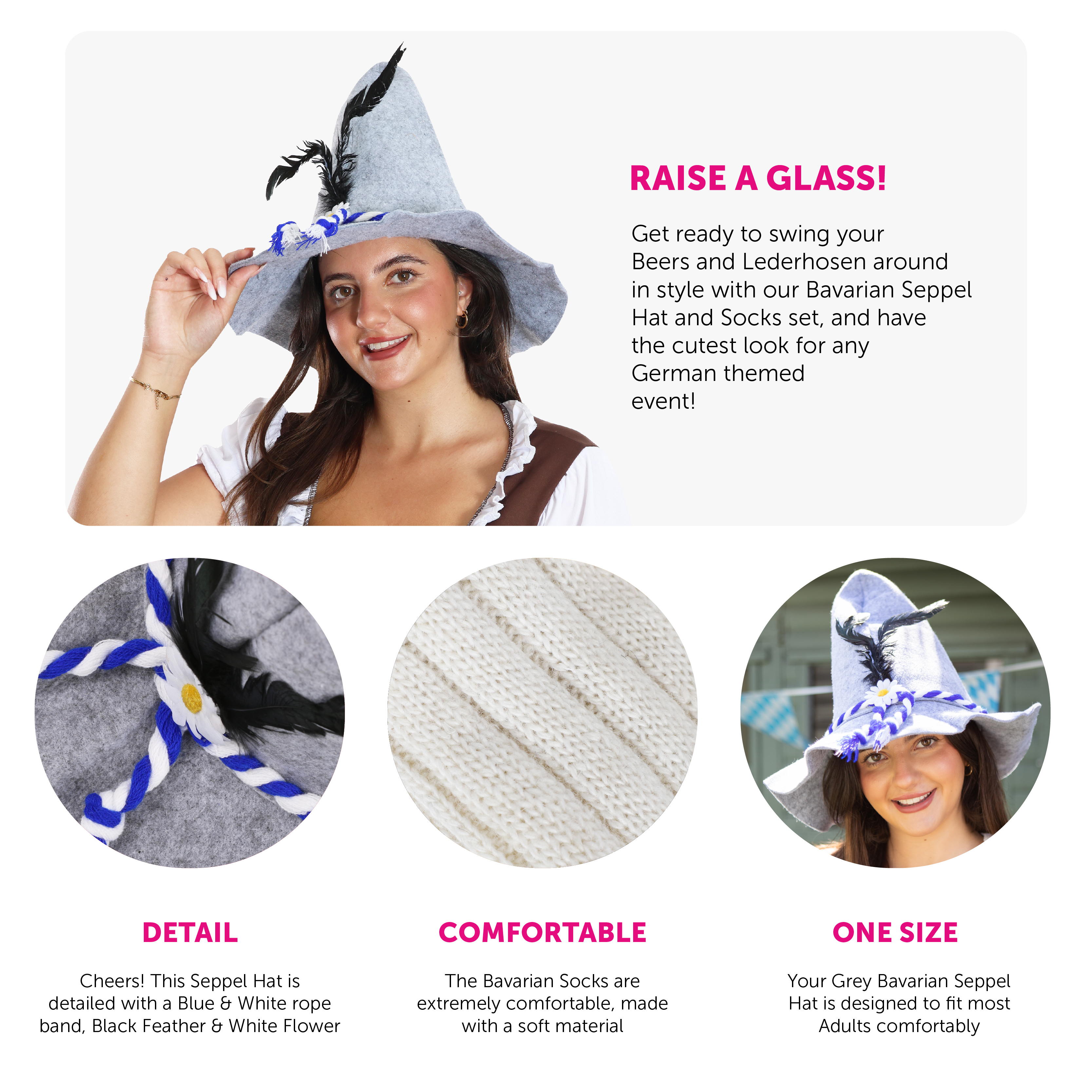 PERFECT FOR OKTOBERFEST & BAVARIAN FANCY DRESS: Whether you’re attending an Oktoberfest event or adding the finishing touches to your Bavarian fancy dress costume, make sure you're equipped with the Grey Bavarian Seppel Hat and Socks set!
