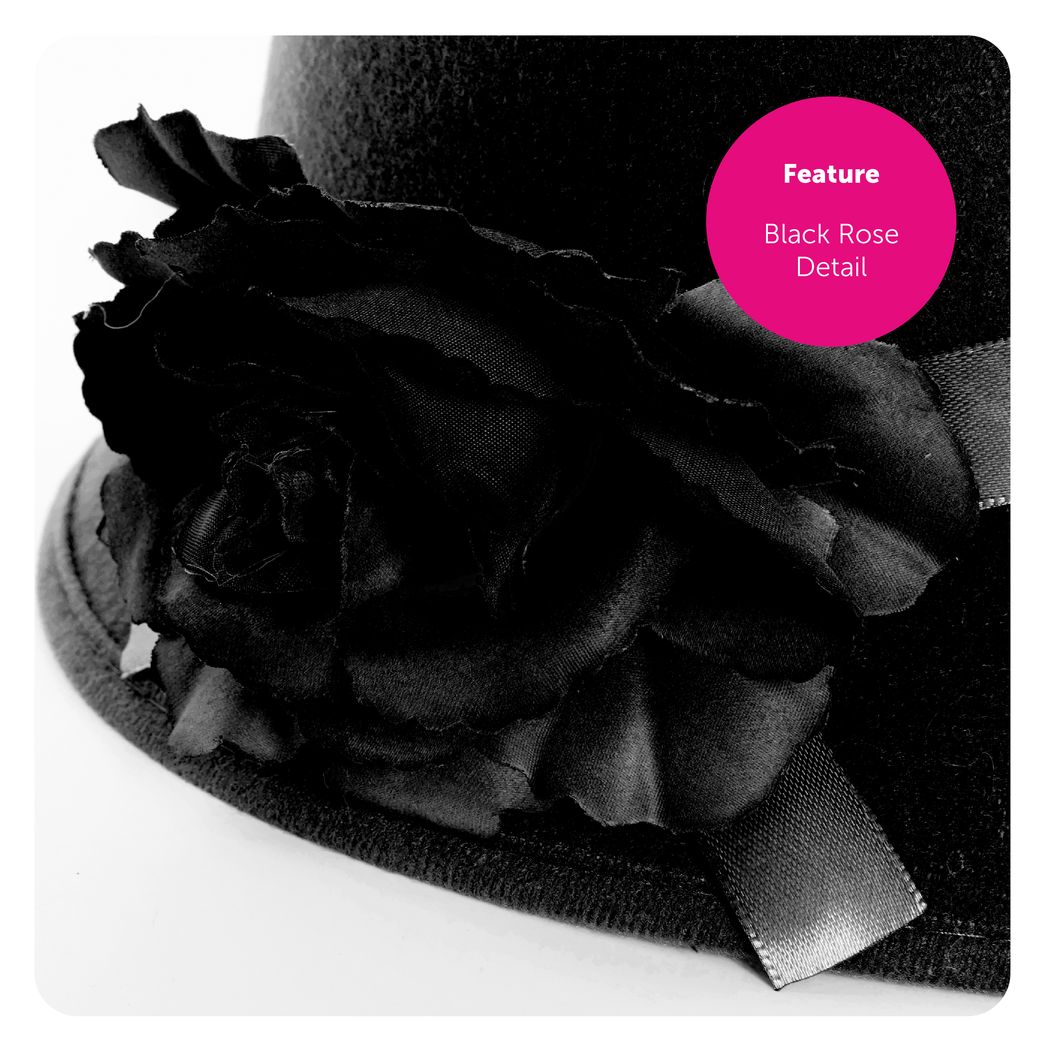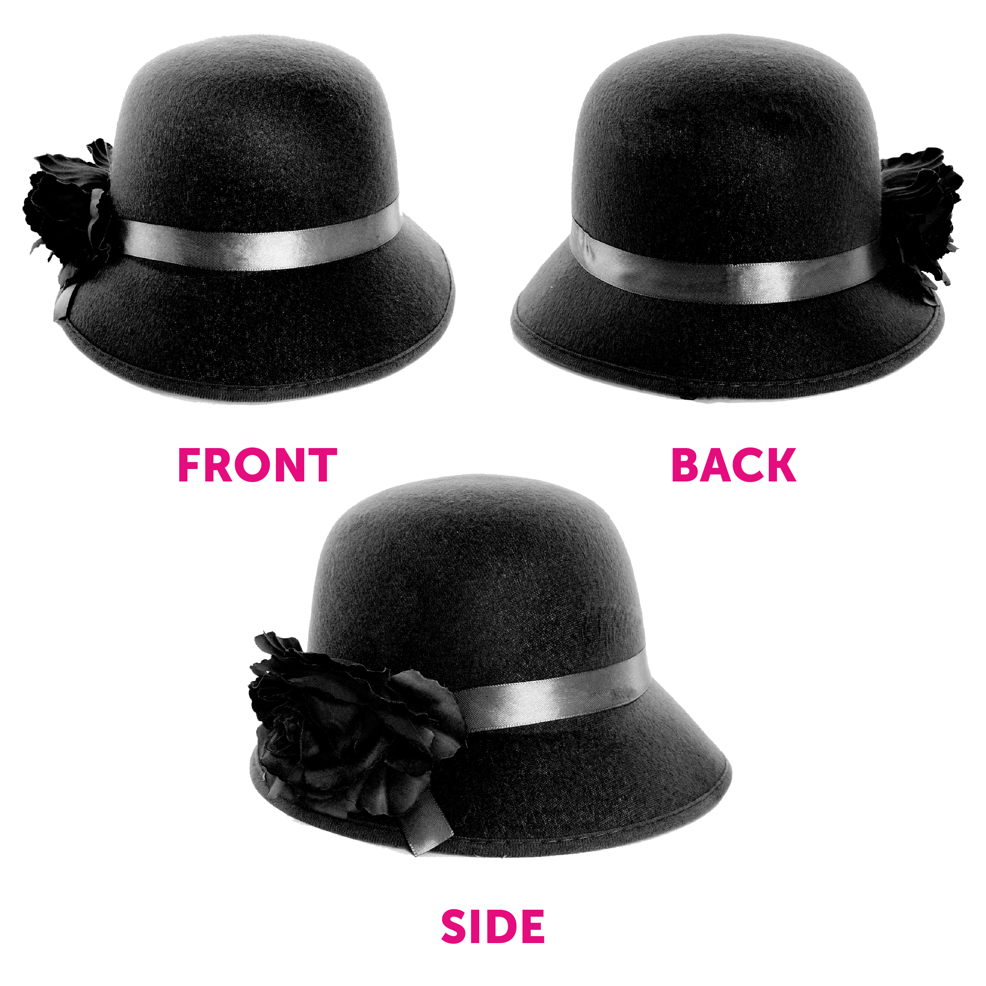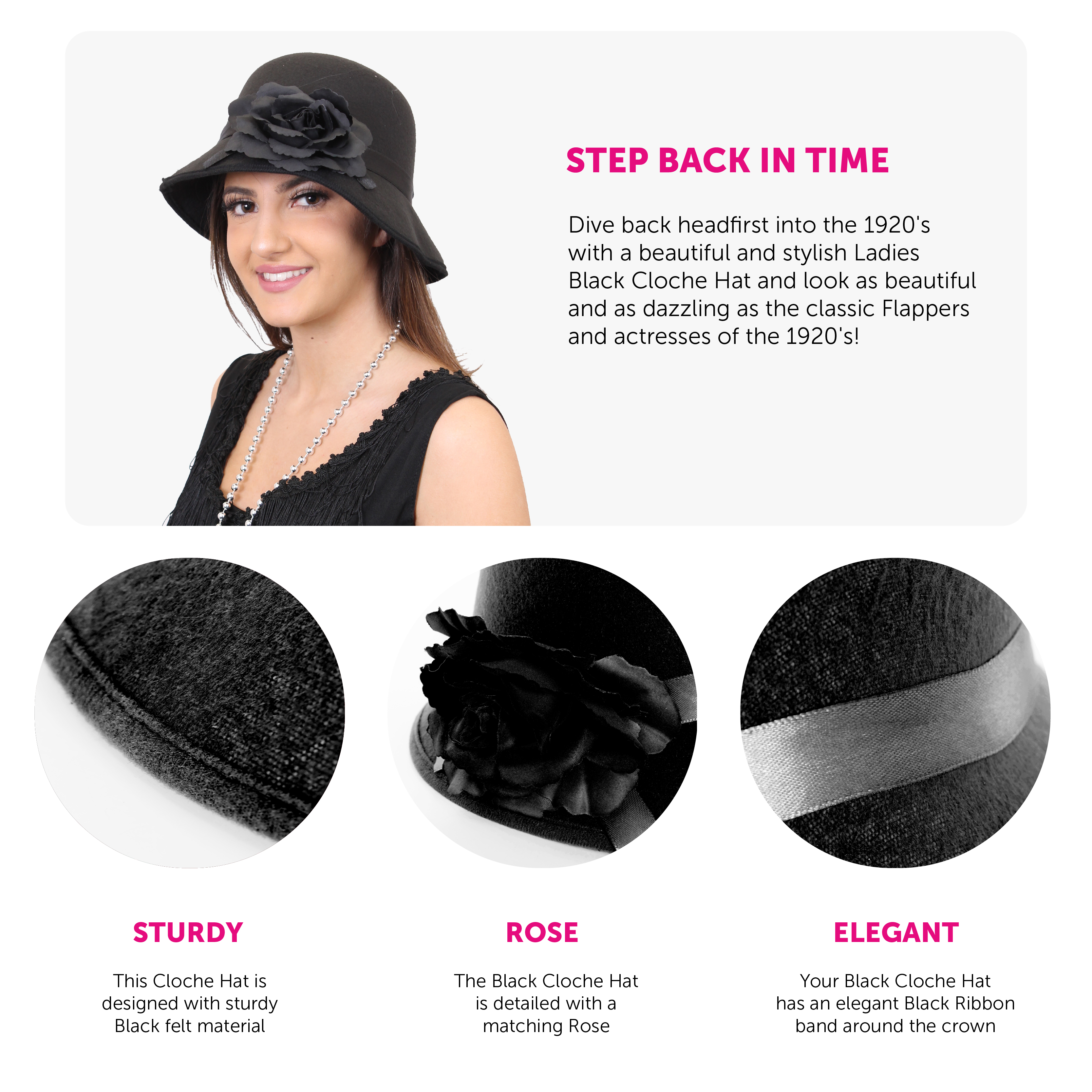 CLOCHE HAT DETAILS: Your Ladies Black Cloche Hat is a classic 1920's styled bell shape hat, with a ribbon adorning the crown of the hat, and complete with a tidy and gorgeous matching Rose to sit perfectly at the base of the hat!
