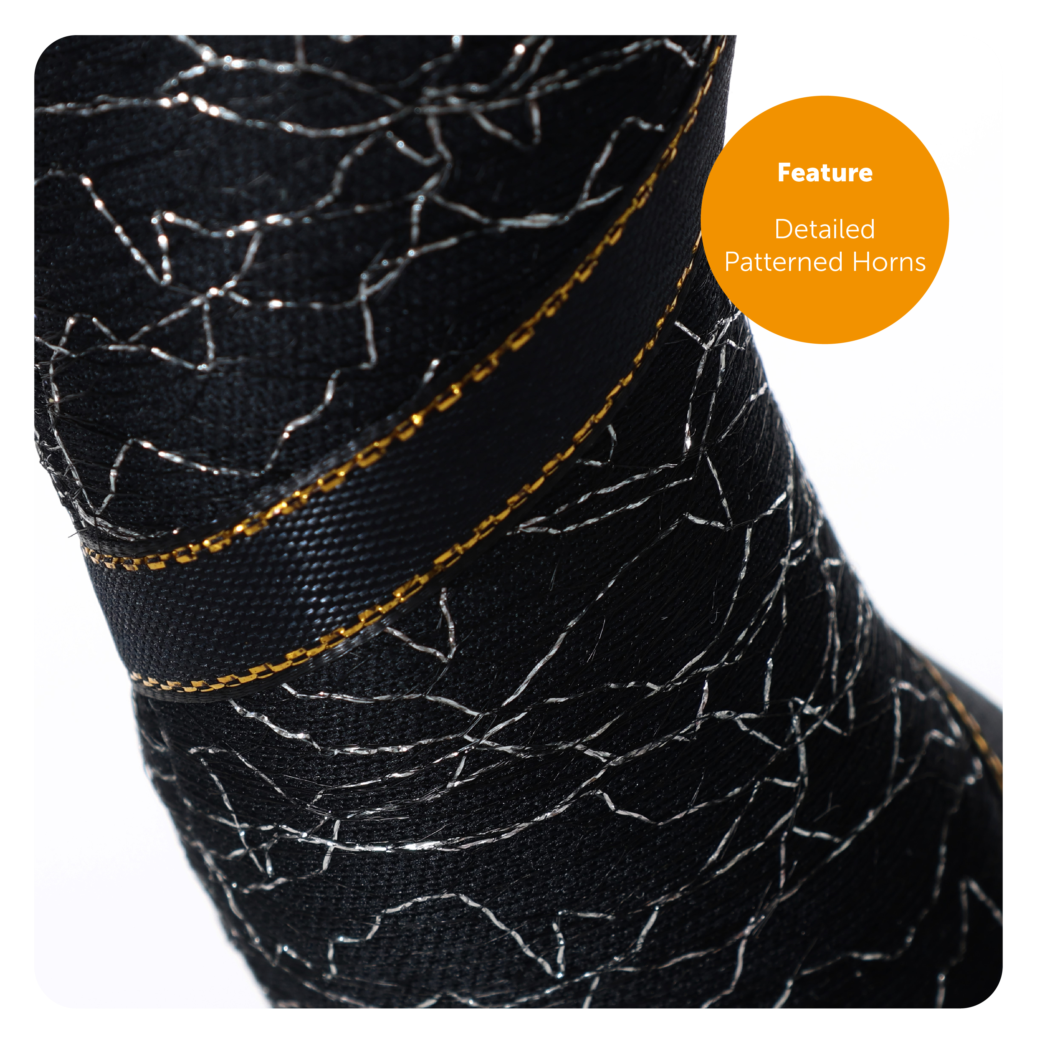 GOTHIC HORNS DETAILS: Your Gothic Black Horns come attached on a black headband for your headpiece to rest easily on your head, with soft black fabric horns with silver veins with black and gold ribbons details for a more flash edge to your look!