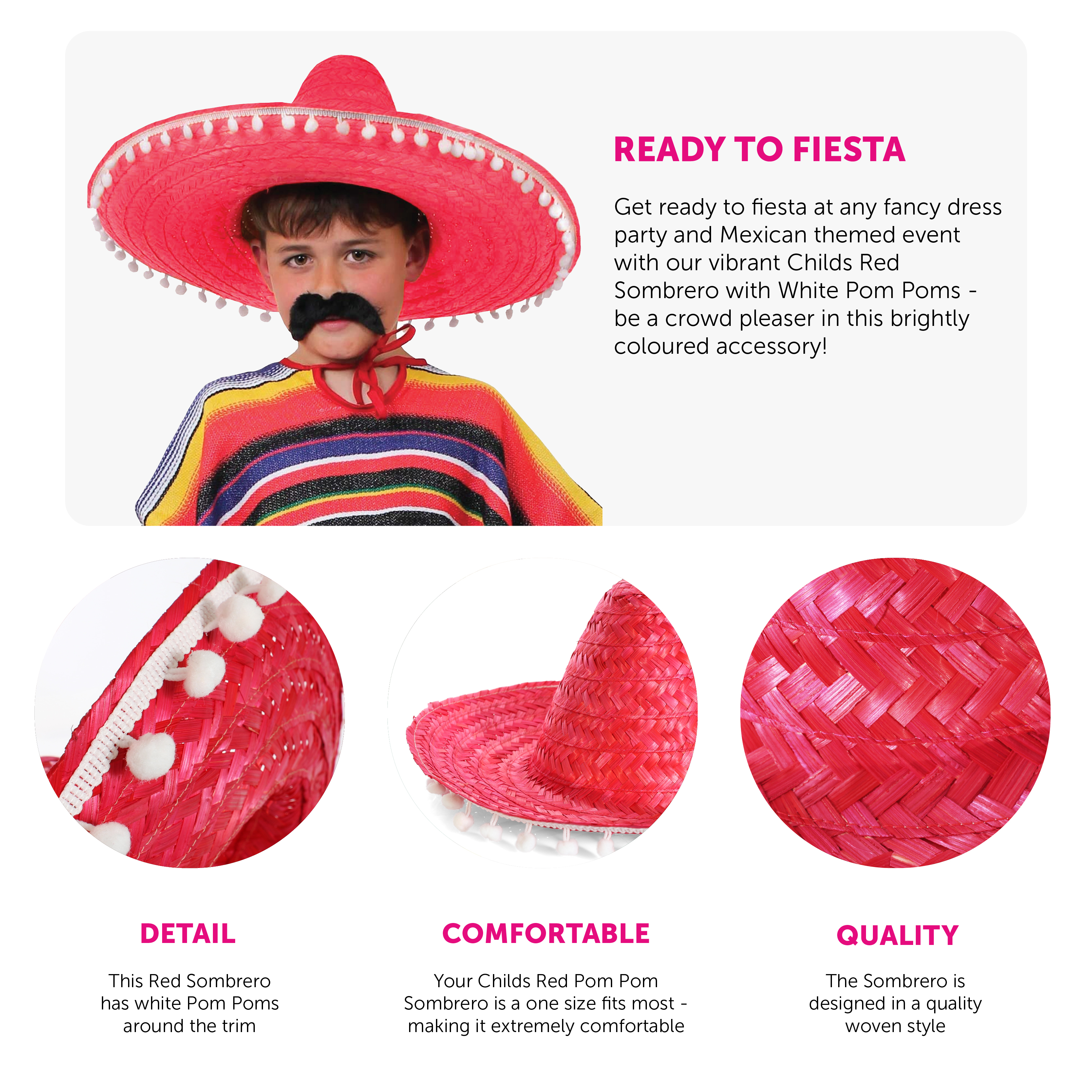 CHILD’S RED POM-POM SOMBRERO HAT: Take the fiesta and life of the party with you wherever you go for your next big event or occasion with our Child’s Red Pom-Pom Sombrero Hat and liven up any party or gathering!