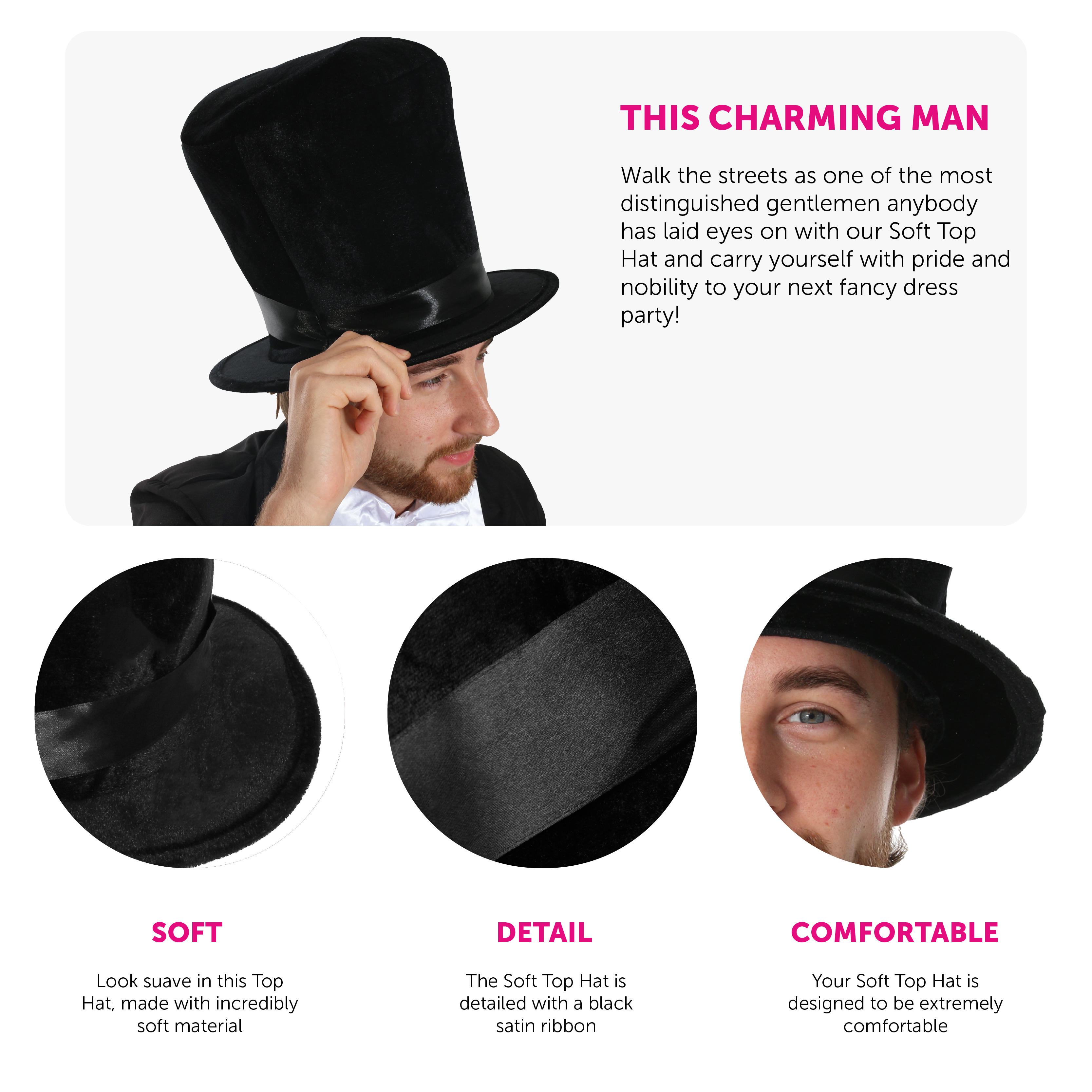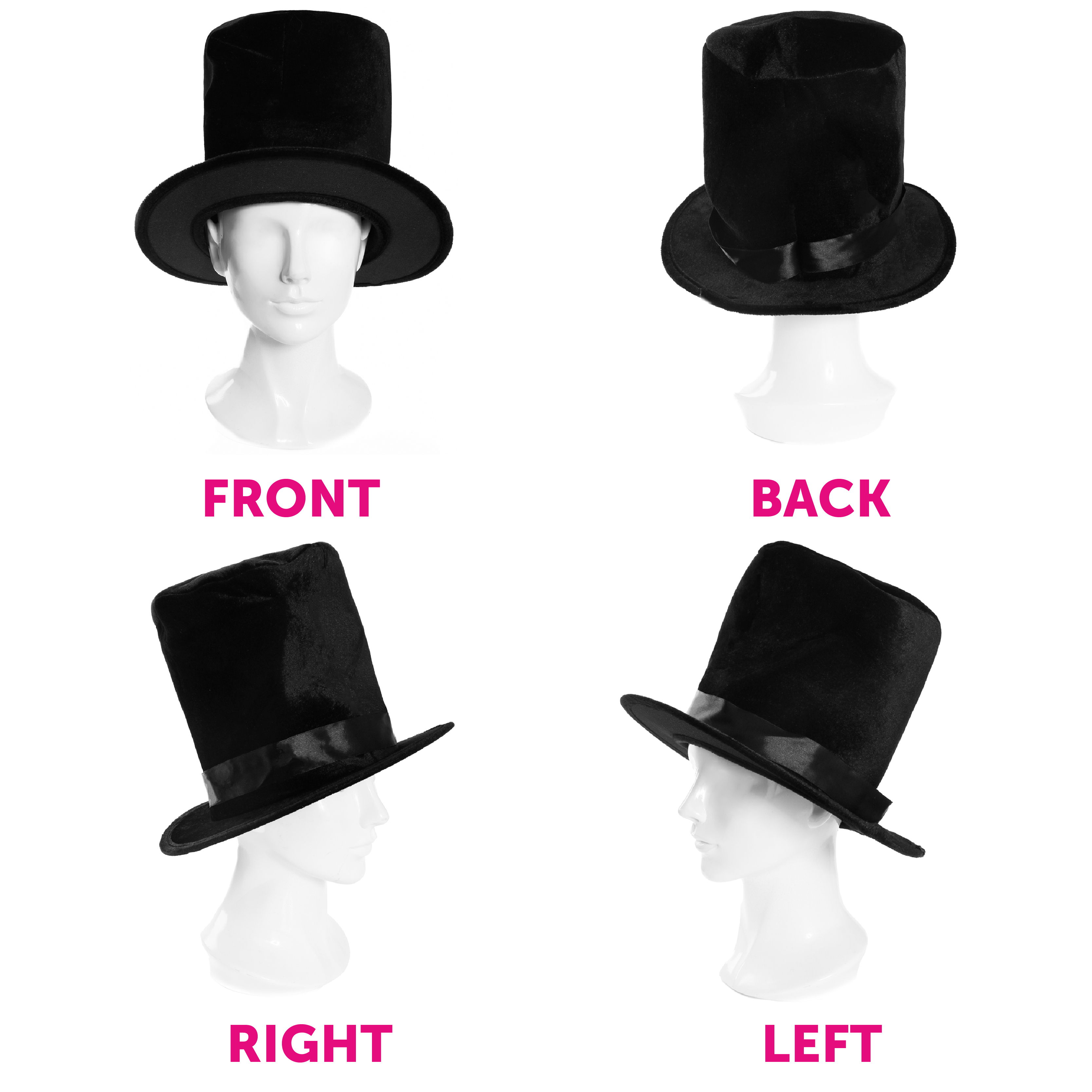 TOP HAT DETAILS: The classic Top Hat design has been brought back to life with a fantastic new style! Your Top Hat is made with a soft and comfortable, Black Velour material, with a Black Satin Band!