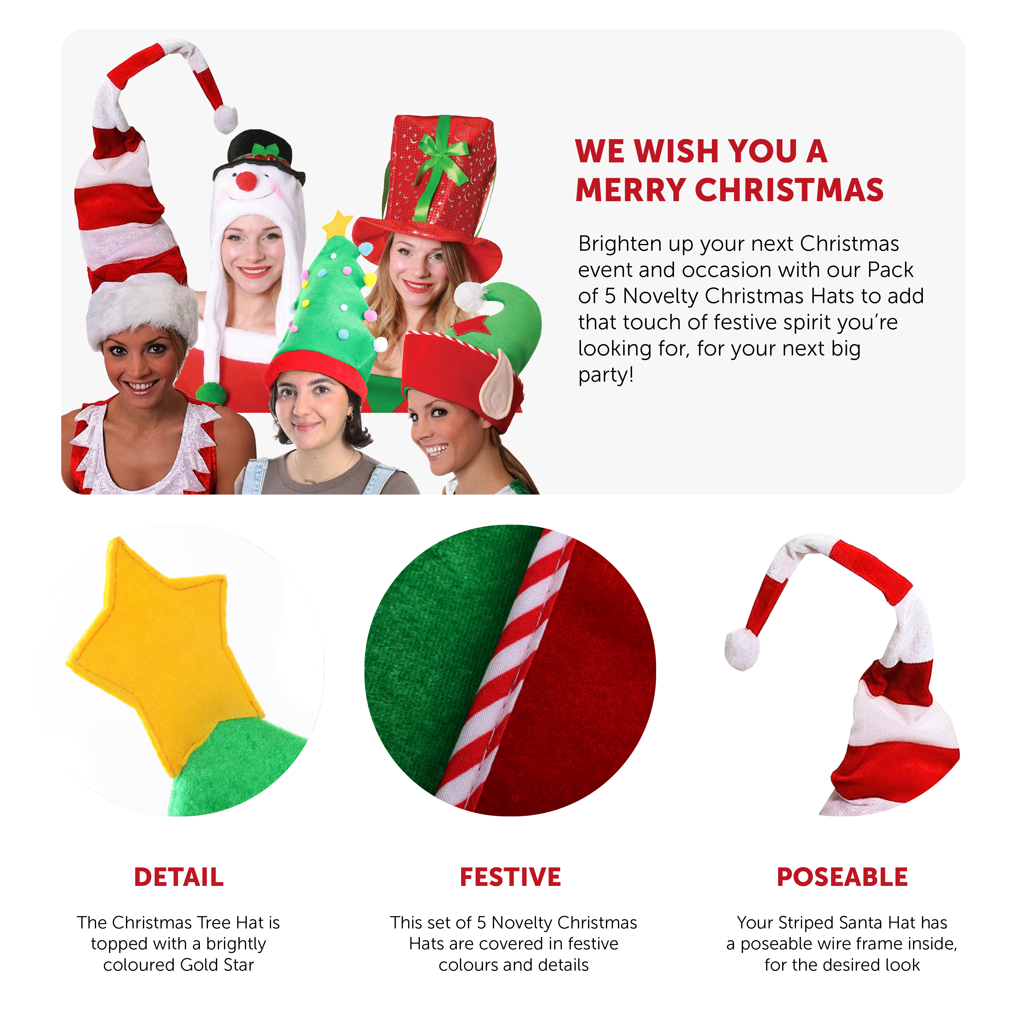 PACK OF 5 NOVELTY CHRISTMAS HAT SET: Brighten up your next Christmas event and occasion with our Pack of 5 Novelty Christmas Hats to add that touch of festive spirit you’re looking for, for your next big party!