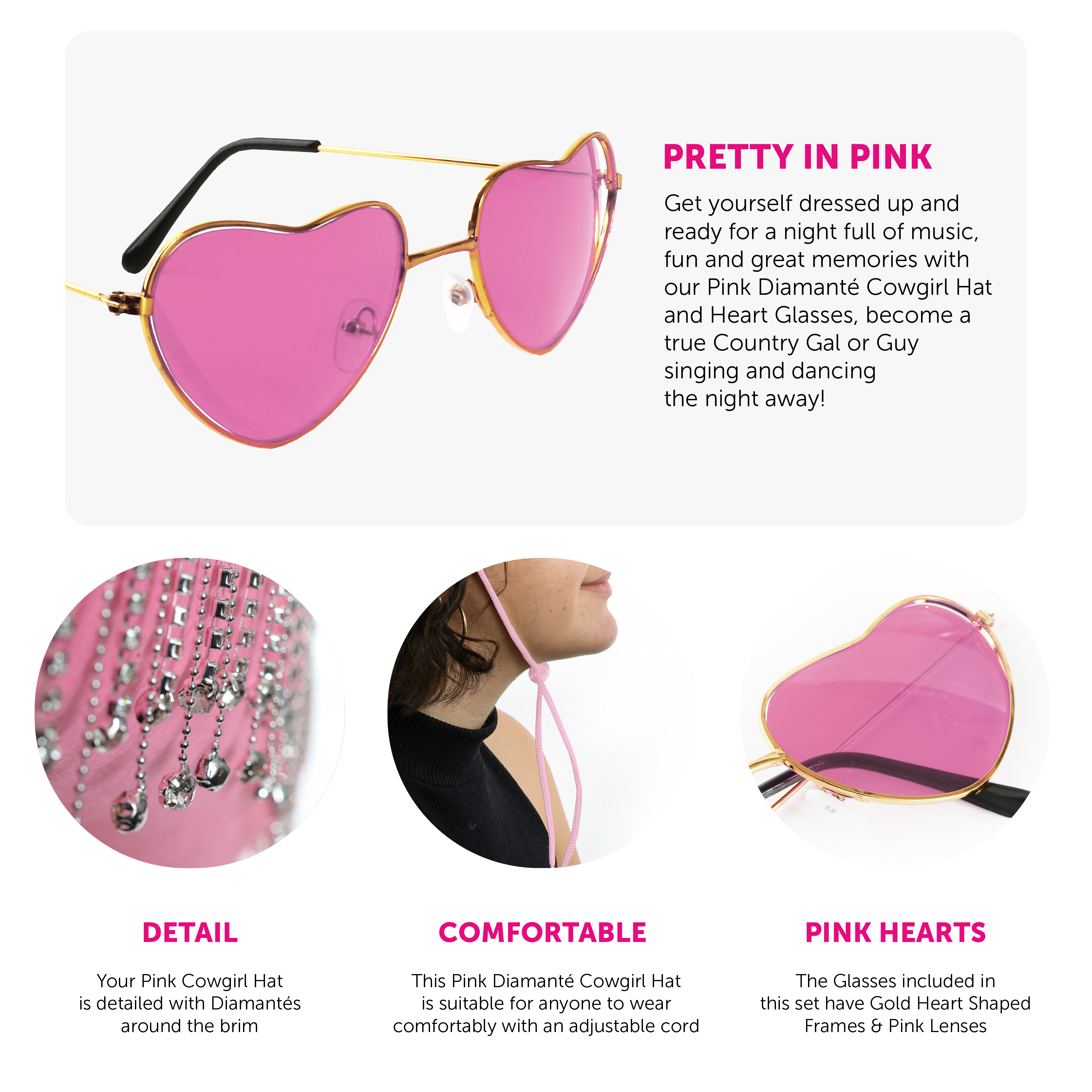 PINK DIAMANTE COWGIRL HAT & HEART GLASSES: Get yourself dressed up and ready for a night full of music, fun and great memories with our Pink Diamanté Cowgirl Hat and Heart Glasses, become a true Country Gal or Guy singing and dancing the night away!