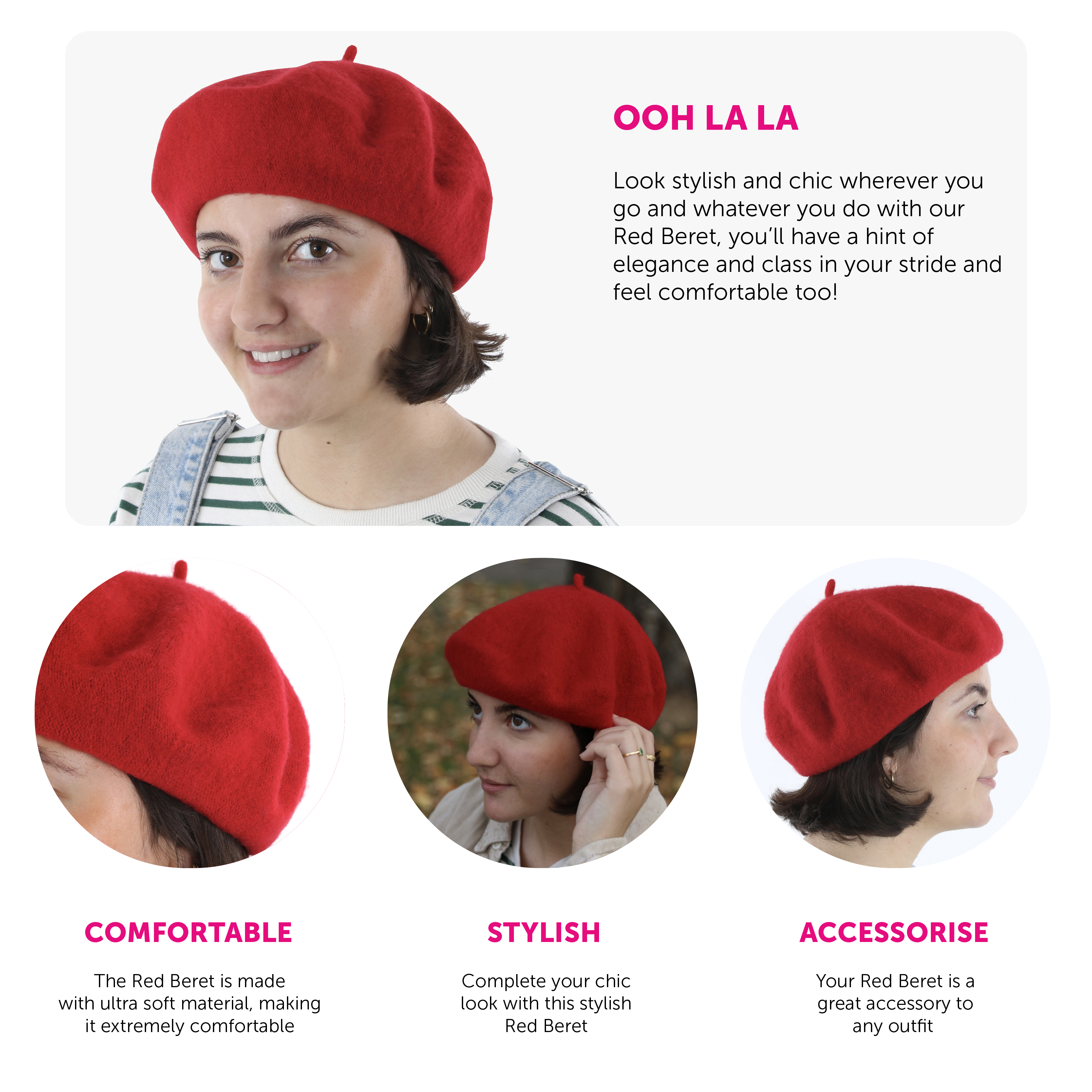 RED BERET HAT: Add a sharp and fashionable feature to your seasonal walks and outings with our Red Beret Hats and raise your outfits style up with this perfect hat fit for all seasons of the year!
