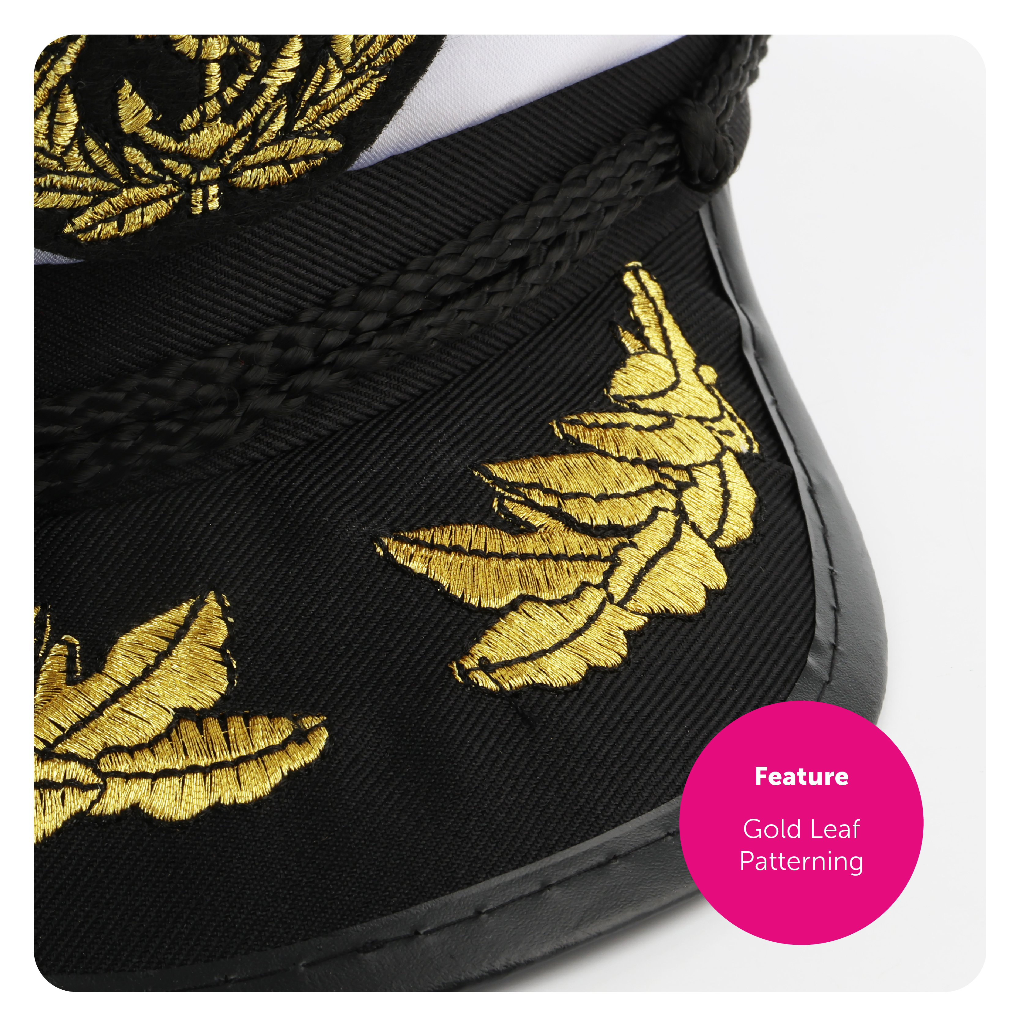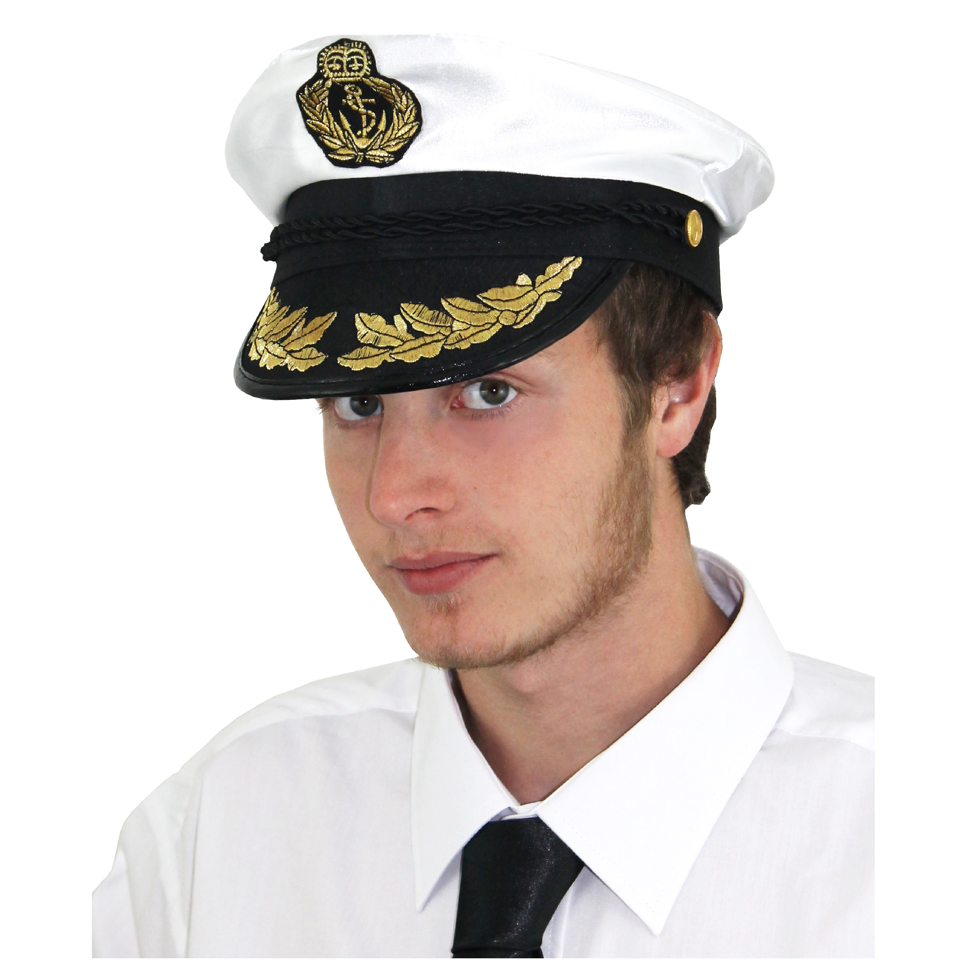 CAPTAIN HAT DETAILS: This Captains Hat is a White Satin Hat with a Black Visor, Black Braiding detail, a Navy Style Motif on the front and Gold detailing, the perfect addition to any Costume!
