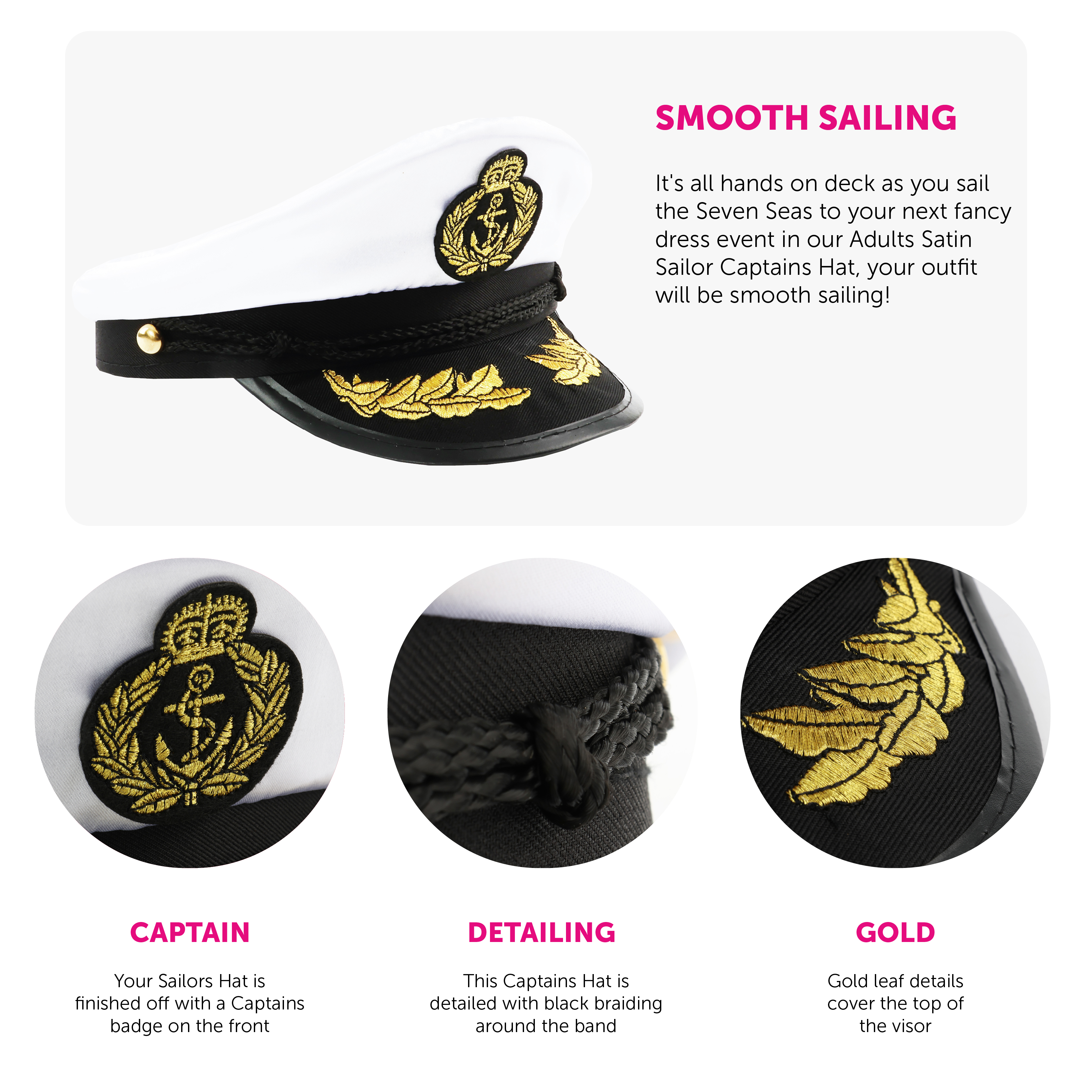 ADULTS SATIN SAILOR CAPTAIN HAT: It's all hands on deck as you sail the Seven Seas to your next fancy dress event in our Adults Satin Sailor Captains Hat, your outfit will be smooth sailing!