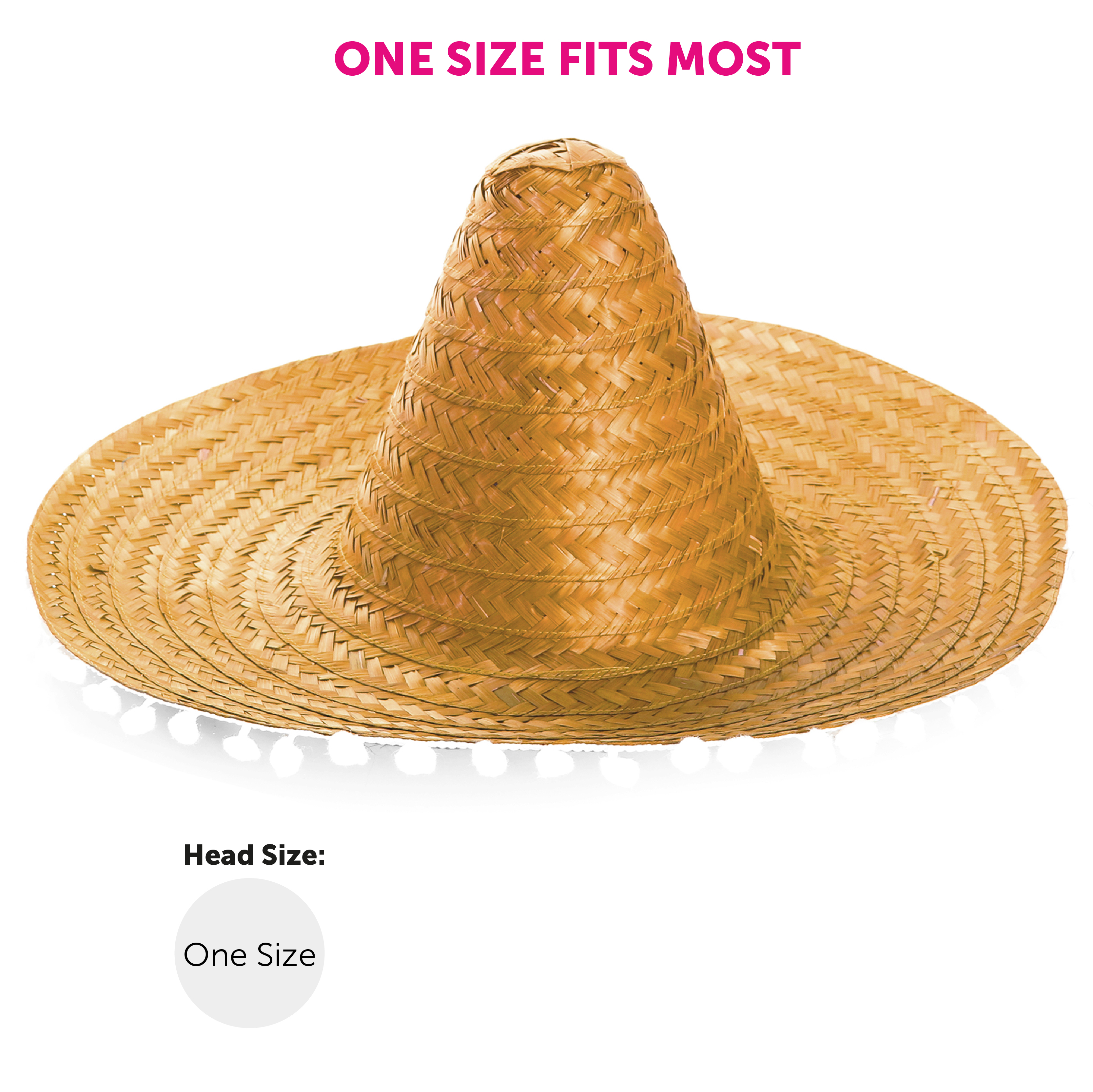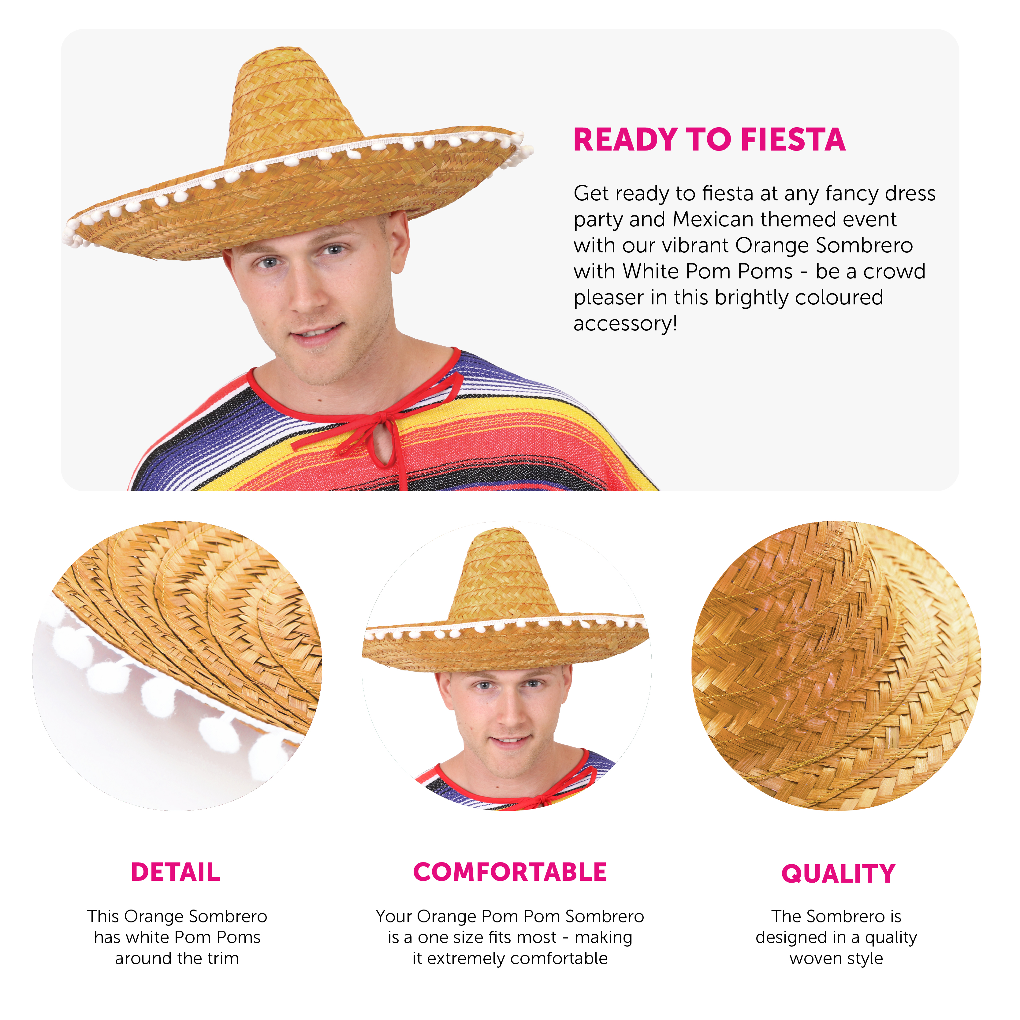 ORANGE POM-POM SOMBRERO HAT: Take the fiesta and life of the party with you wherever you go for your next big event or occasion with our Orange Pom-Pom Sombrero Hat and liven up any party or gathering! AVAILABLE IN MULTIPLE PACKS: Your Orange Pom-Pom Sombrero Hats are available in multiple packs, from Single, Packs of 3, Packs of 6, and Packs of 12 to share amongst your friends and family! ONE SIZE FITS MOST: Being a very comfortable size for all adults having a very well-rounded size, this Orange Sombrero Hat is wearable for most if not all adults, measuring in at 58cm (23") for head space, this is the perfect hat to wear for a fun night! GREAT QUALITY HAT: Not only being a great-looking authentically made Sombrero Hat, but it is made with a strong and sturdy base, Pom-Pom details on the brimming, and made from a fantastic, Embroidered material that you can reuse over and over again! PERFECT FOR ANY FANCY DRESS PARTY: Whether it be a Mexican-themed party, a night out with some friends, or even just a fun accessory, you’ll be sure to get some nights of fun out of your Orange Pom-Pom Sombrero Hat!