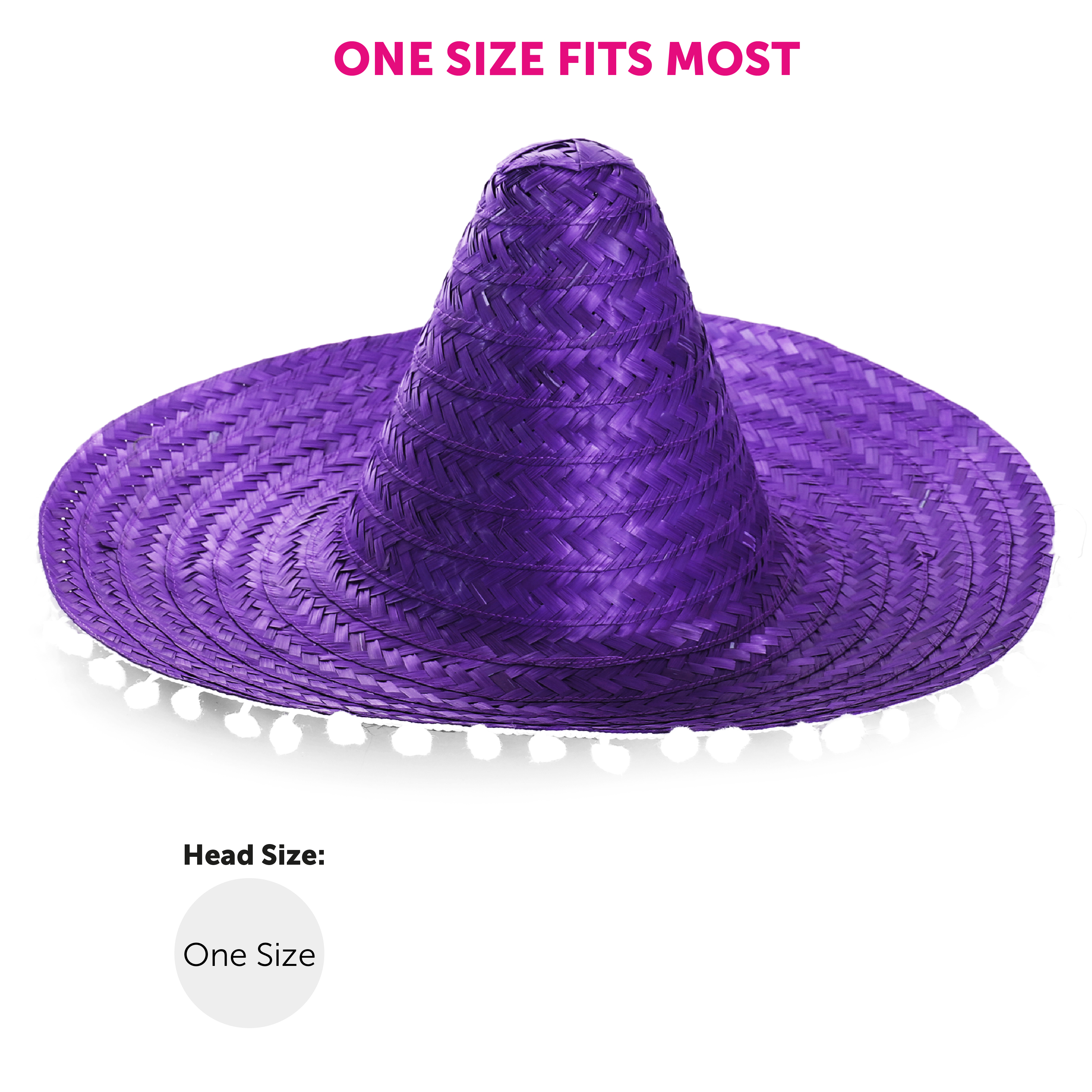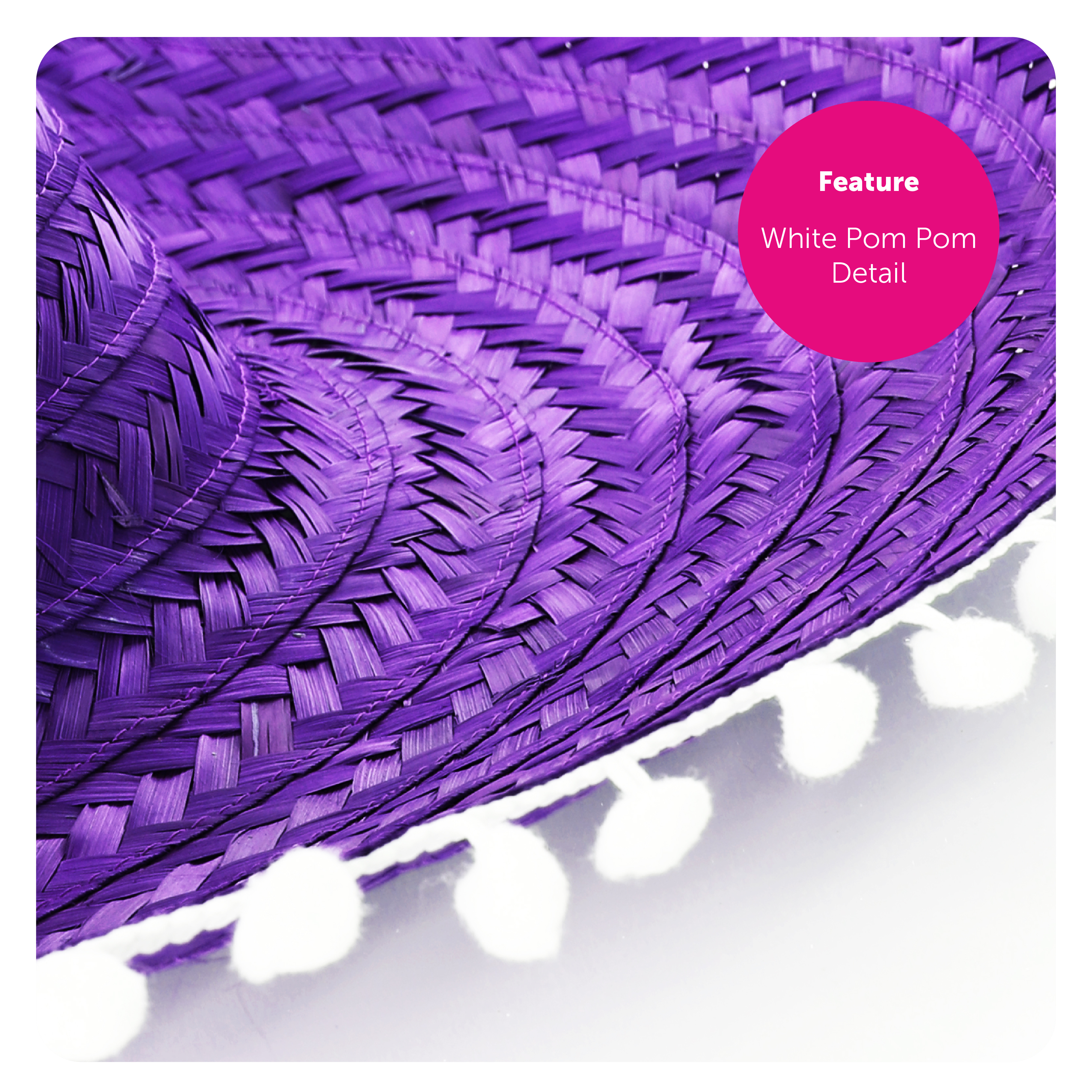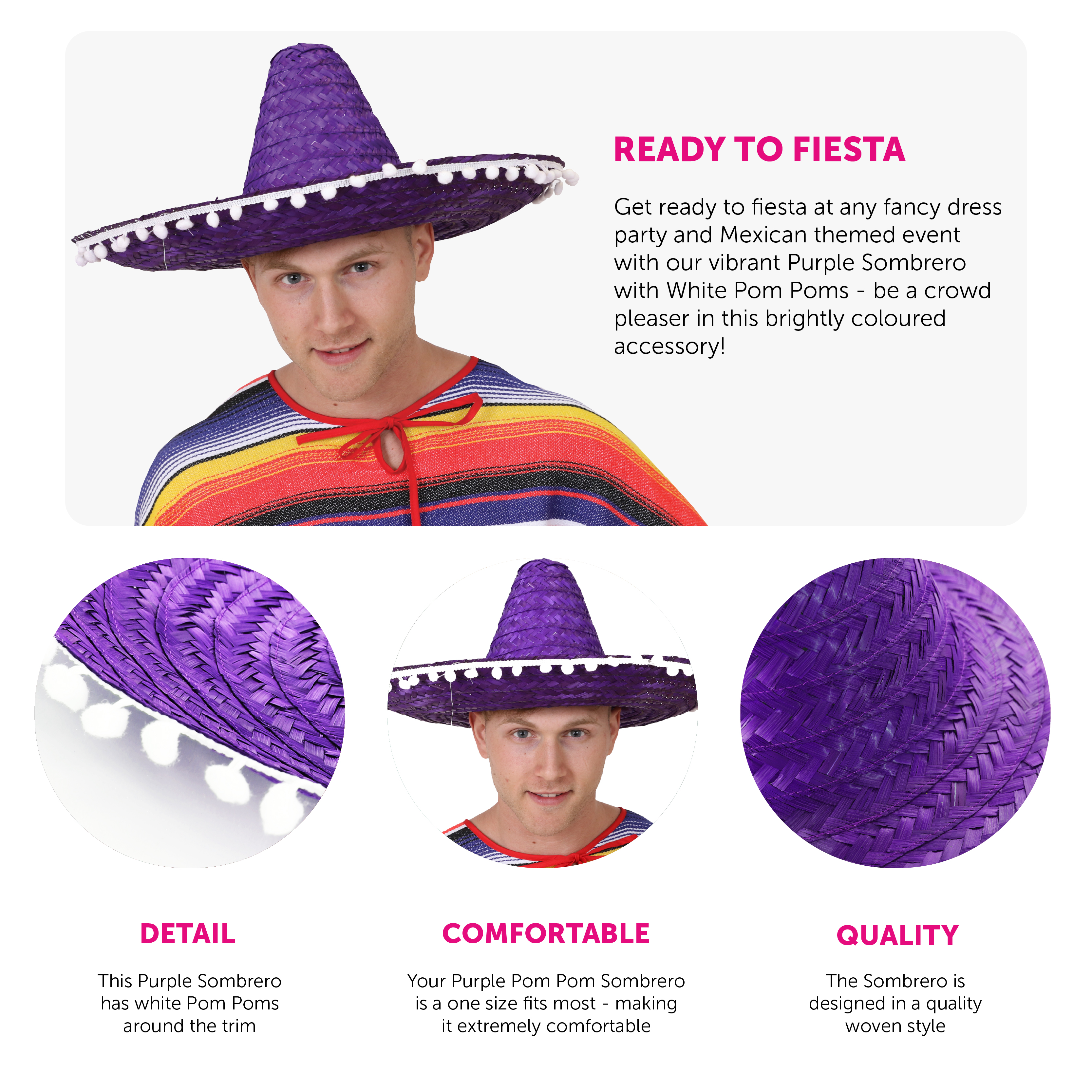 PURPLE POM-POM SOMBRERO HAT: Take the fiesta and life of the party with you wherever you go for your next big event or occasion with our Purple Pom-Pom Sombrero Hat and liven up any party or gathering! AVAILABLE IN MULTIPLE PACKS: Your Purple Pom-Pom Sombrero Hats are available in multiple packs, from Single, Packs of 3, Packs of 6, and Packs of 12 to share amongst your friends and family! ONE SIZE FITS MOST: Being a very comfortable size for all adults having a very well-rounded size, this Purple Sombrero Hat is wearable for most if not all adults, measuring in at 58cm (23") for head space, this is the perfect hat to wear for a fun night! GREAT QUALITY HAT: Not only being a great-looking authentically made Sombrero Hat, but it is made with a strong and sturdy base, Pom-Pom details on the brimming, and made from a fantastic, Embroidered material that you can reuse over and over again! PERFECT FOR ANY FANCY DRESS PARTY: Whether it be a Mexican-themed party, a night out with some friends, or even just a fun accessory, you’ll be sure to get some nights of fun out of your Purple Pom-Pom Sombrero Hat!