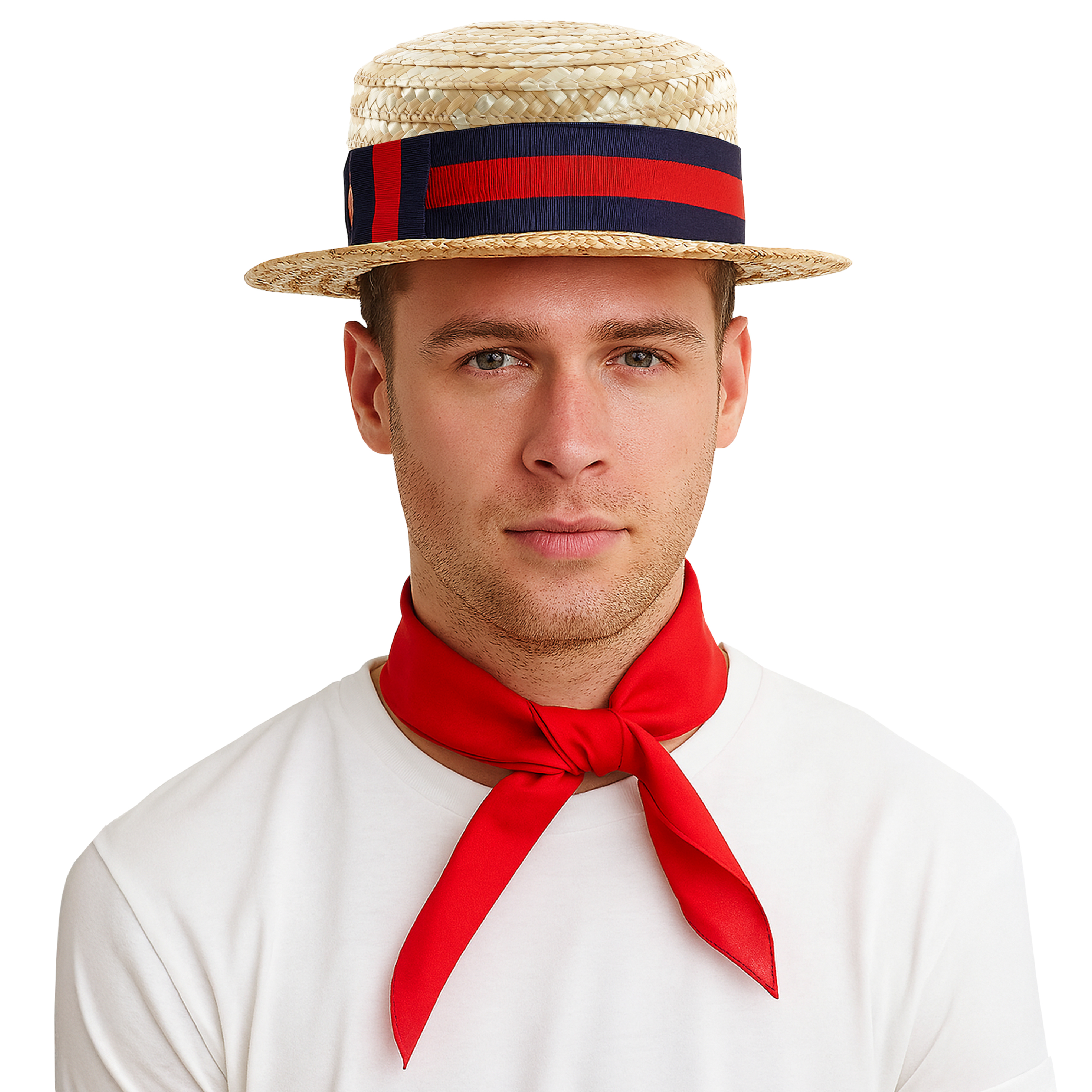 Straw Boater Hat with Blue & Red Ribbon + Red Bandana Neck Tie – Vintage Costume Accessory Set for Adults £7.99