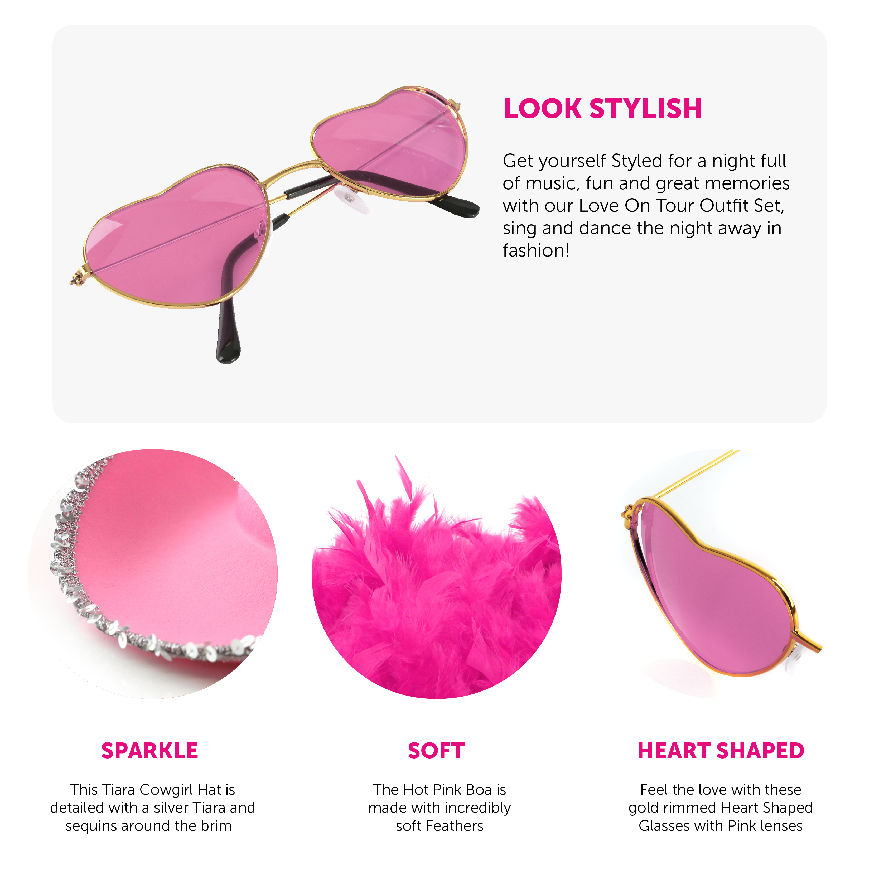 COSTUME SET INCLUDES: This Love On Tour Costume Set includes a Pink Cowboy Hat with a Silver Tiara Design on the front and an adjustable string, a soft Purple Feather Boa and a pair of Heart Shaped Glasses with Pink Lenses!