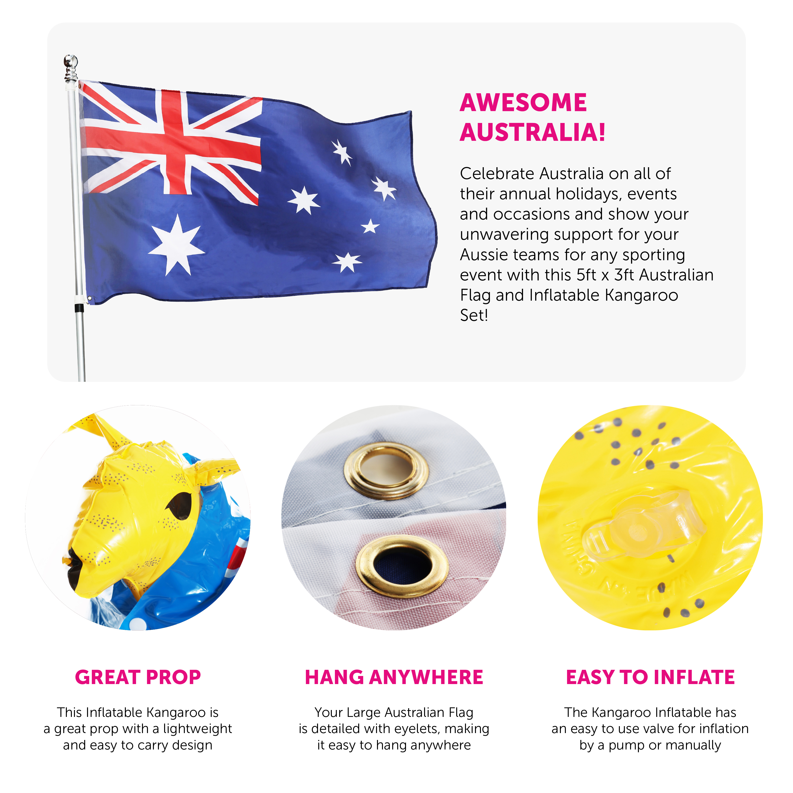 SET INCLUDES: Your Australian Set includes a 5ft x 3ft Australian Flag with eyelet holes for easy hanging, and a Yellow Inflatable Kangaroo with an Australian Flag Cape on its back, the perfect set for all Australian events!