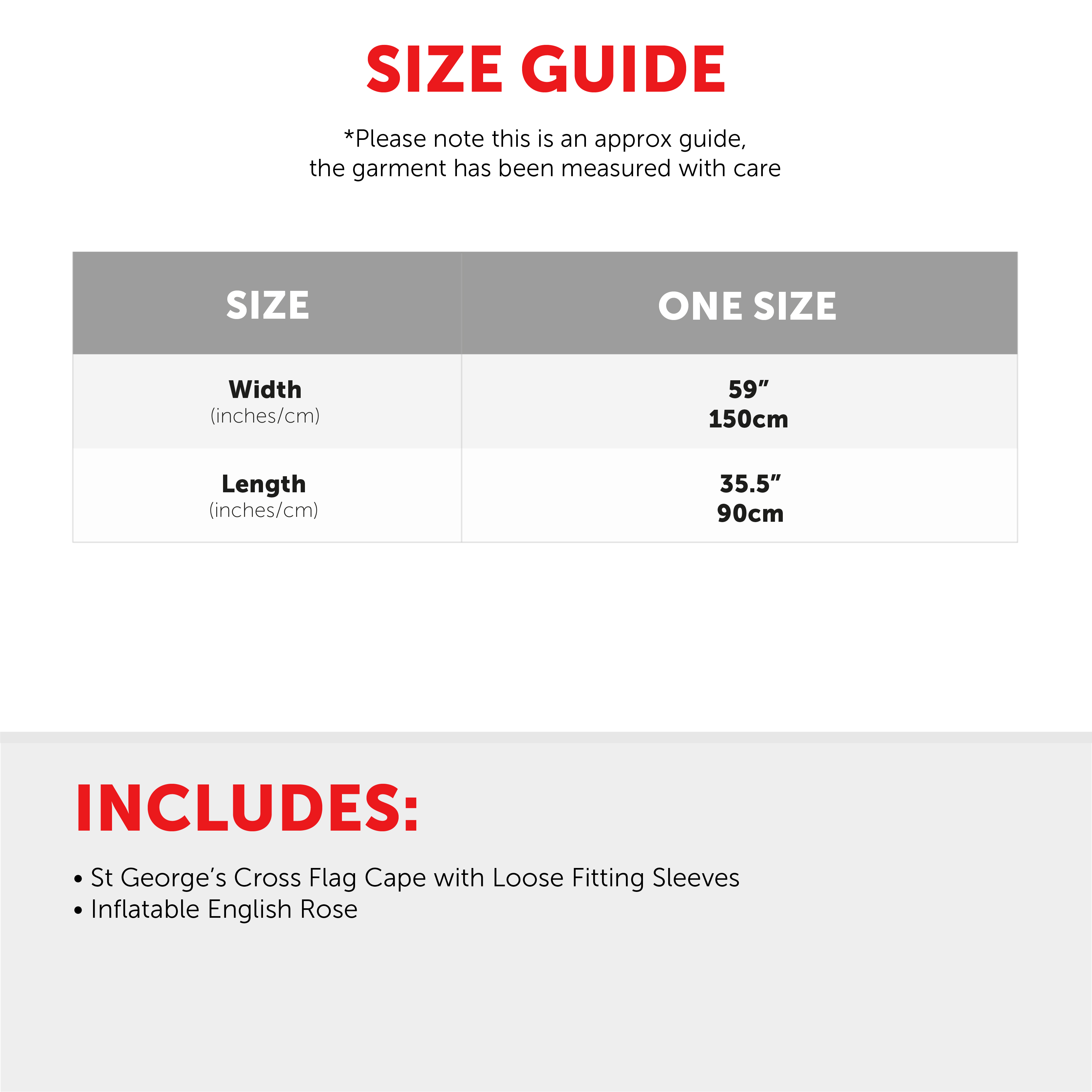 SET INCLUDES: This English Set includes an easy to inflate Rose with a long Green Stem with 'ENGLAND' printed in White on the side, and vibrant Red Rose Petals at the end, and a large English Flag Cape with the St George's Cross and loose fitting sleeves, the perfect look for any English celebration!