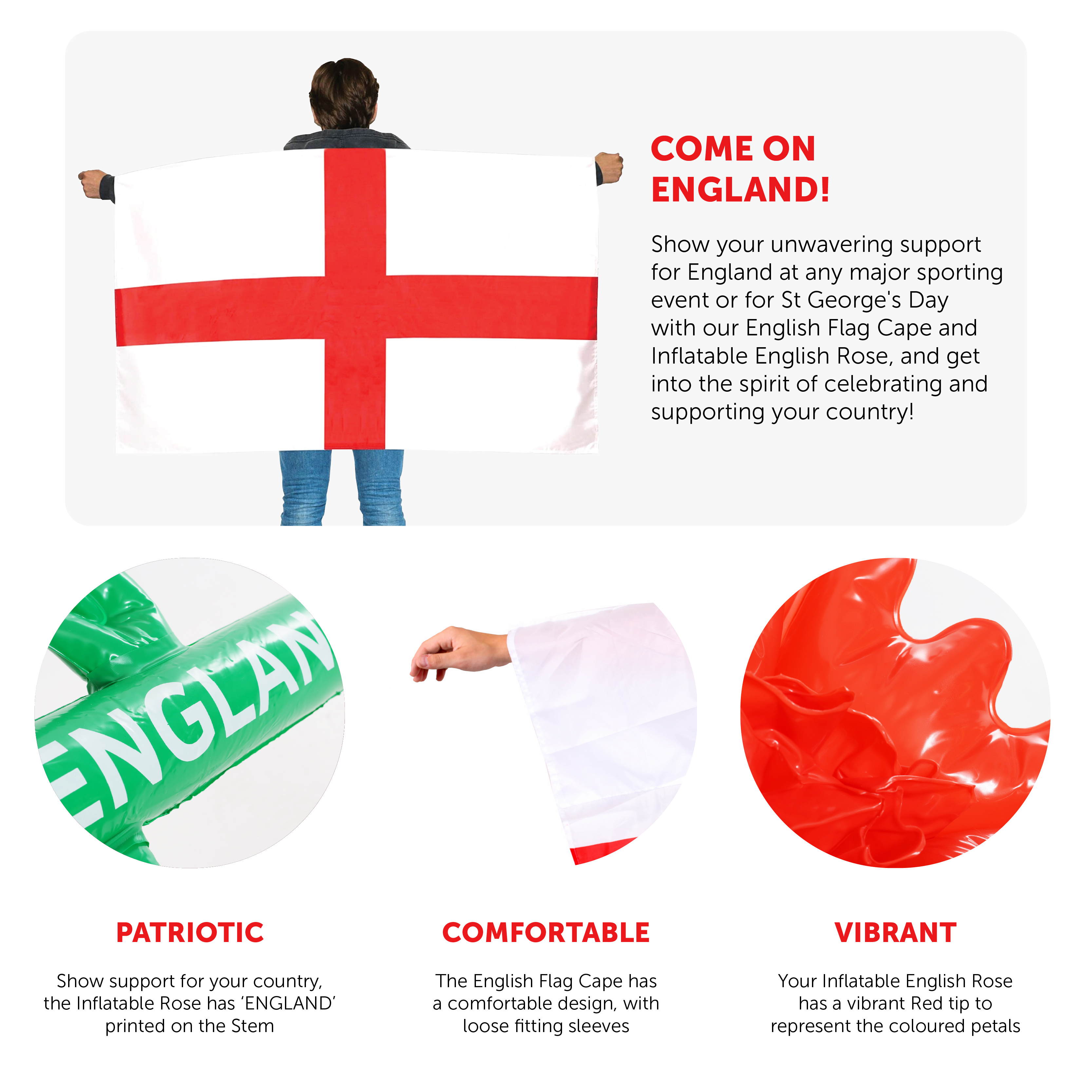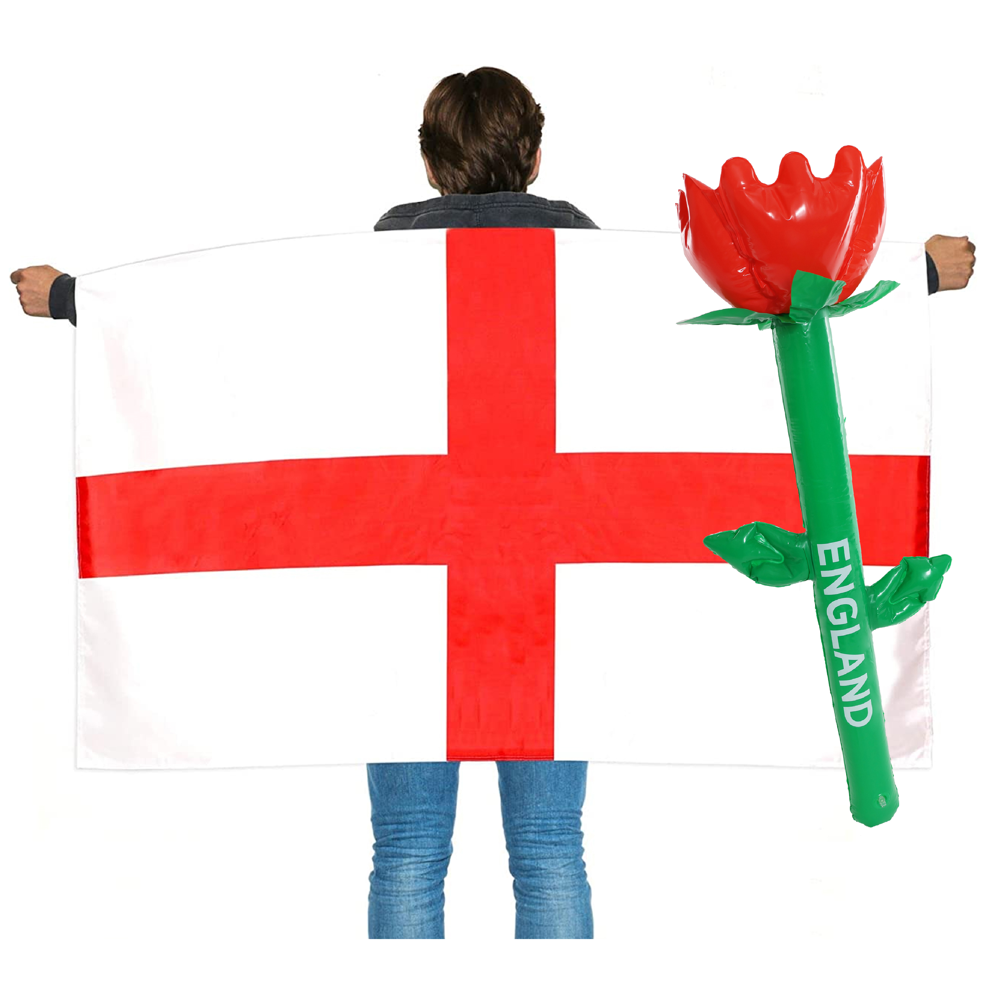ENGLISH FLAG CAPE & INFLATABLE ENGLISH ROSE: Show your unwavering support for England at any major sporting event or for St George's Day with our English Flag Cape and Inflatable English Rose, and get into the spirit of celebrating and supporting your country!