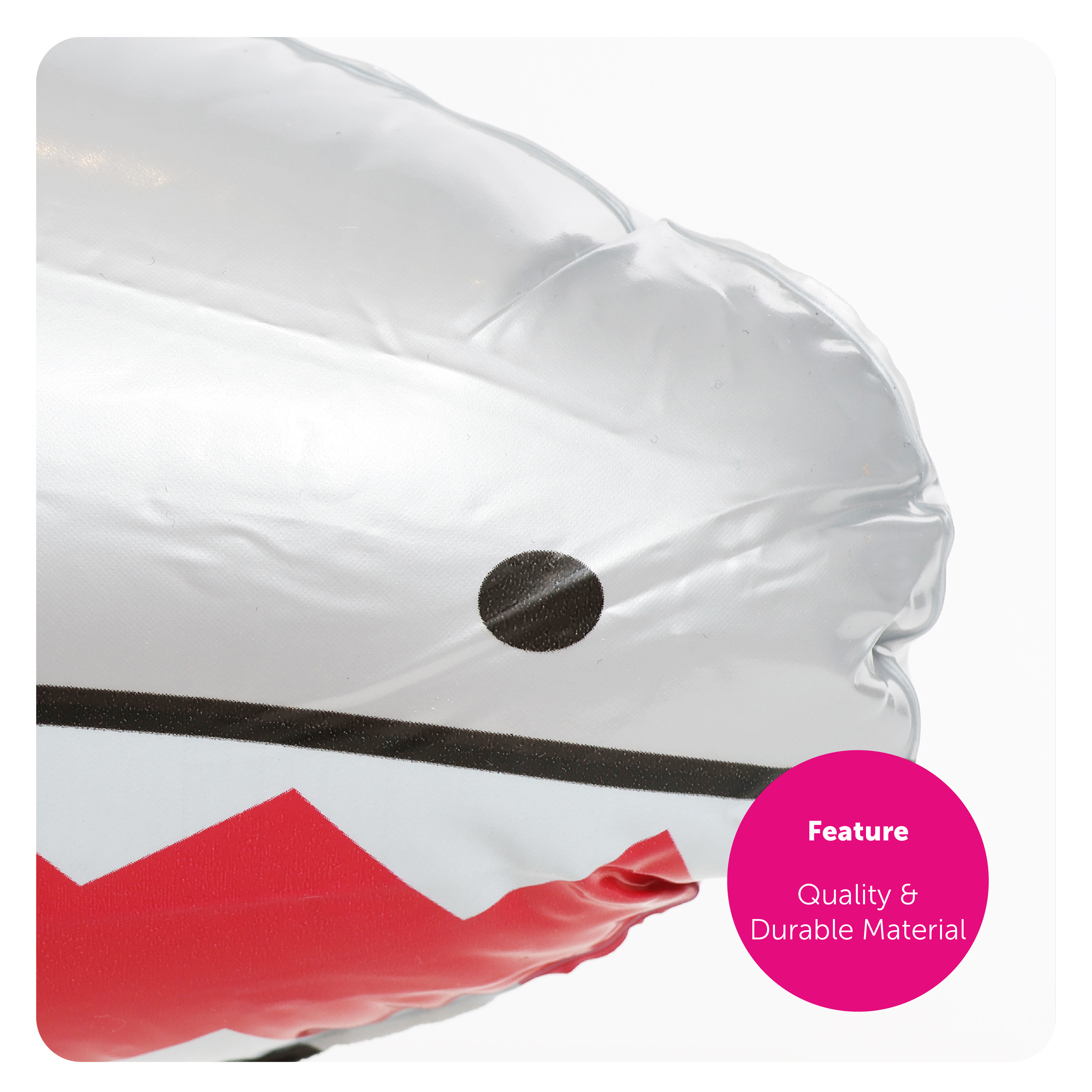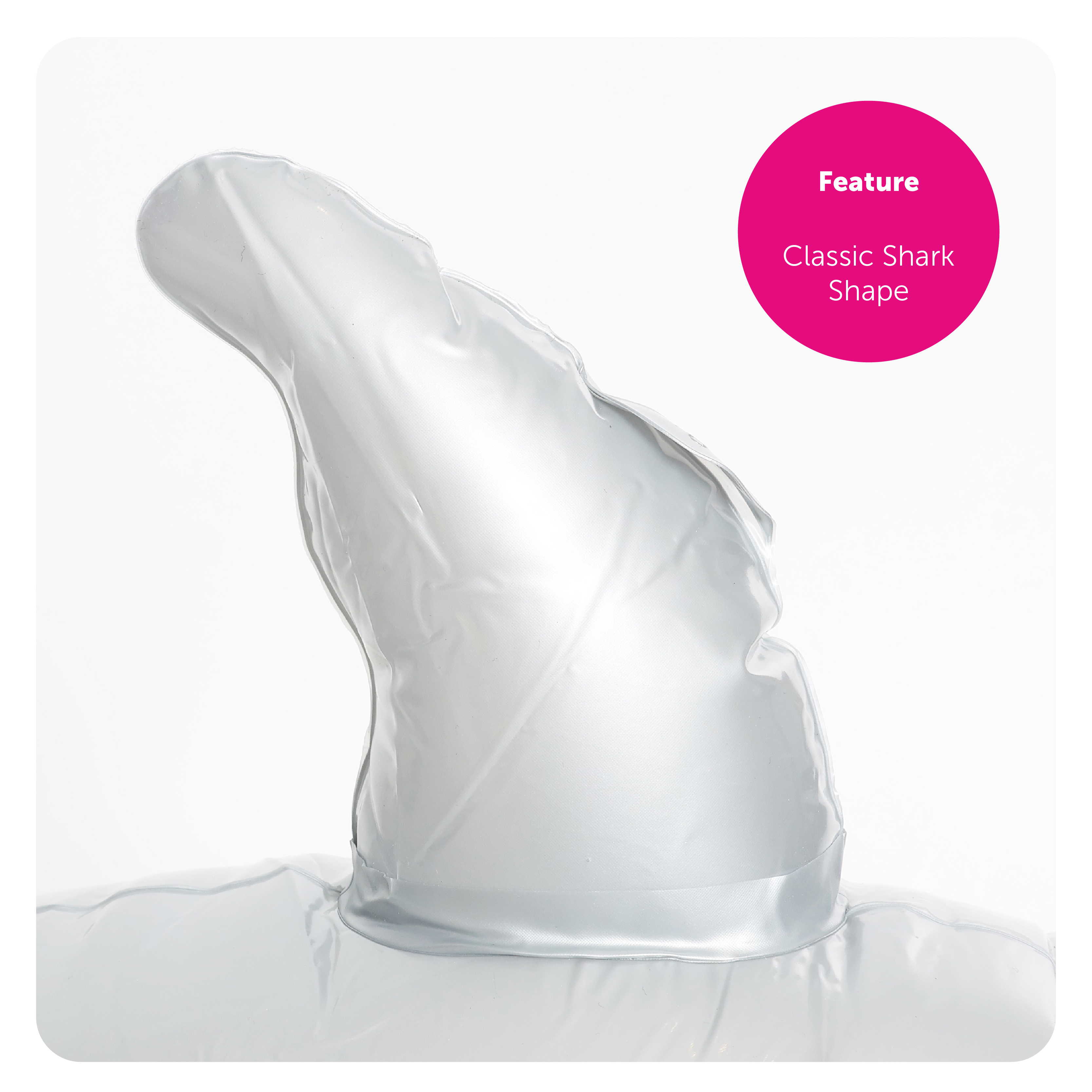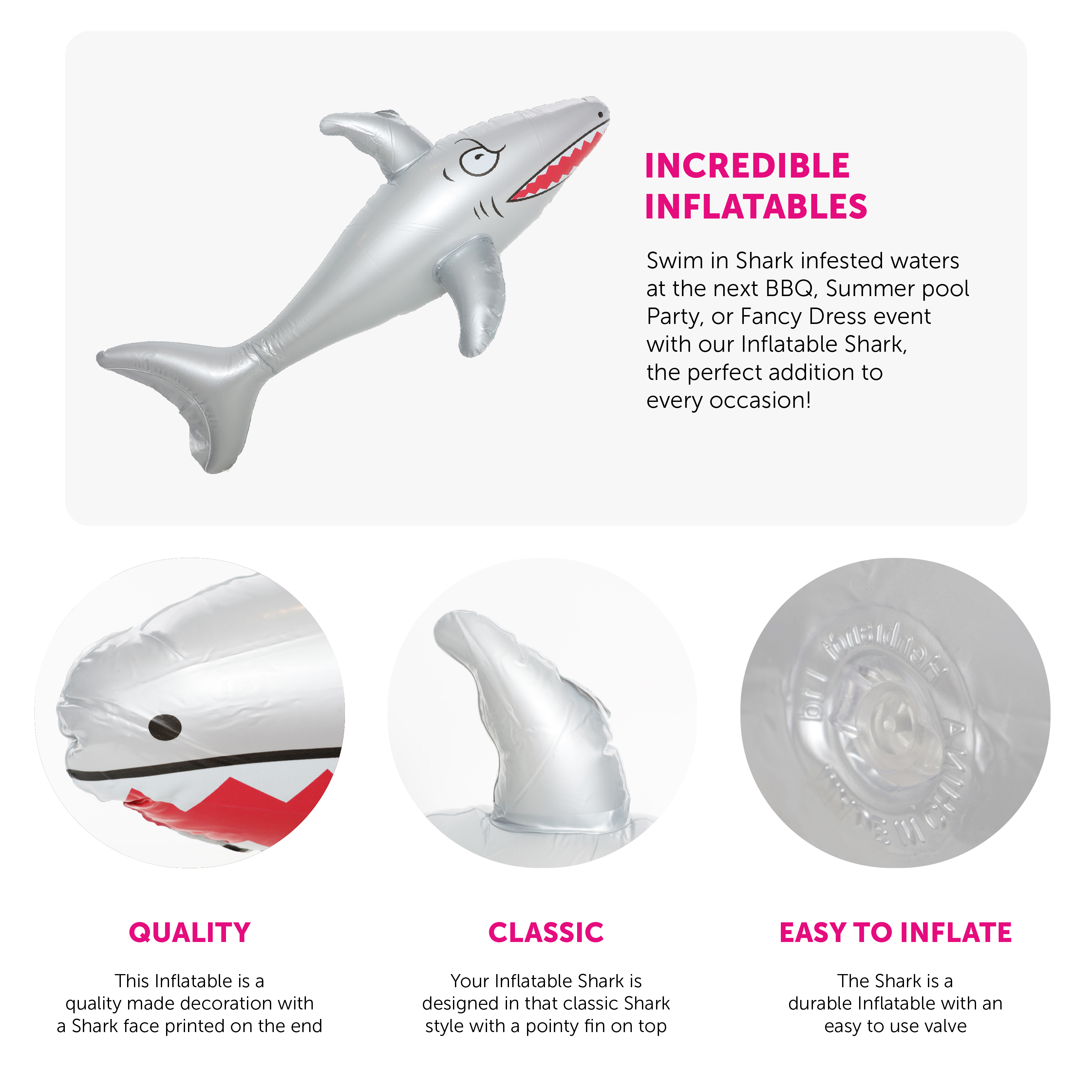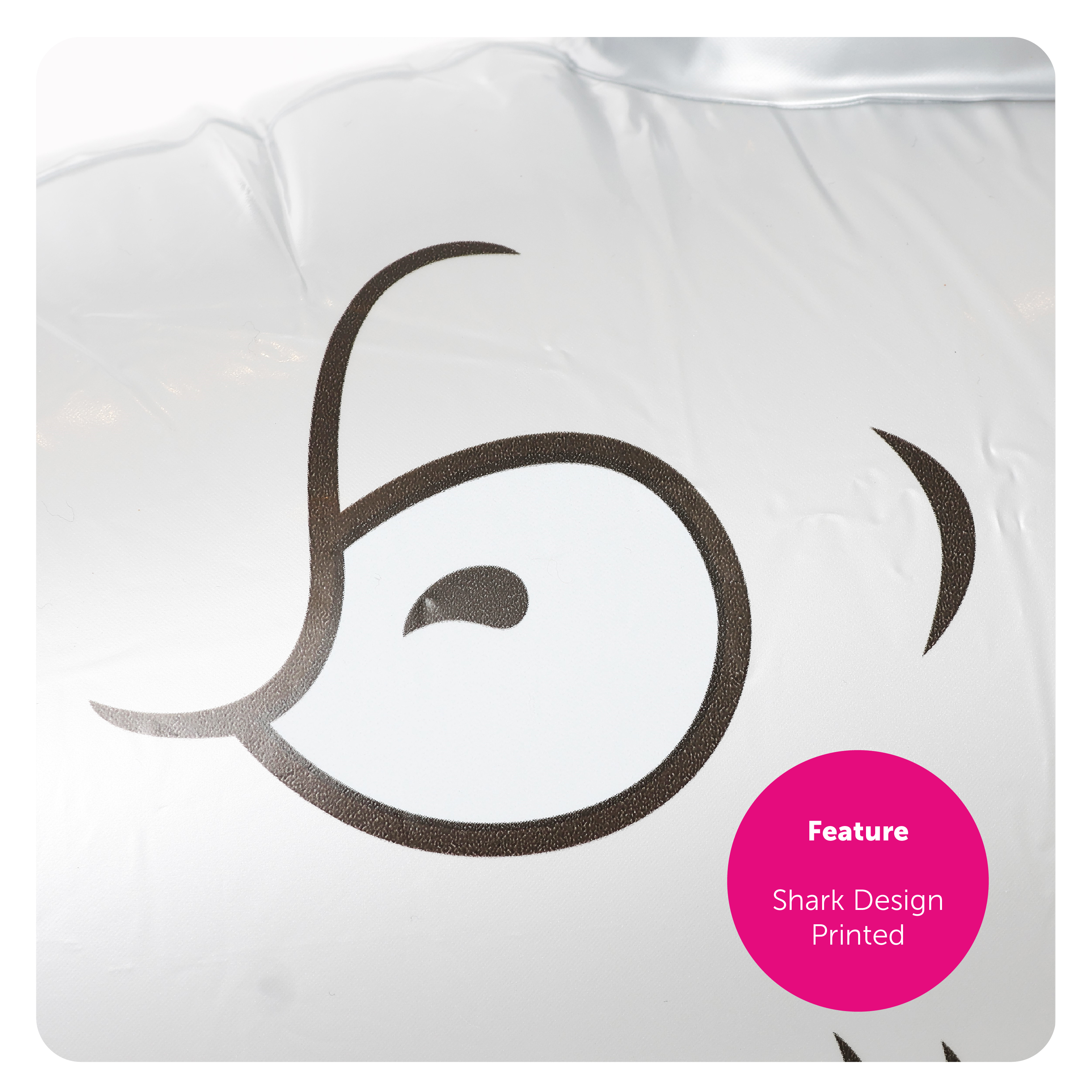 SHARK DETAILS: This Silver Shark is a quality Inflatable, smooth to touch, with a Sharks face printed on the front! The Shark is simple to inflate and deflate, with an easy to use valve!