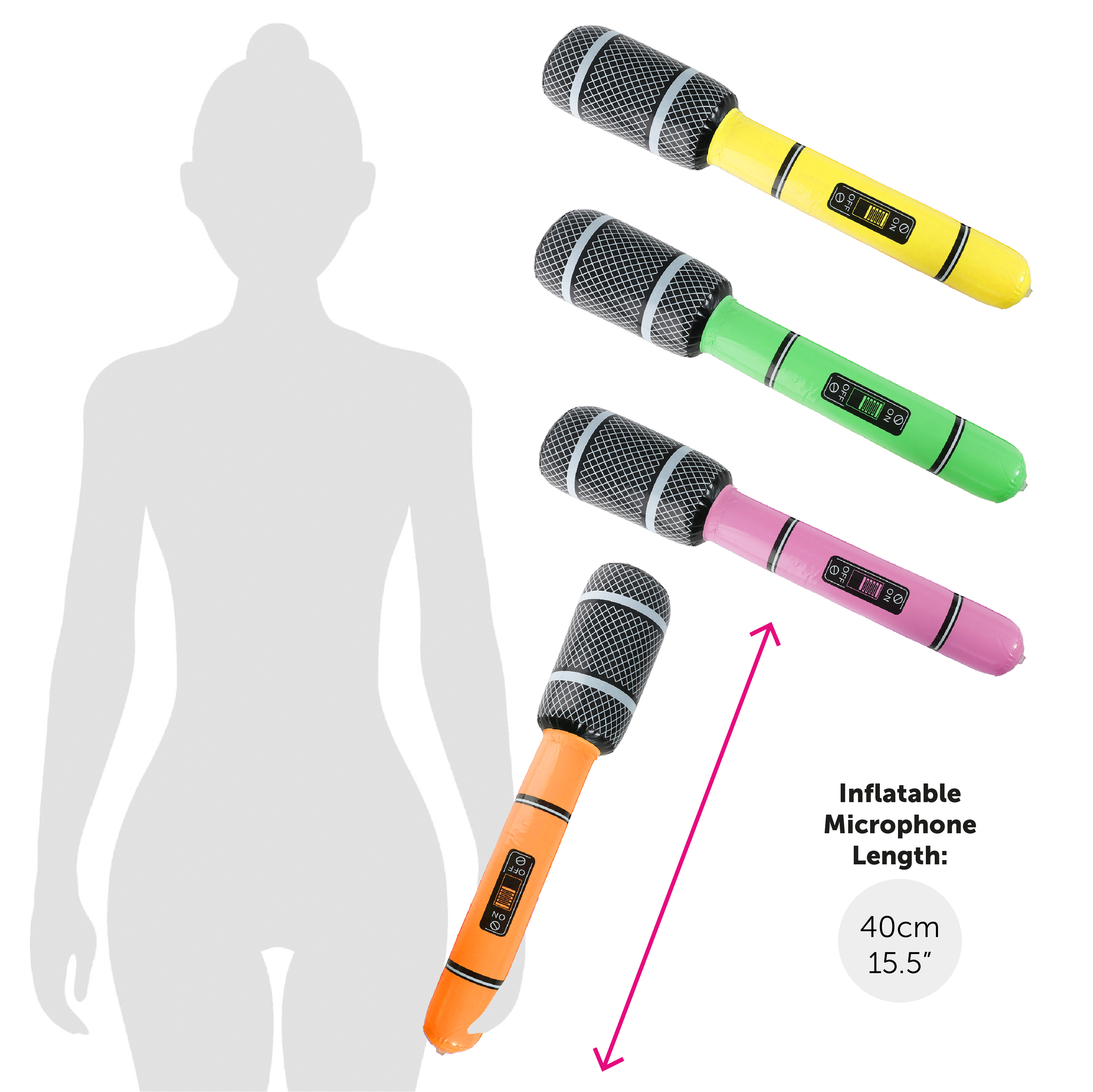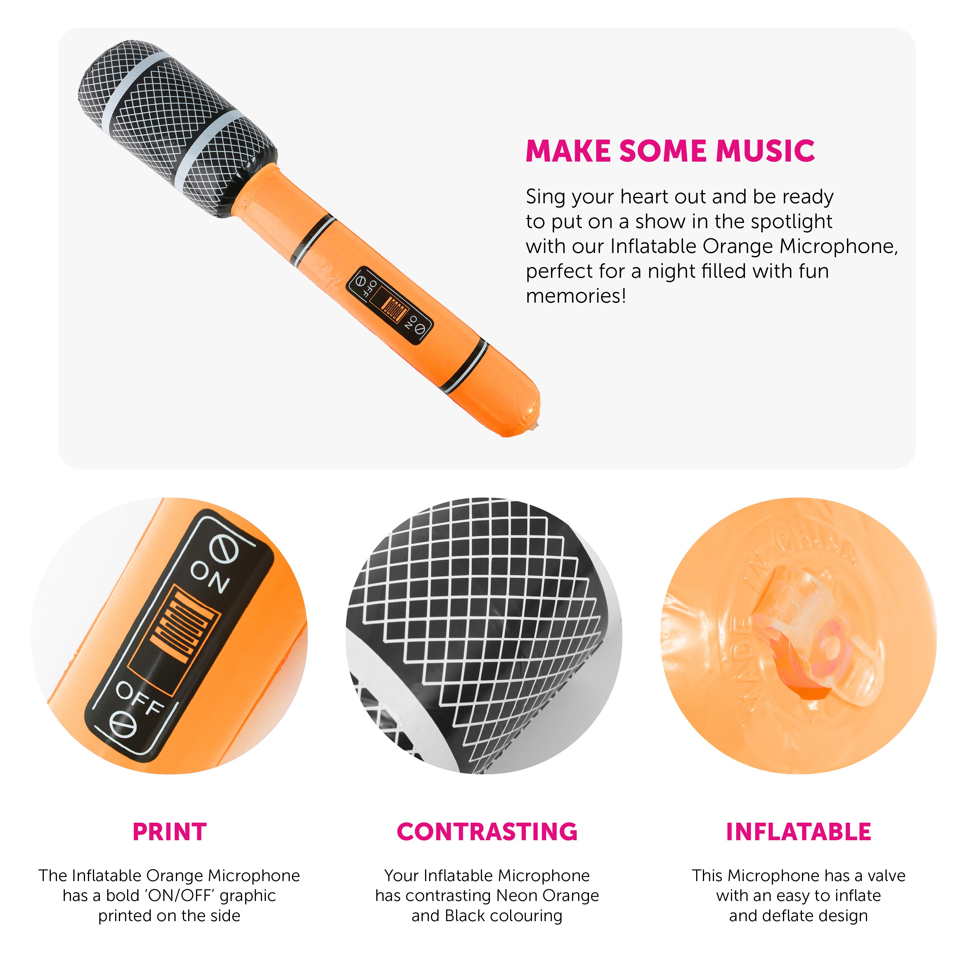 MICROPHONE DETAILS: This Microphone is an easy to inflate Orange and Black Microphone with a pump valve at the bottom, and an 'ON/OFF' switch graphic, the perfect accessory for any Music themed event!