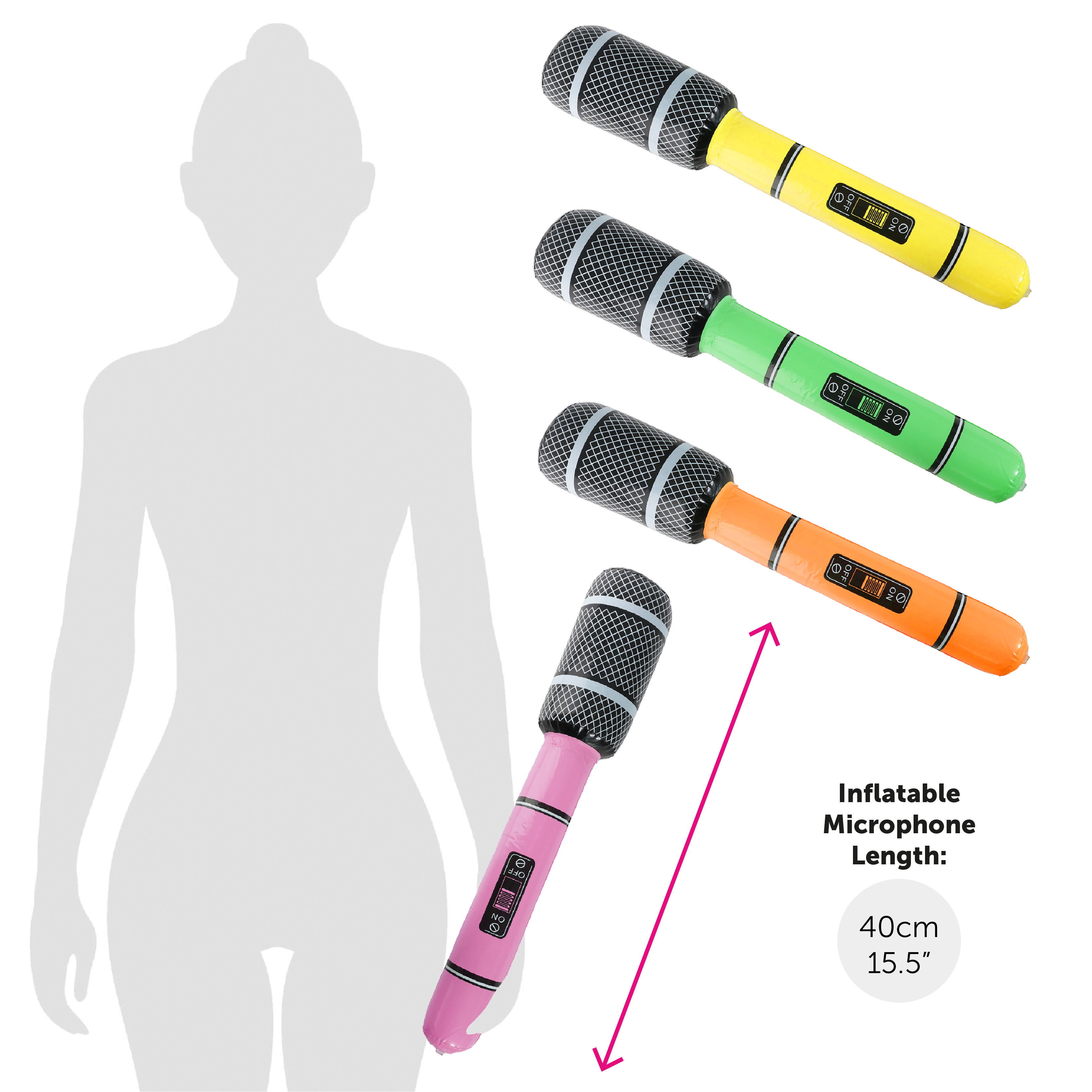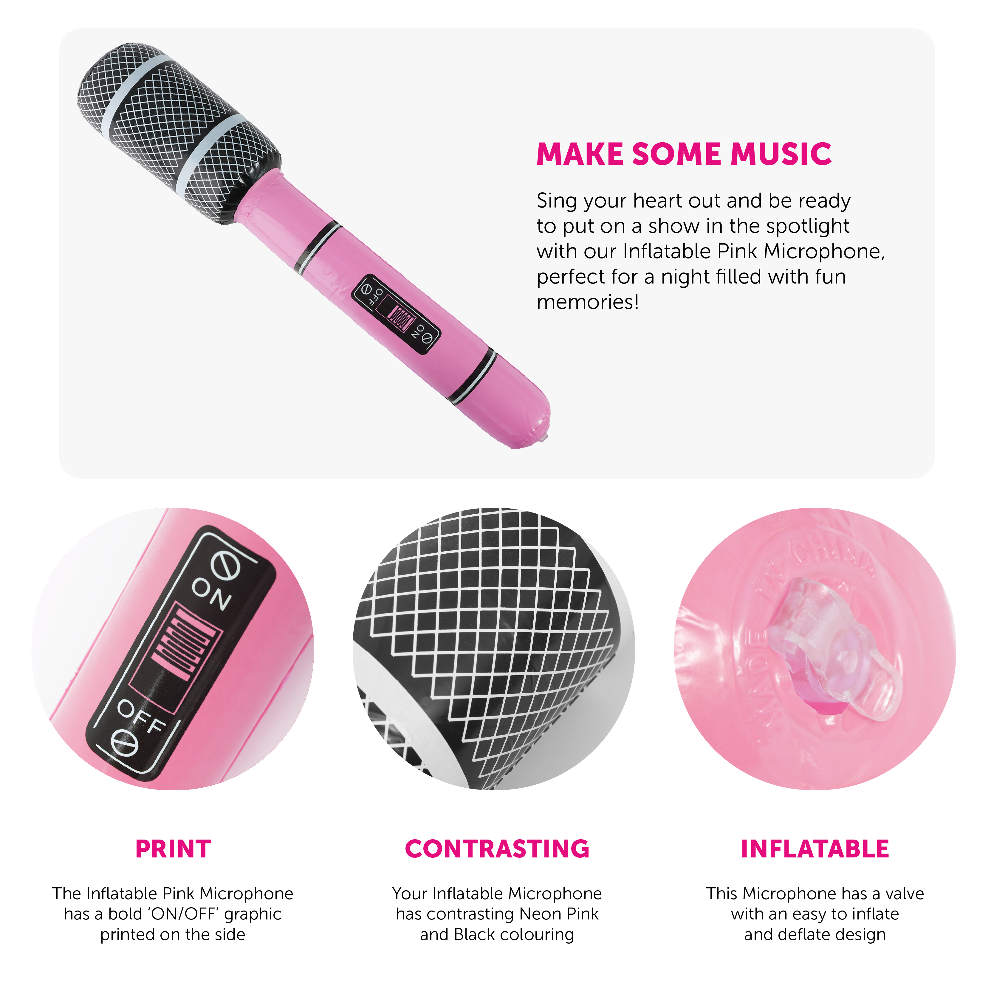 MICROPHONE DETAILS: This Microphone is an easy to inflate Pink and Black Microphone with a pump valve at the bottom, and an 'ON/OFF' switch graphic, the perfect accessory for any Music themed event!