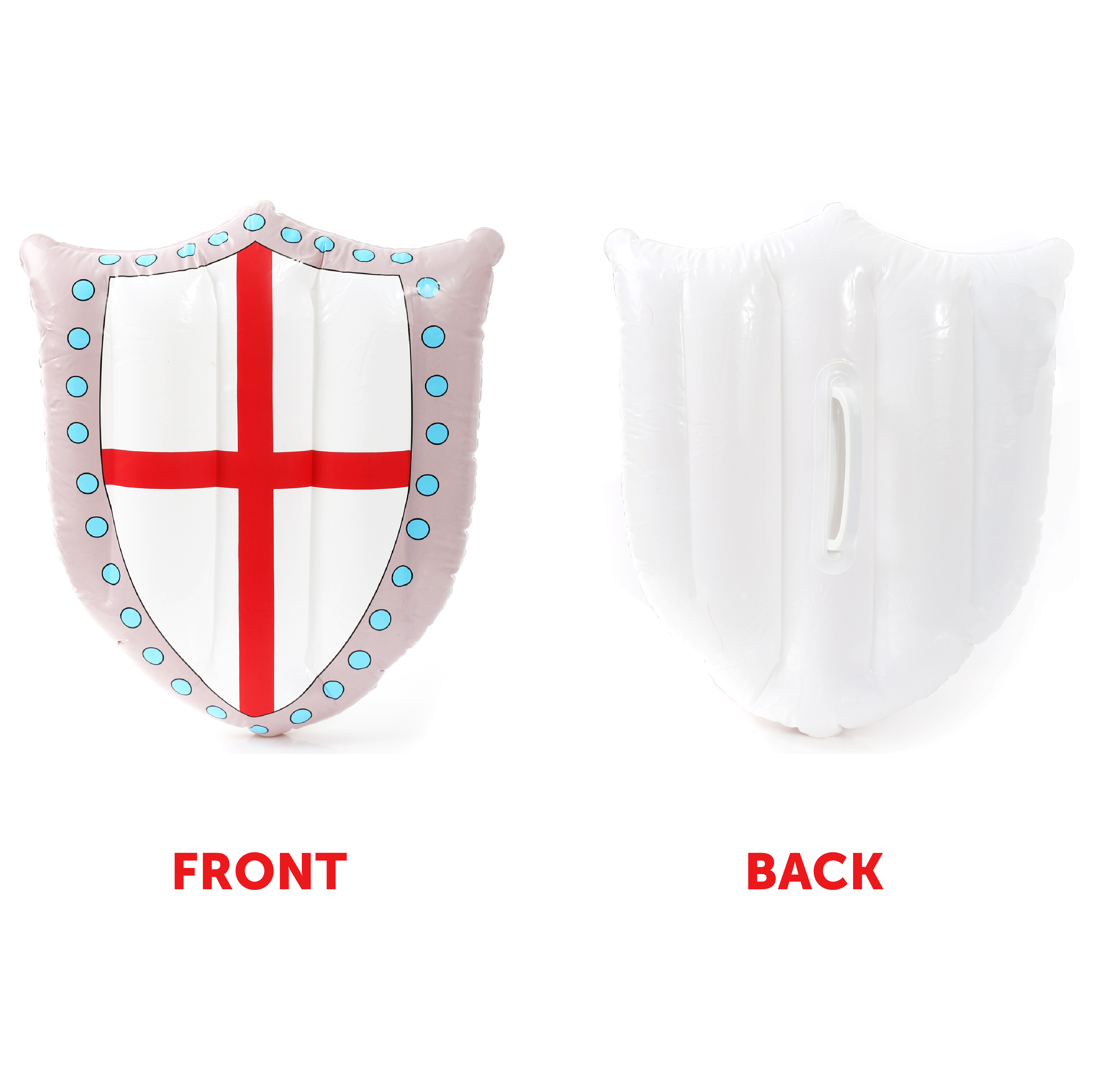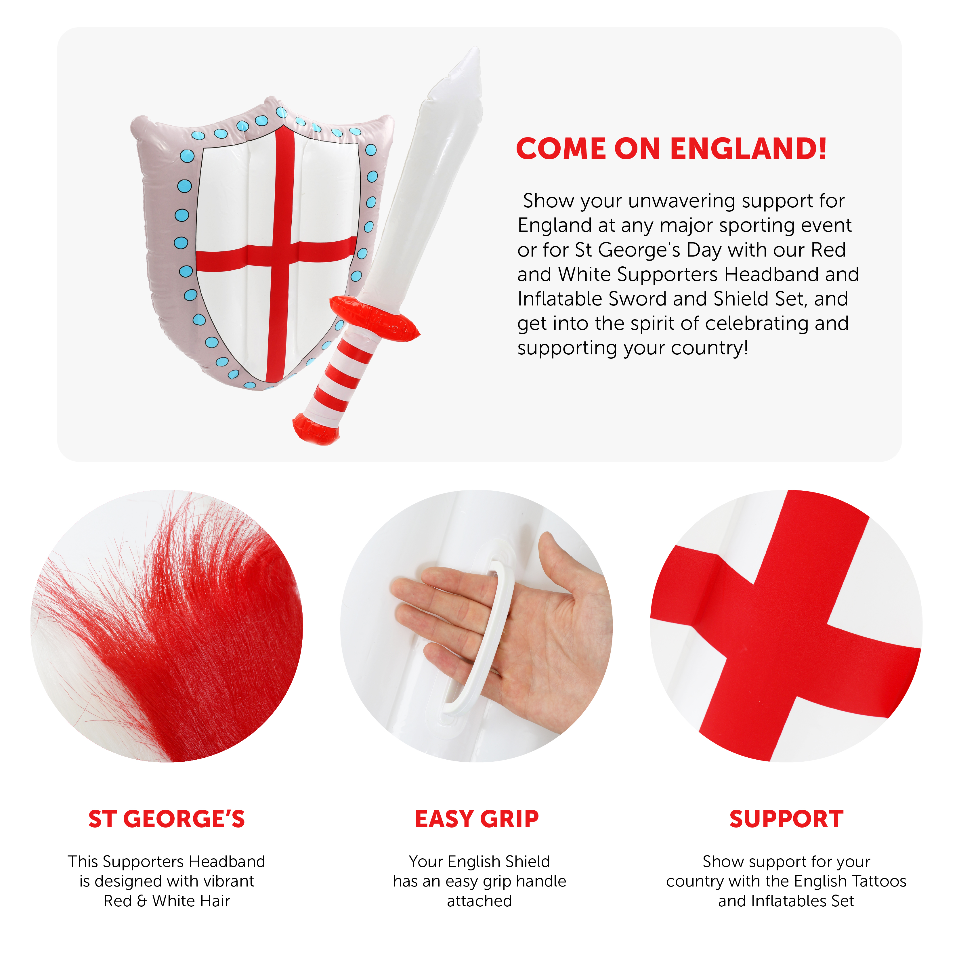 ENGLISH SET INCLUDES: This English Set includes a quality elasticated Red Headband with Red and White Hair attached, an Inflatable Sword with a Red and White Stripe themed handle, and an Inflatable Shield with the English St George's Cross branded across the front!