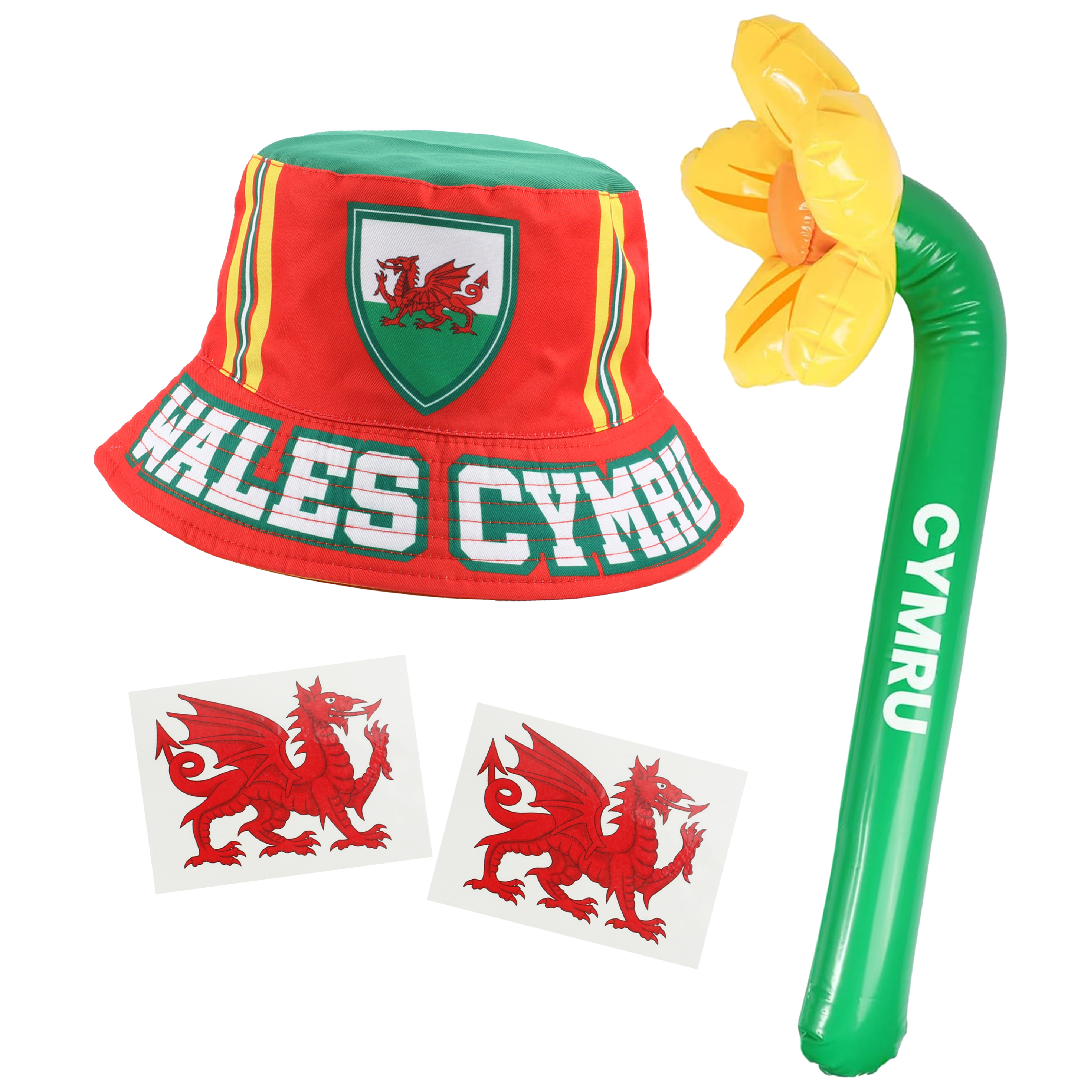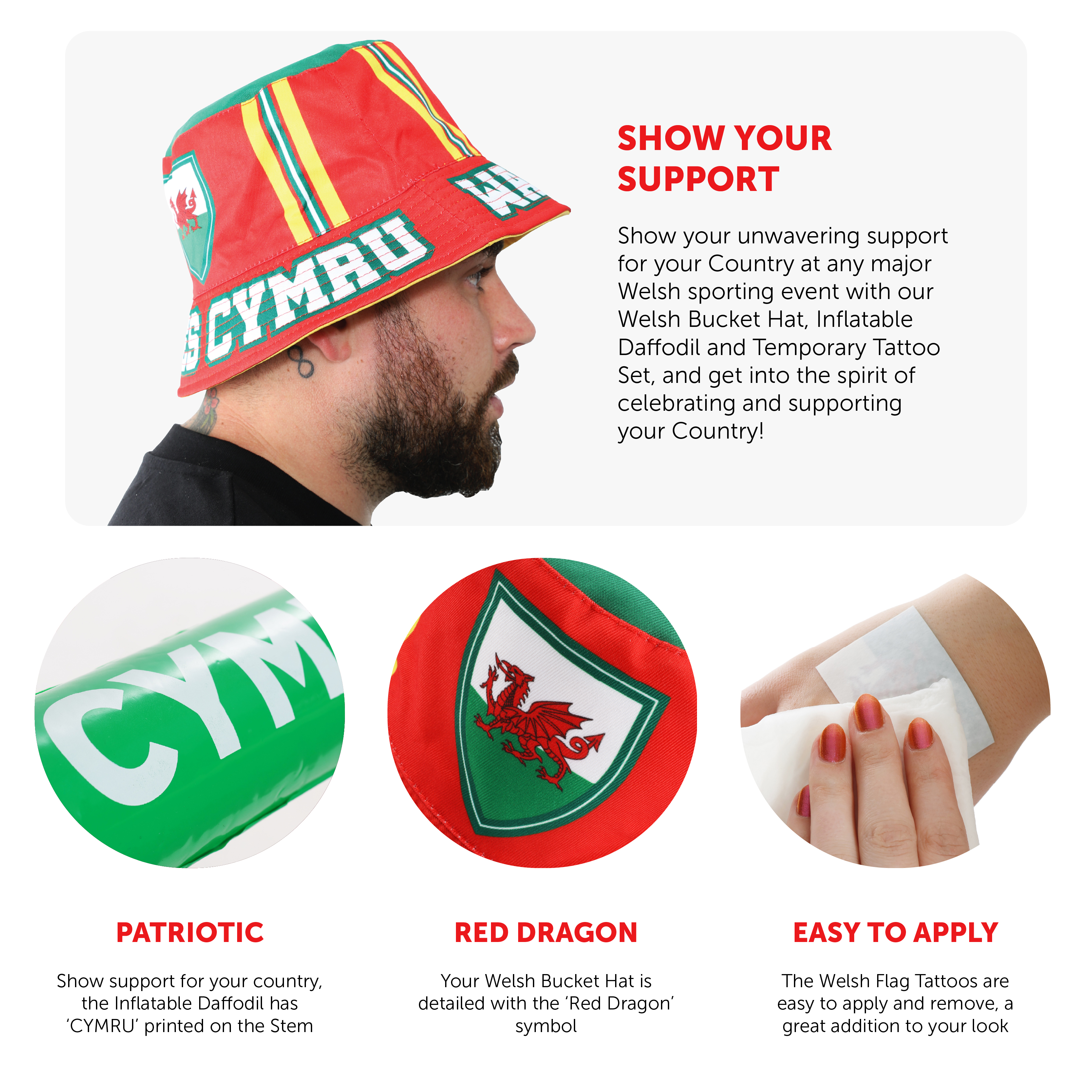 WELSH BUCKET HAT, INFLATABLE DAFFODIL & TEMPORARY TATTOOS: Show your unwavering support for your Country at any major Welsh sporting event with our Welsh Bucket Hat, Inflatable Daffodil and Temporary Tattoo Set, and get into the spirit of celebrating and supporting your Country!