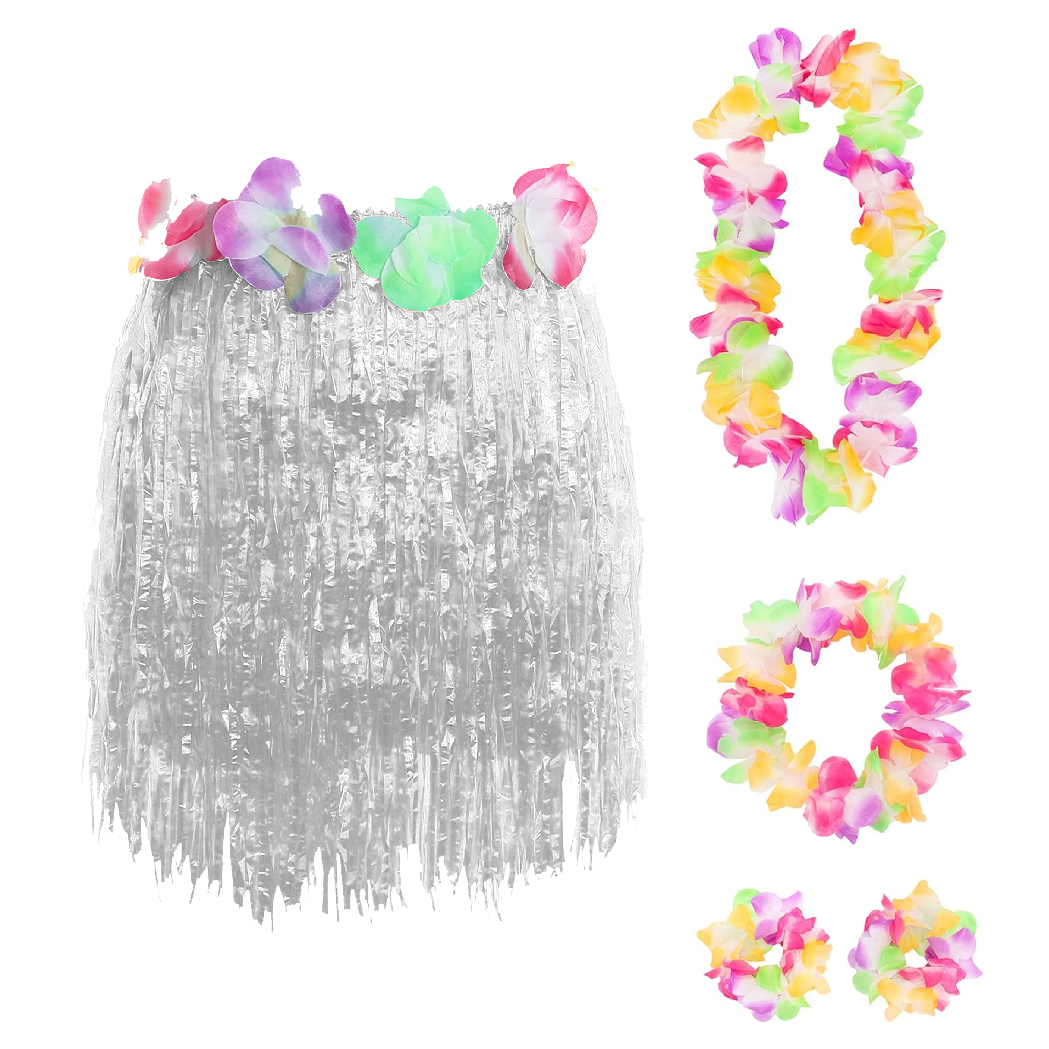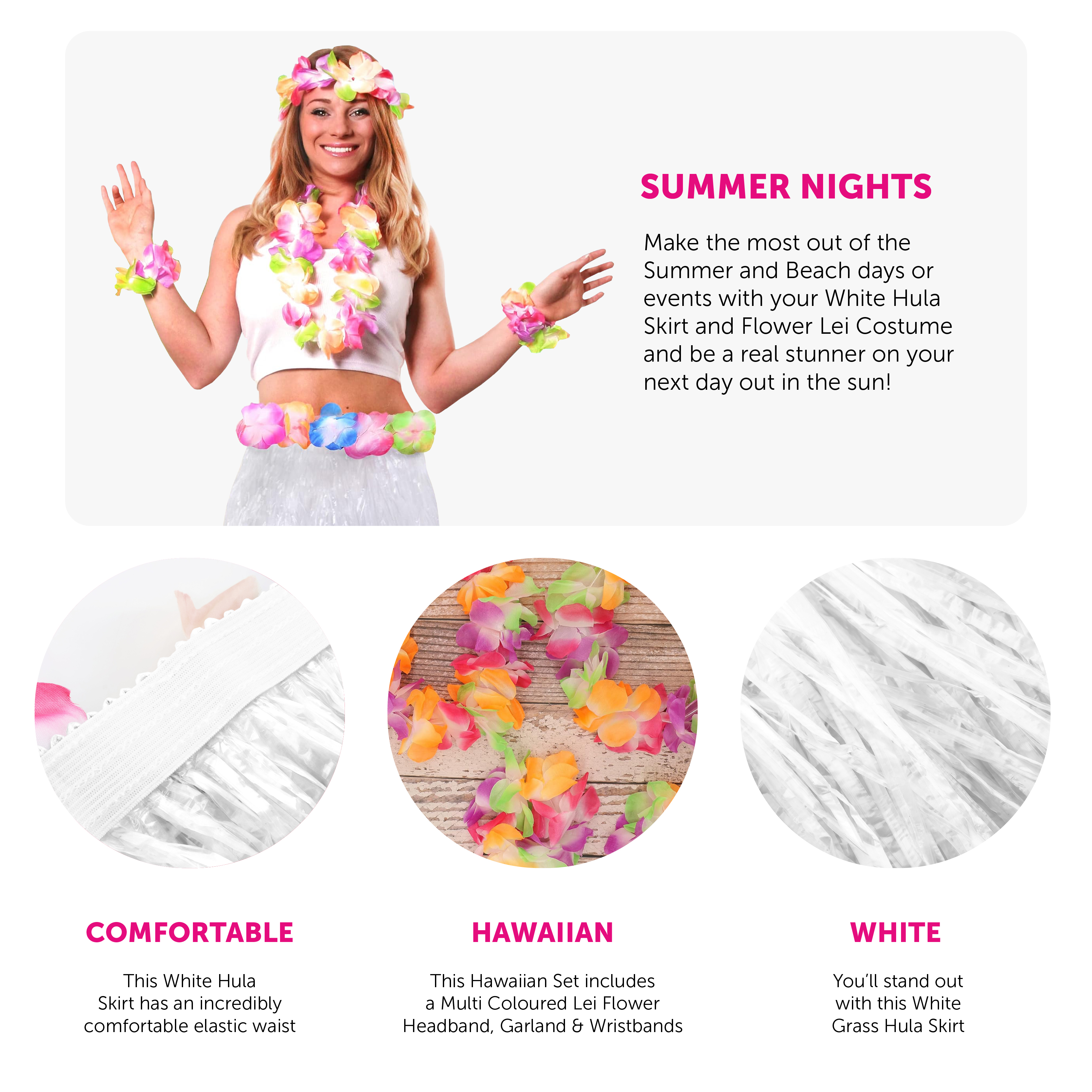 COSTUME DETAILS: Your Costume includes a short grass-like White Hula Skirt with an elasticated waistband, with multi coloured decorative Hawaiian Lei Flowers around the waist, and a 4 Piece Multi coloured Hawaiian Lei Flower Necklace, Headband and Wristband Set, all tropical and ready for the beach!