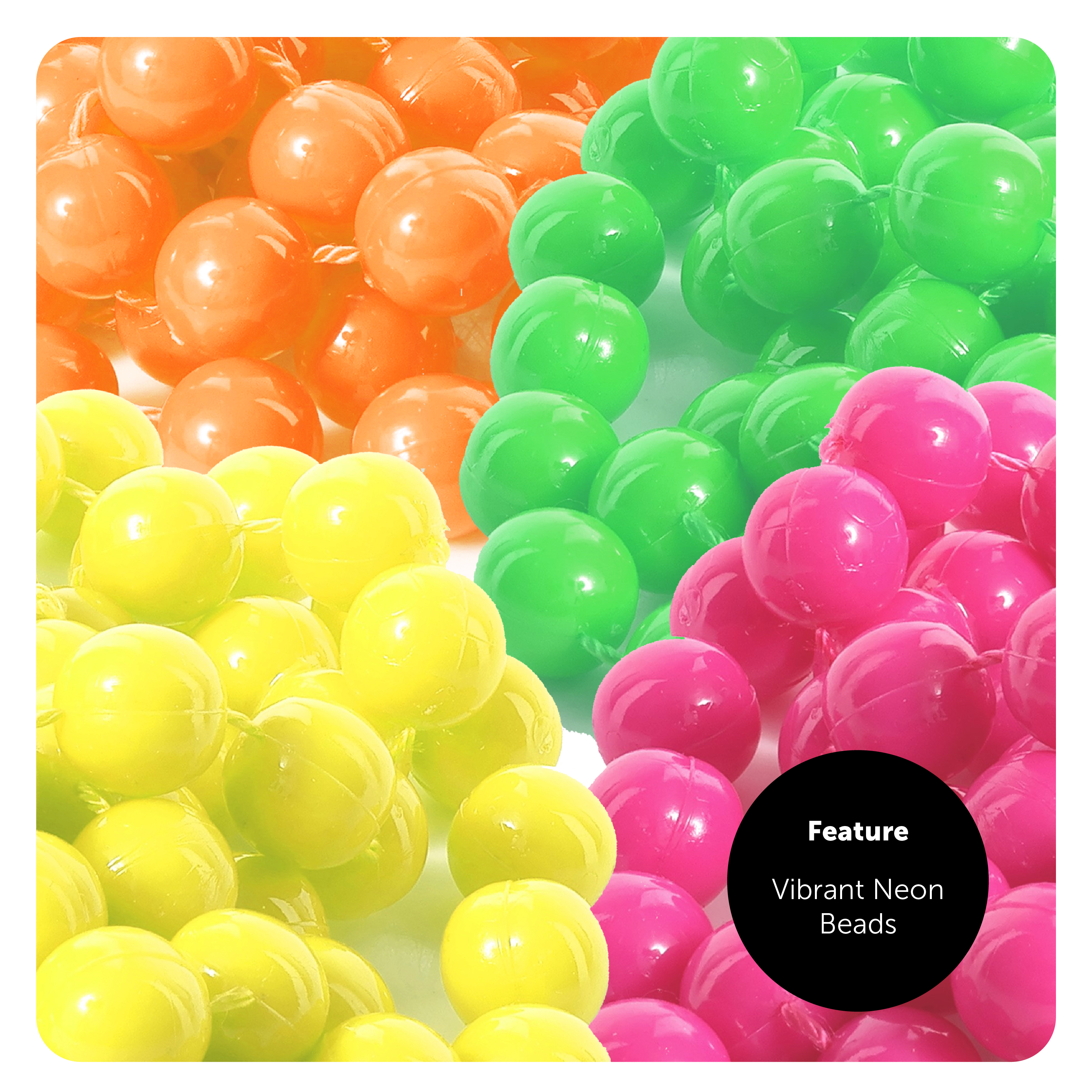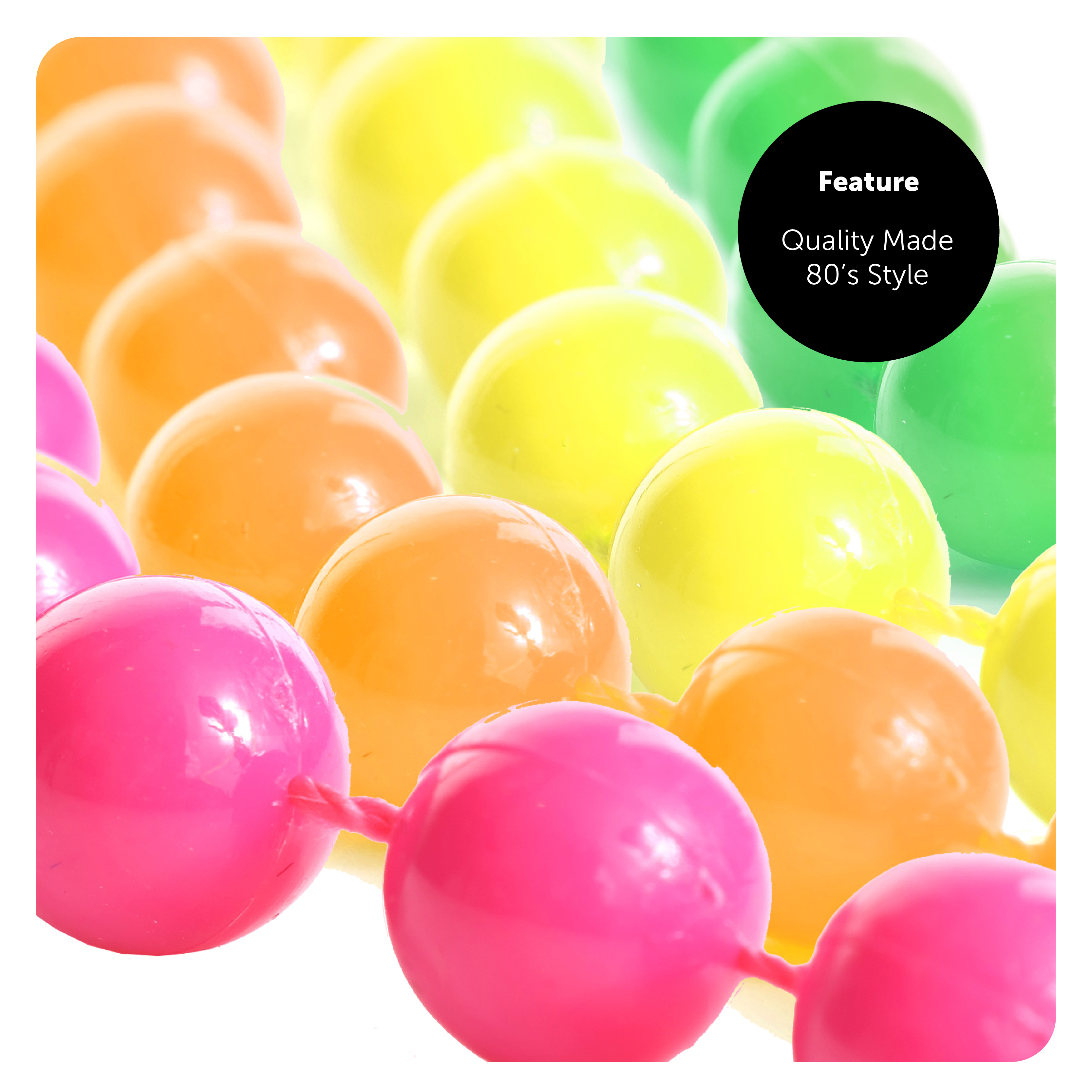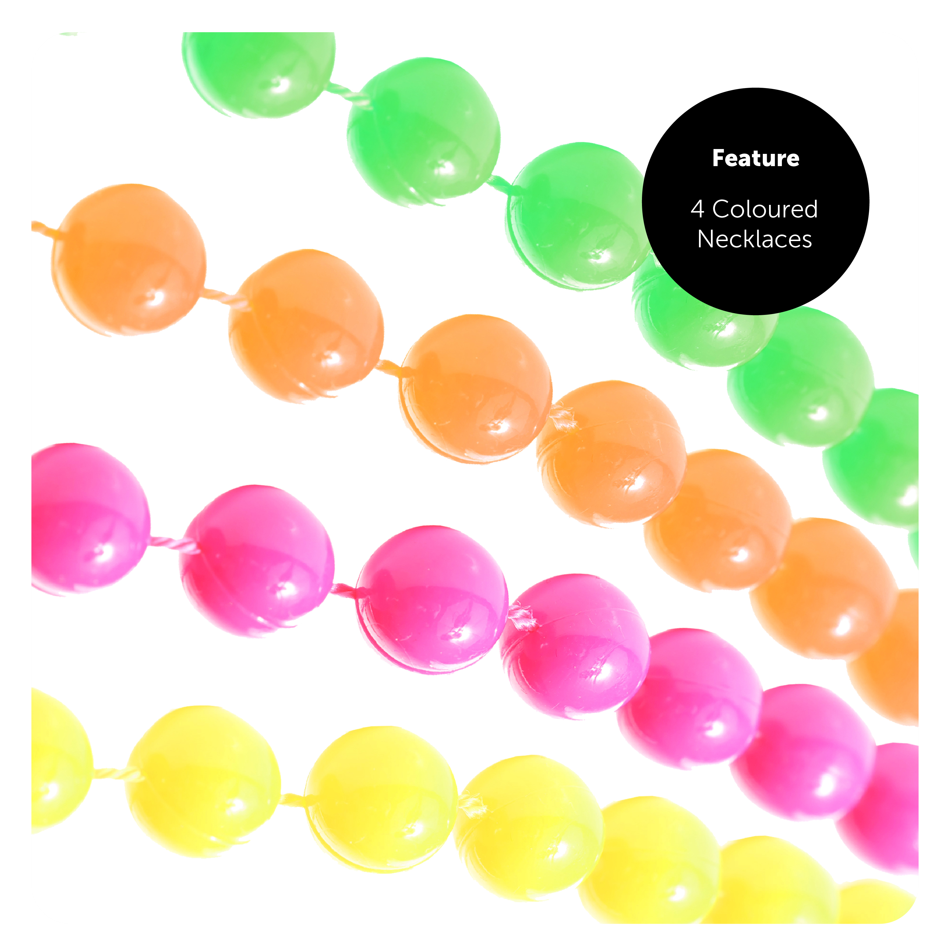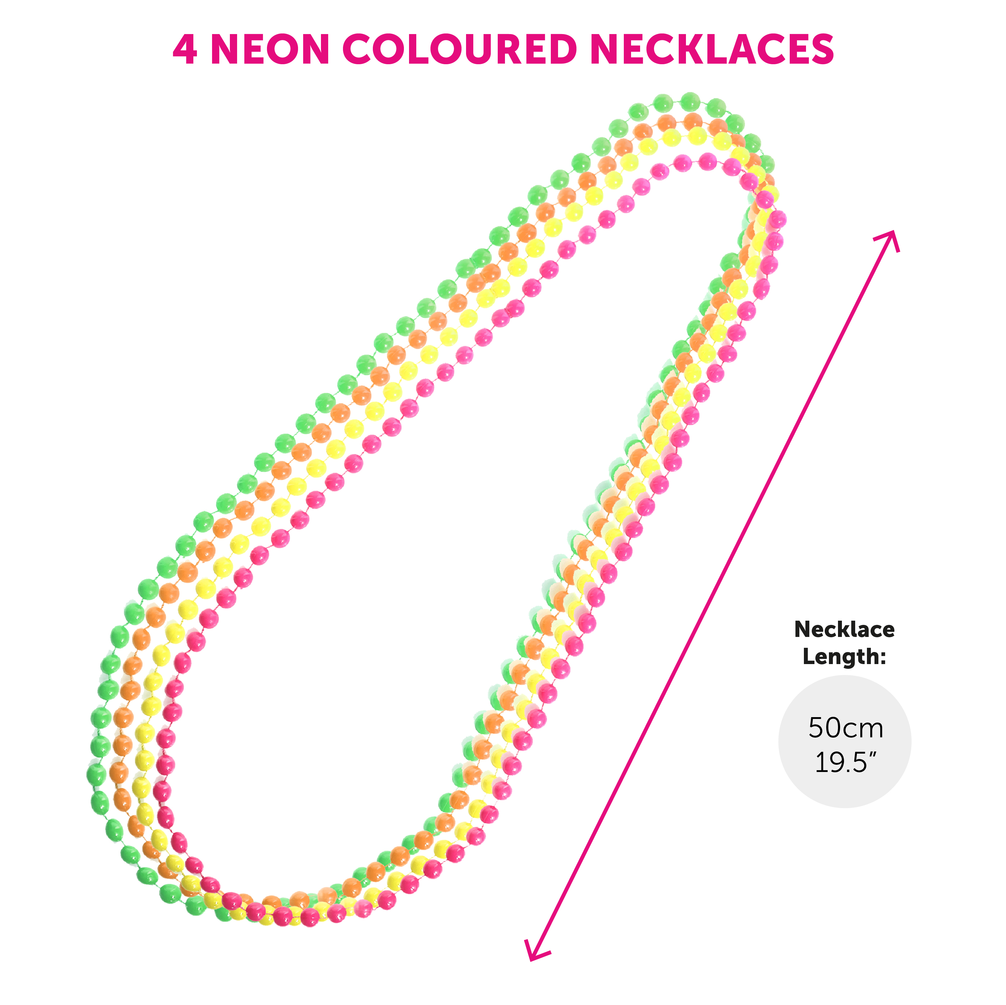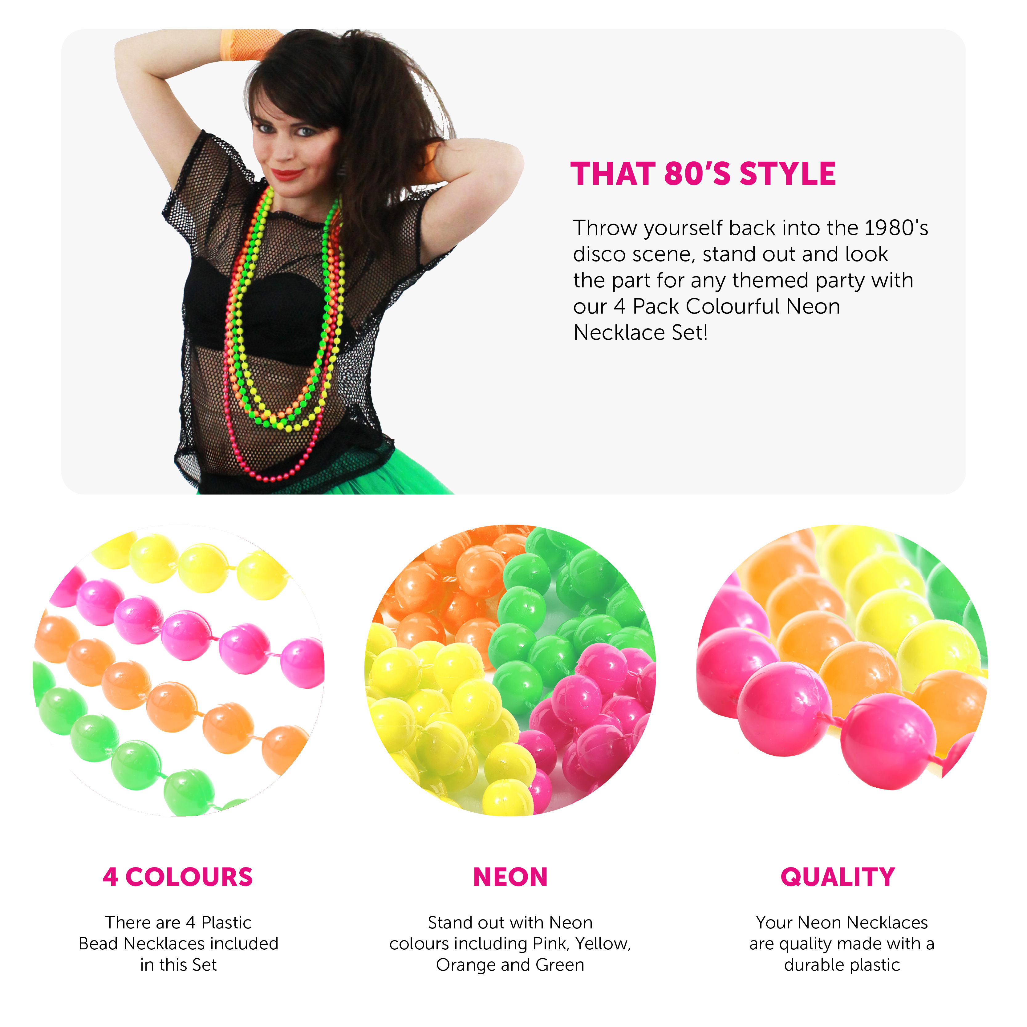NEON NECKLACE DETAILS: This Necklace Set includes 4 different coloured Neon Bead Necklaces including 1x Orange Bead Necklace, 1x Pink Bead Necklace, 1x Yellow Bead Necklace and 1x Green Bead Necklace, the perfect accessories to add to your 80's themed outfit!