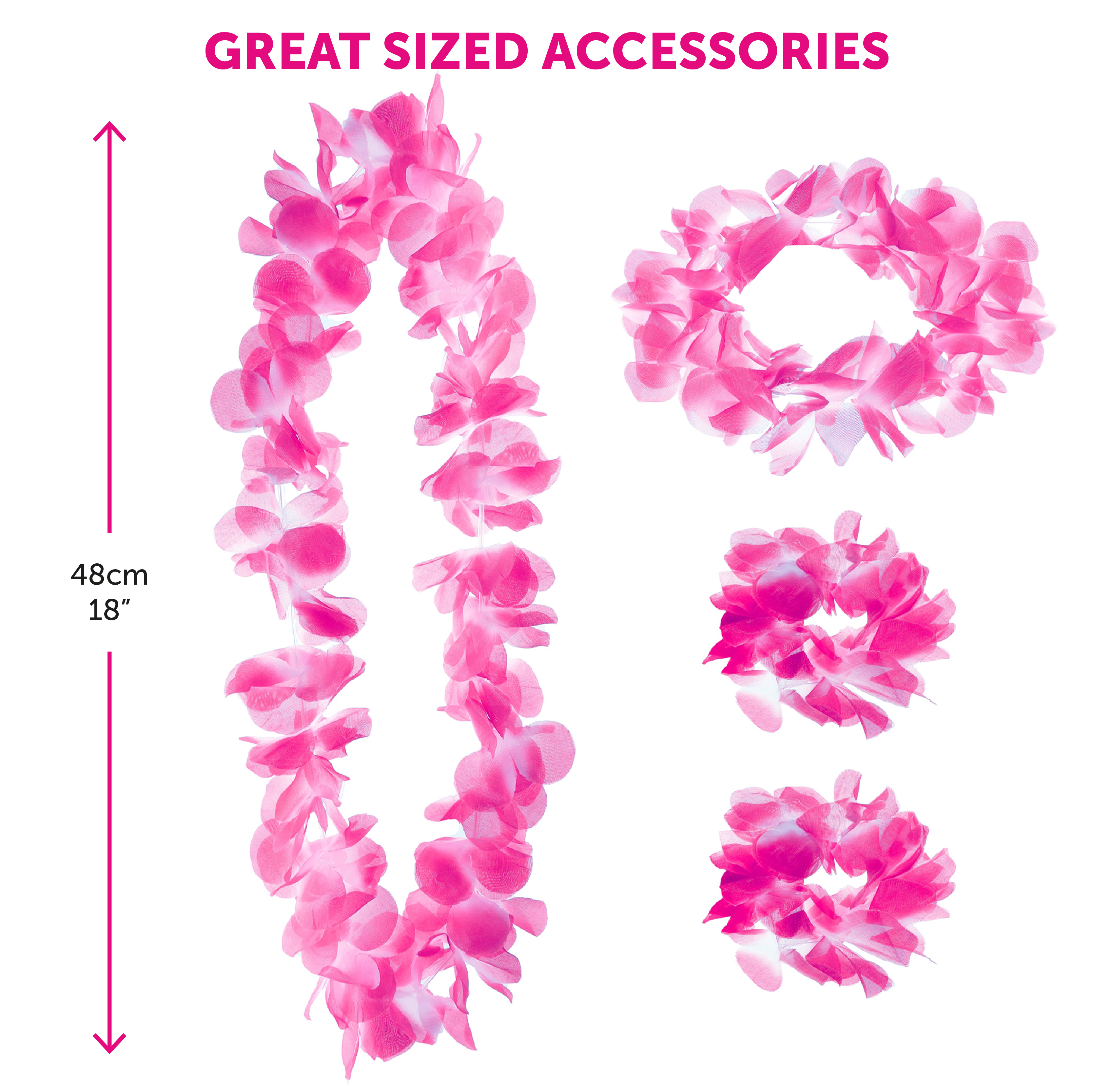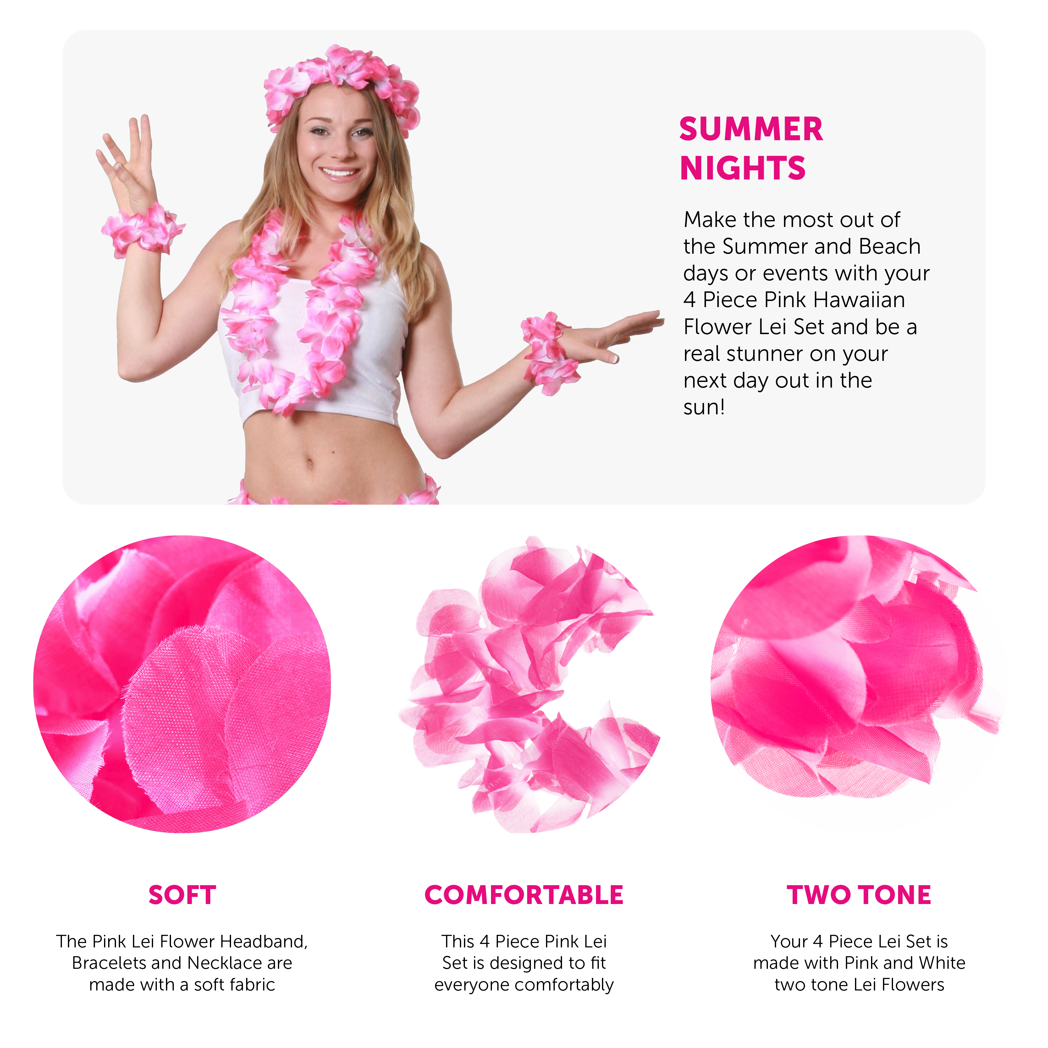 HAWAIIAN SET INCLUDES: This Hawaiian Flower Lei Set includes 1x Pink Flower Lei Necklace, 1x matching Pink Floral Headband, and 2x matching Pink Flower Bracelets, the perfect set to get you ready for any Summer party!