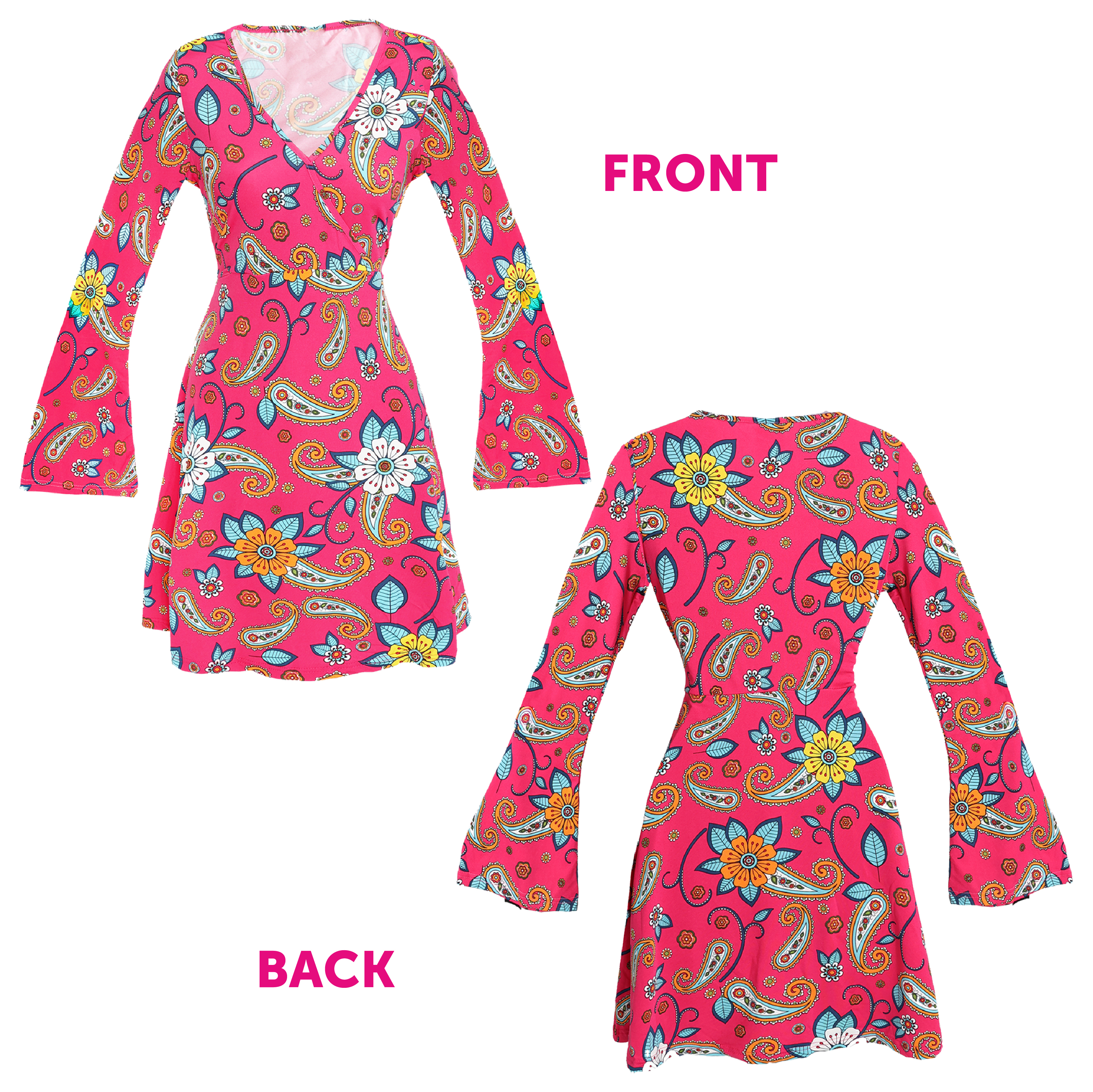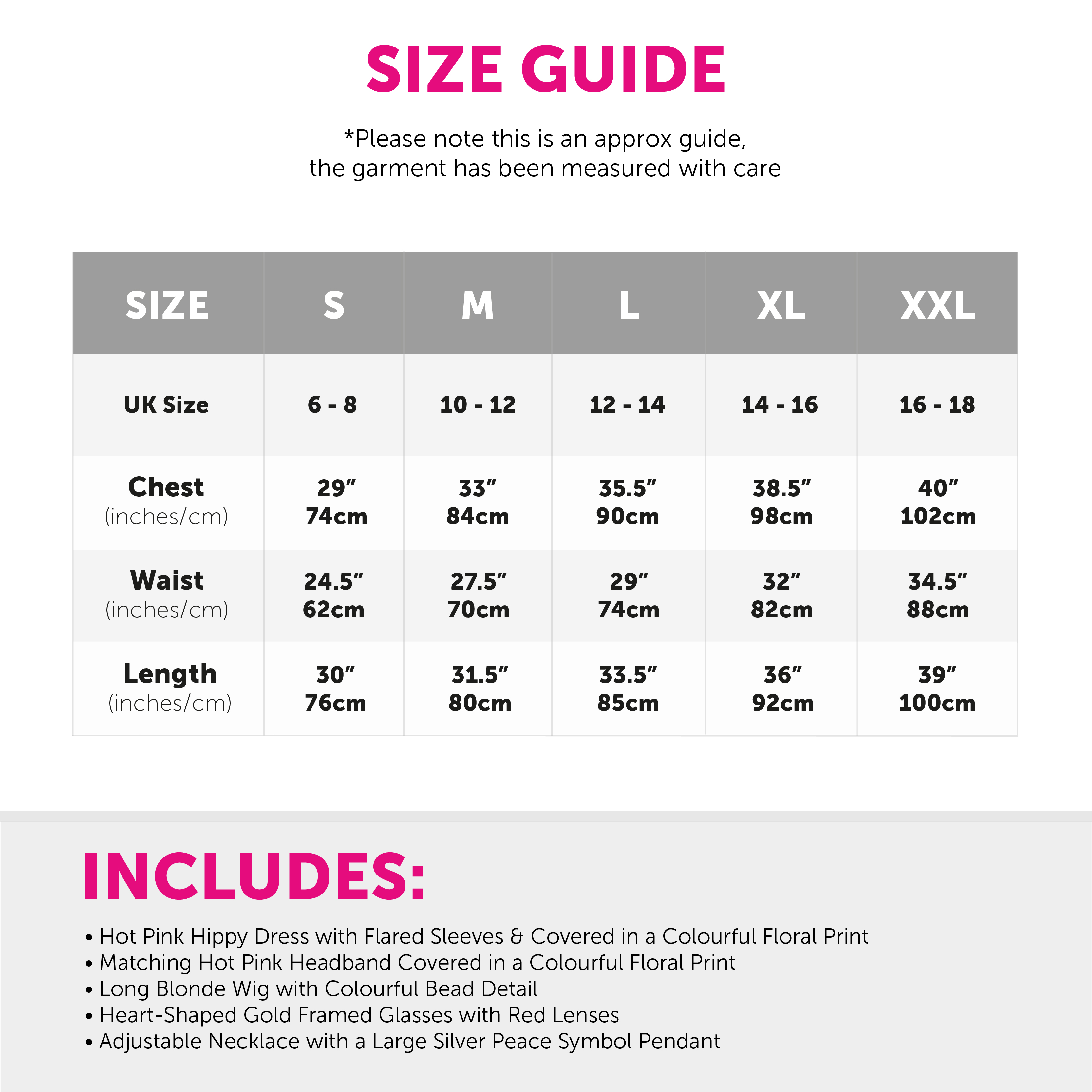 COSTUME INCLUDES: Your Ladies Hippie Costume includes a Pink Floral Paisley 60's Hippie Dress, a Matching 60's Go-Go Headband, a sleek Long Blonde Wig with colourful Bead detail, a pair of Heart-Shaped, Gold Framed Glasses with Red Lenses and a Necklace with a Peace Symbol Pendant, a simplistic yet iconic look for any Fancy Dress Party!