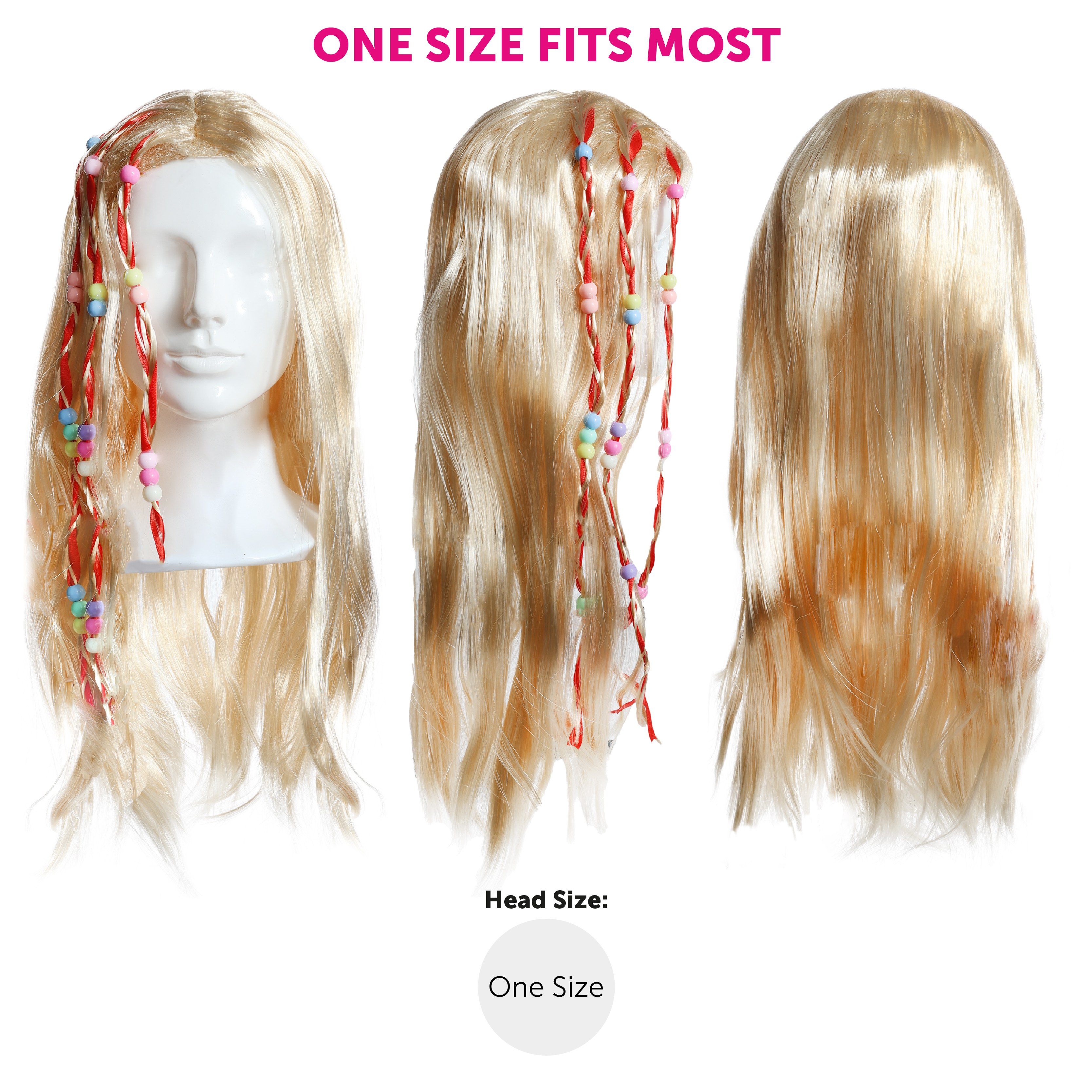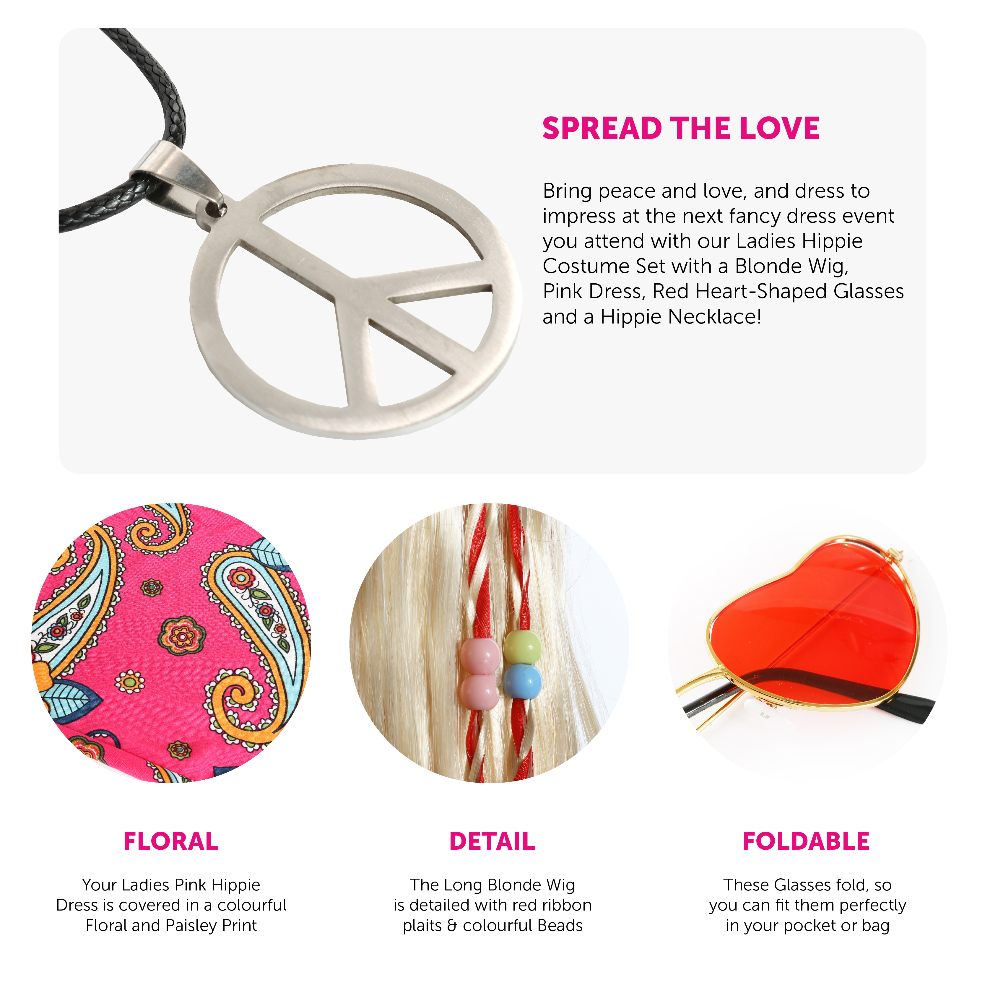 LADIES HIPPIE COSTUME SET: Bring peace and love, and dress to impress at the next fancy dress event you attend with our Ladies Hippie Costume Set with a Blonde Wig, Pink Dress, Red Heart-Shaped Glasses and a Hippie Necklace!
