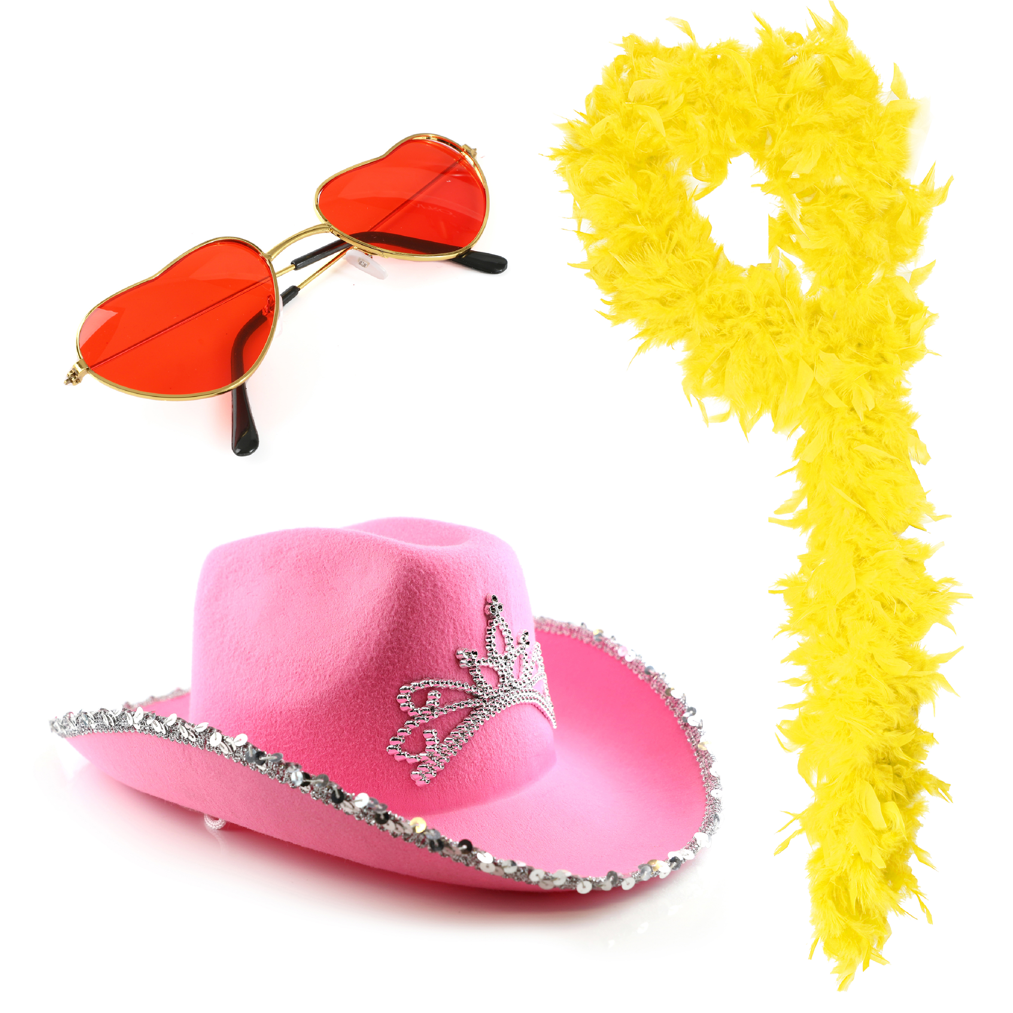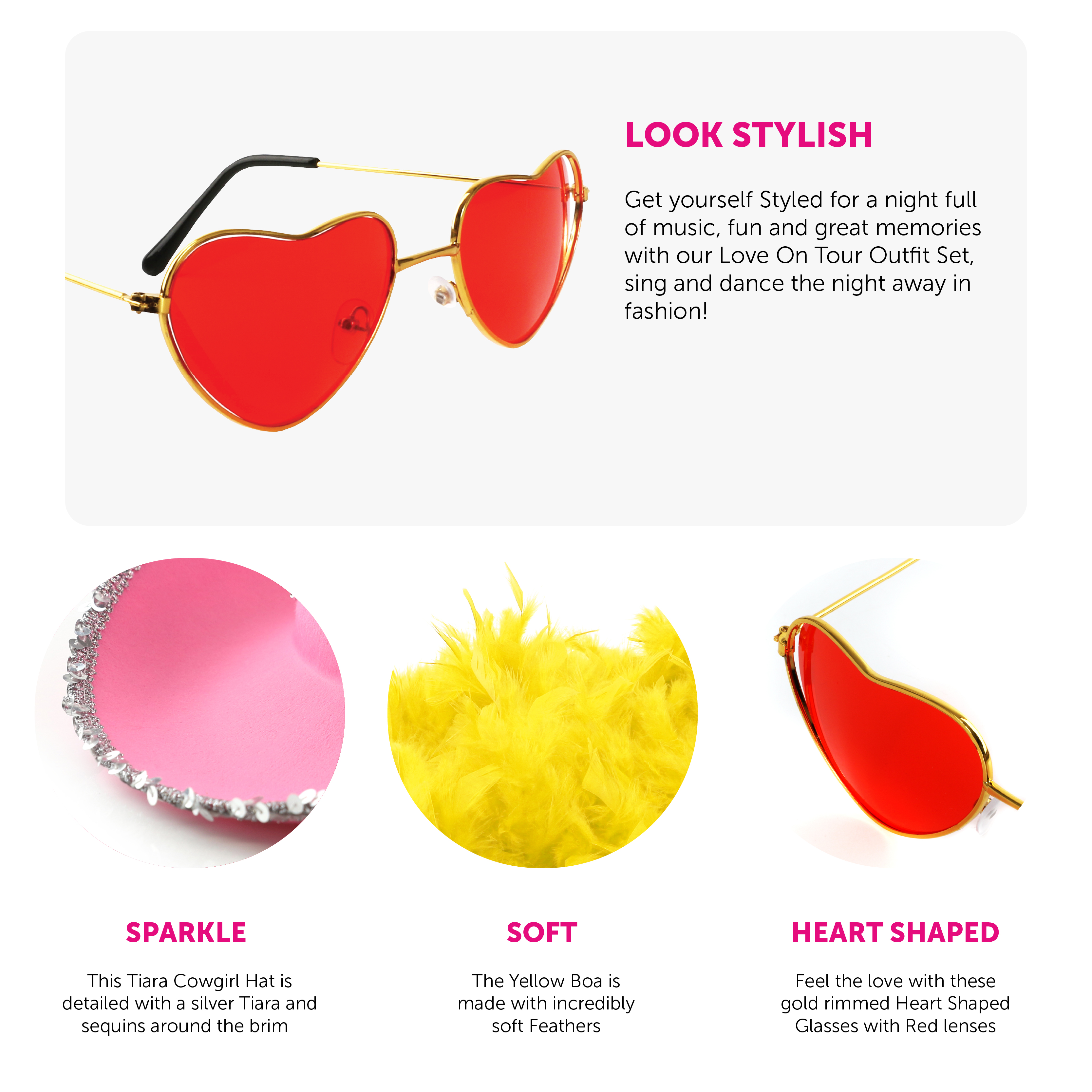 COSTUME SET INCLUDES: This Love On Tour Costume Set includes a Pink Cowboy Hat with a Silver Tiara on the front, sequin edging and an adjustable cord, a soft Yellow Feather Boa and a pair of Heart Shaped Glasses with Red Lenses!