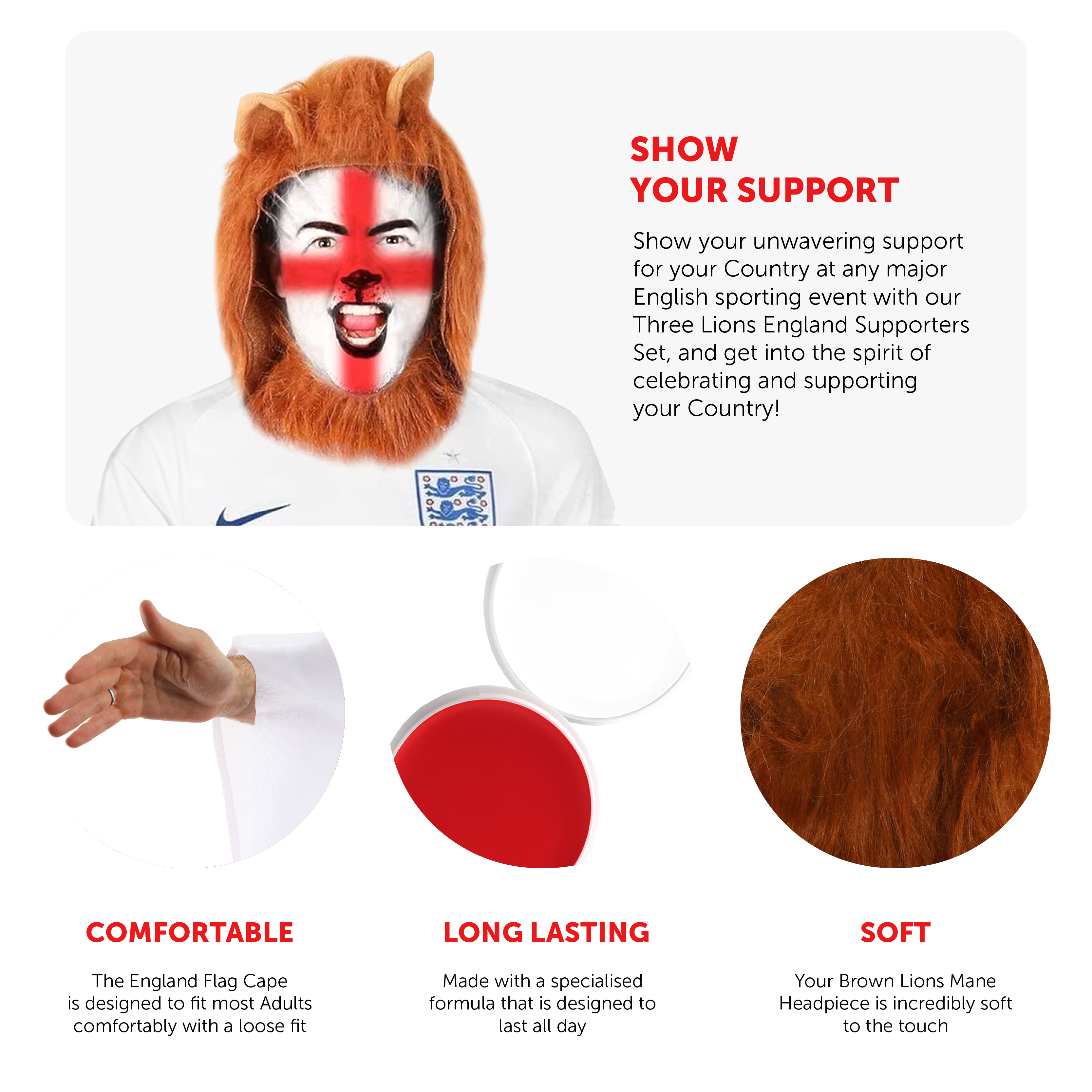 SET INCLUDES: This Three Lions England Supporters Set includes a fluffy Brown Lions Mane with comfortable hook and loop fastening, a loose fitting England Flag Cape, a Palette of Red Face Paint, and a Palette of White Face Paint, the perfect set to support your Country at any English event!