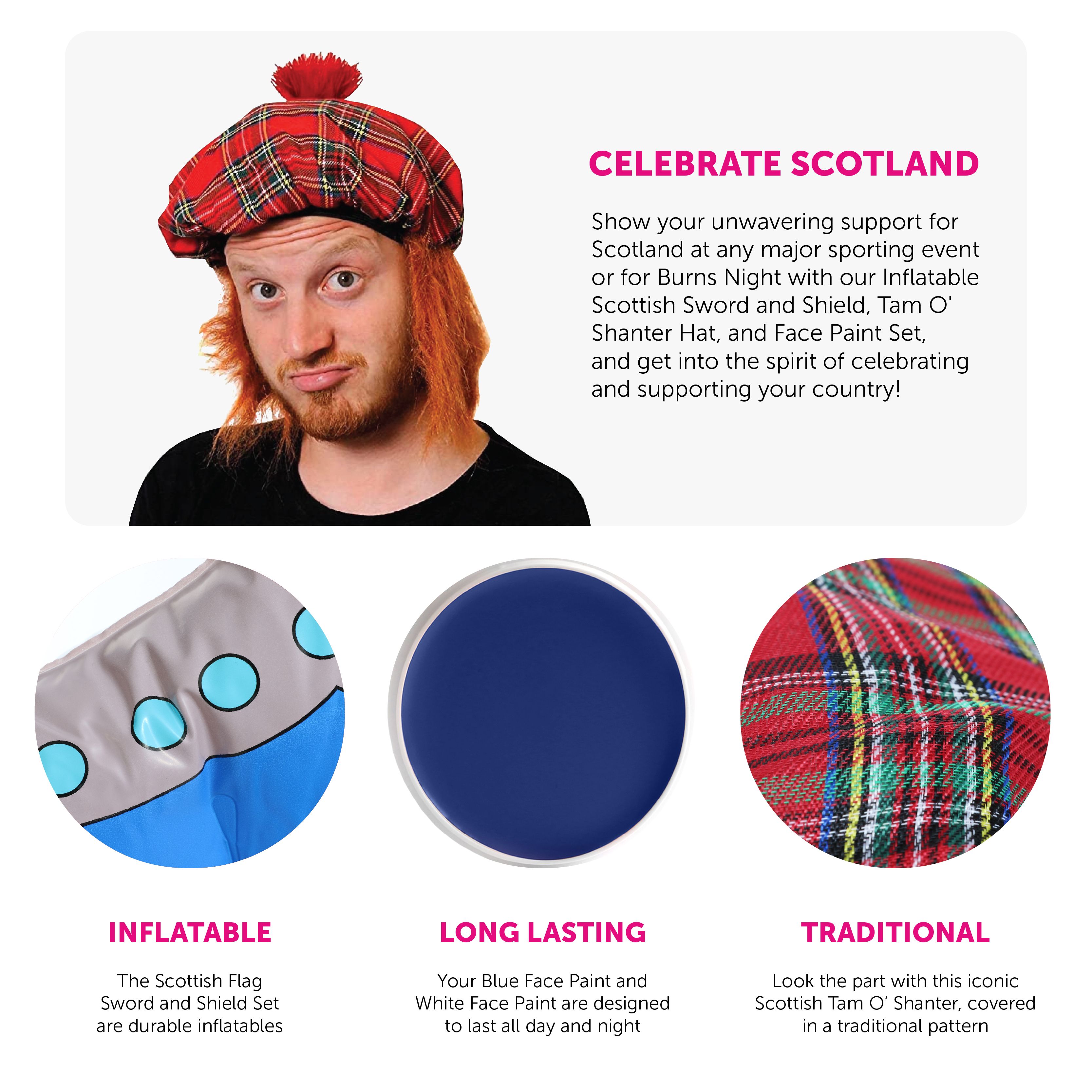 PERFECT FOR BURNS NIGHT & SCOTTISH CELEBRATIONS: Whether it be for Football, Burns Night, Rugby, or any other Scottish event you need to attend, then make sure you’re not missing out on picking up our Inflatable Scottish Sword and Shield, Tam O' Shanter Hat and Face Paint Set!