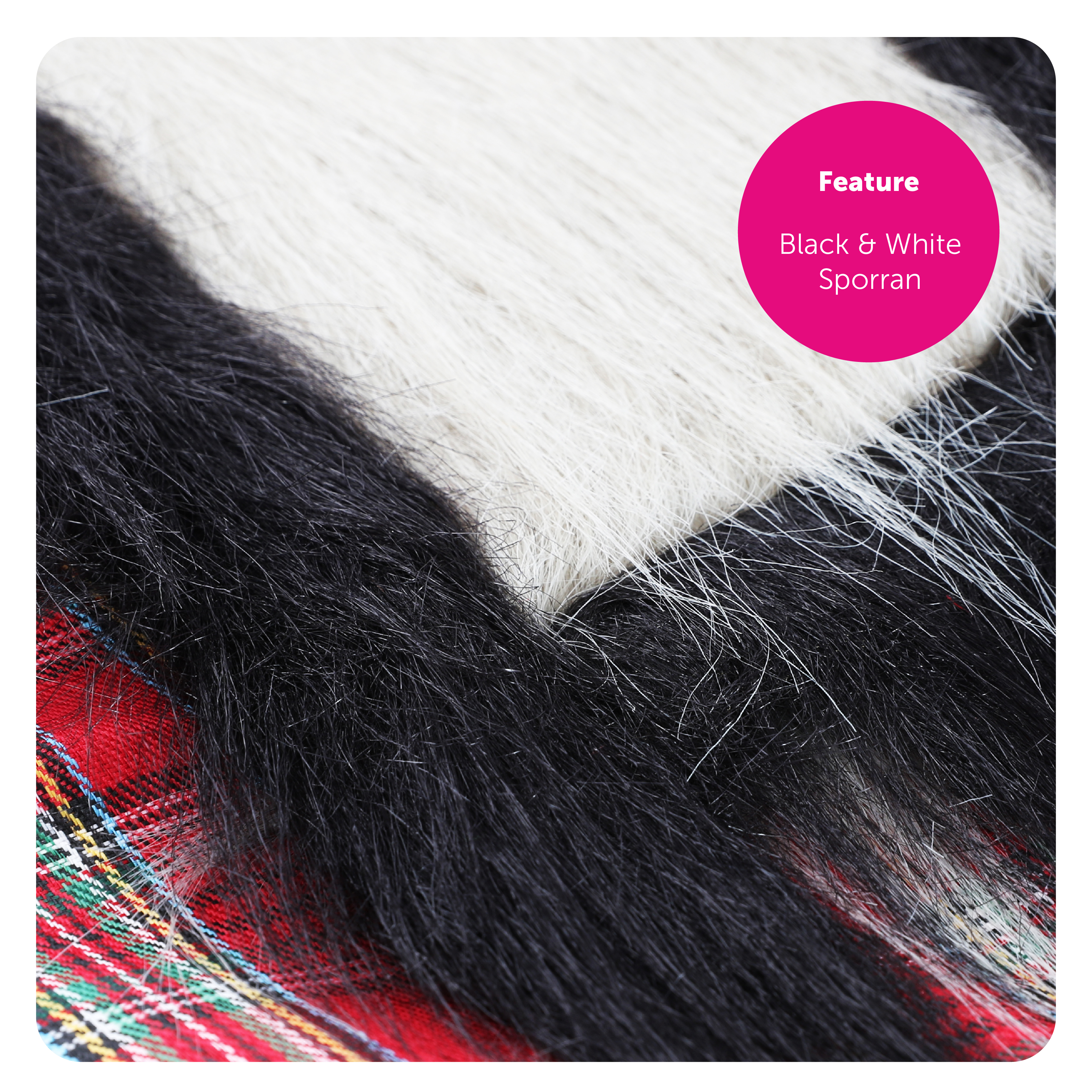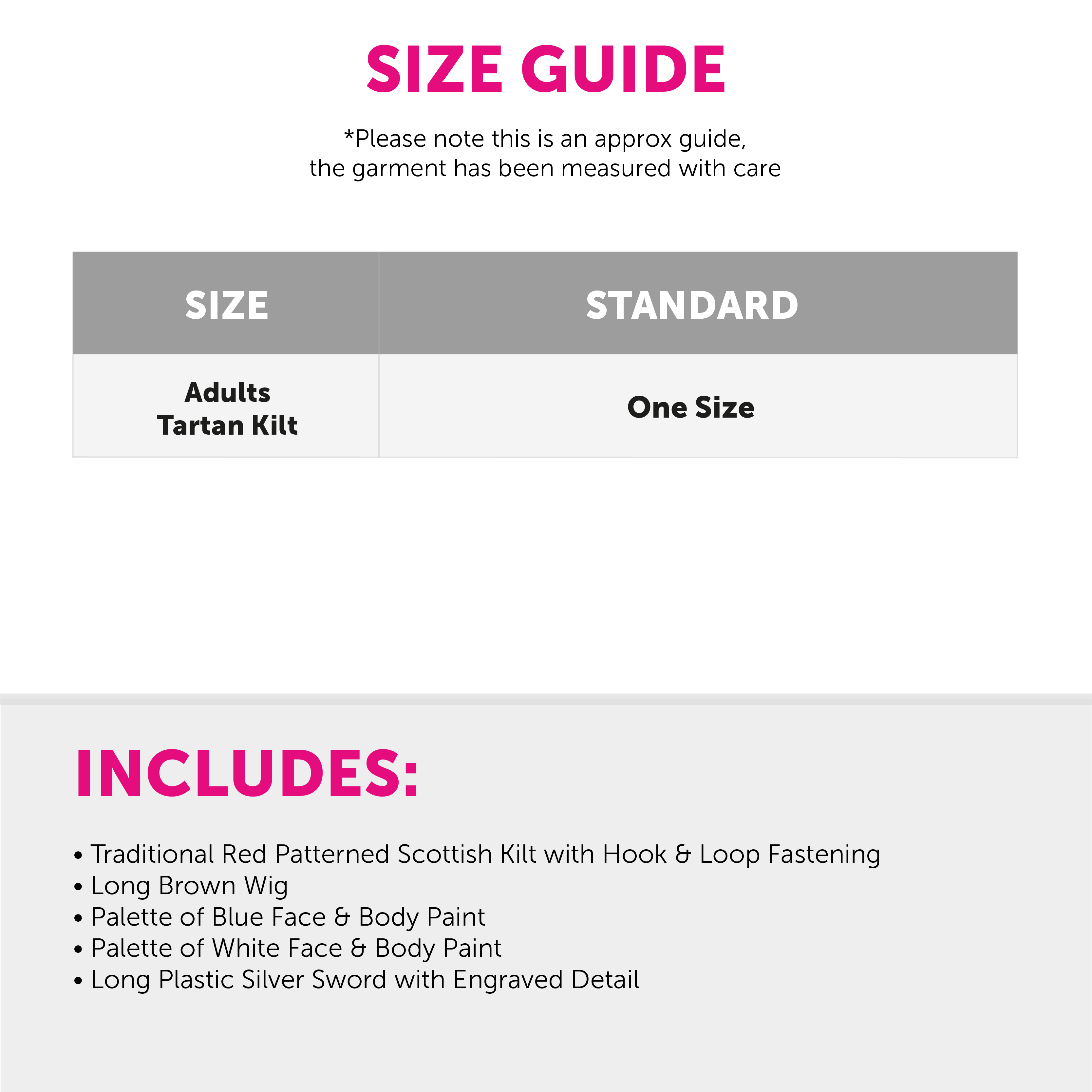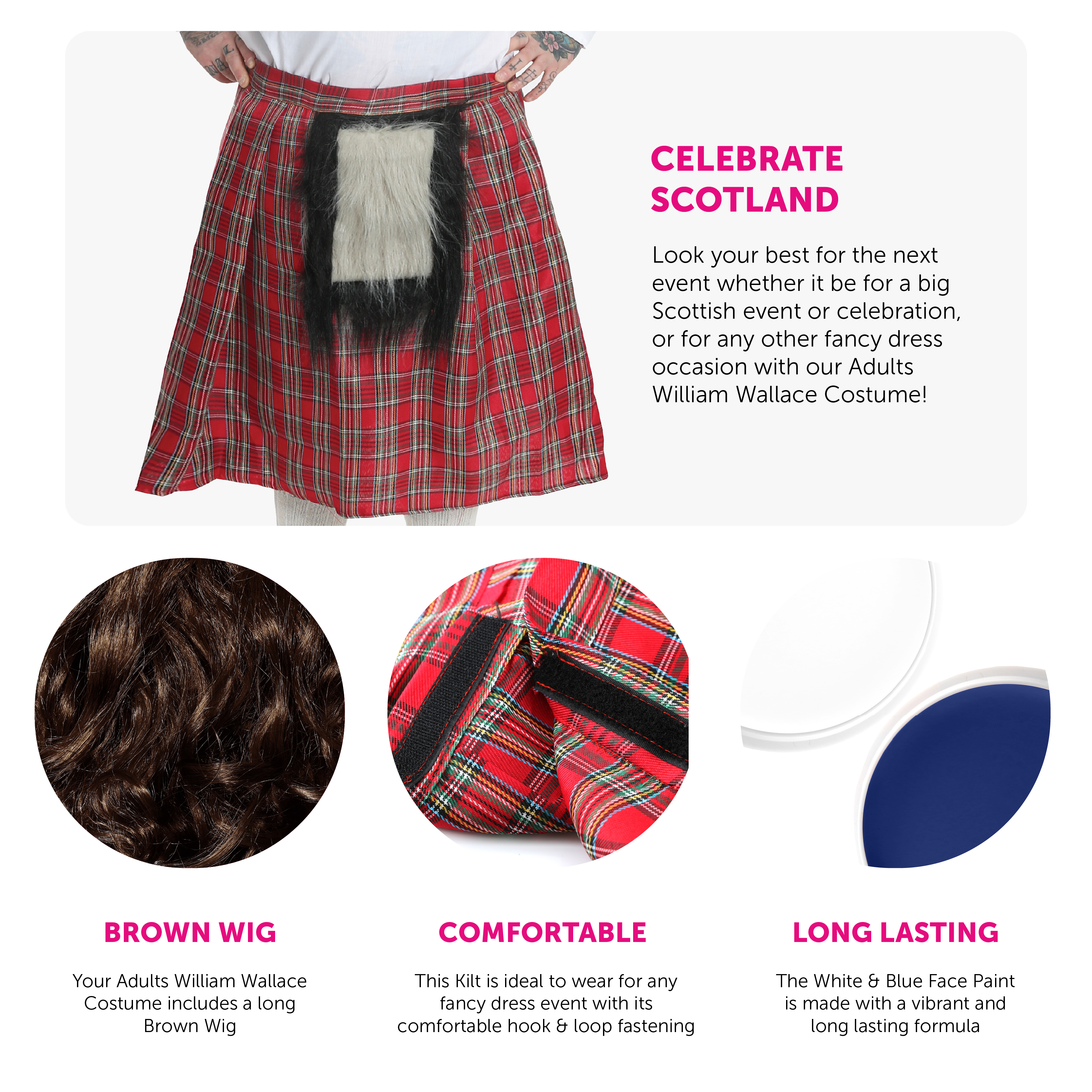 COSTUME DETAILS: The Adults William Wallace Costume includes a Kilt covered in a traditional styled Red Tartan pattern, with a soft Black and White Sporran attached to the front, a long Brown Wig, a palette of Blue Face Paint, a palette of White Face Paint, and a long Plastic Silver Sword with an engraved handle, you'll be sure to look bonny in this Scottish outfit!