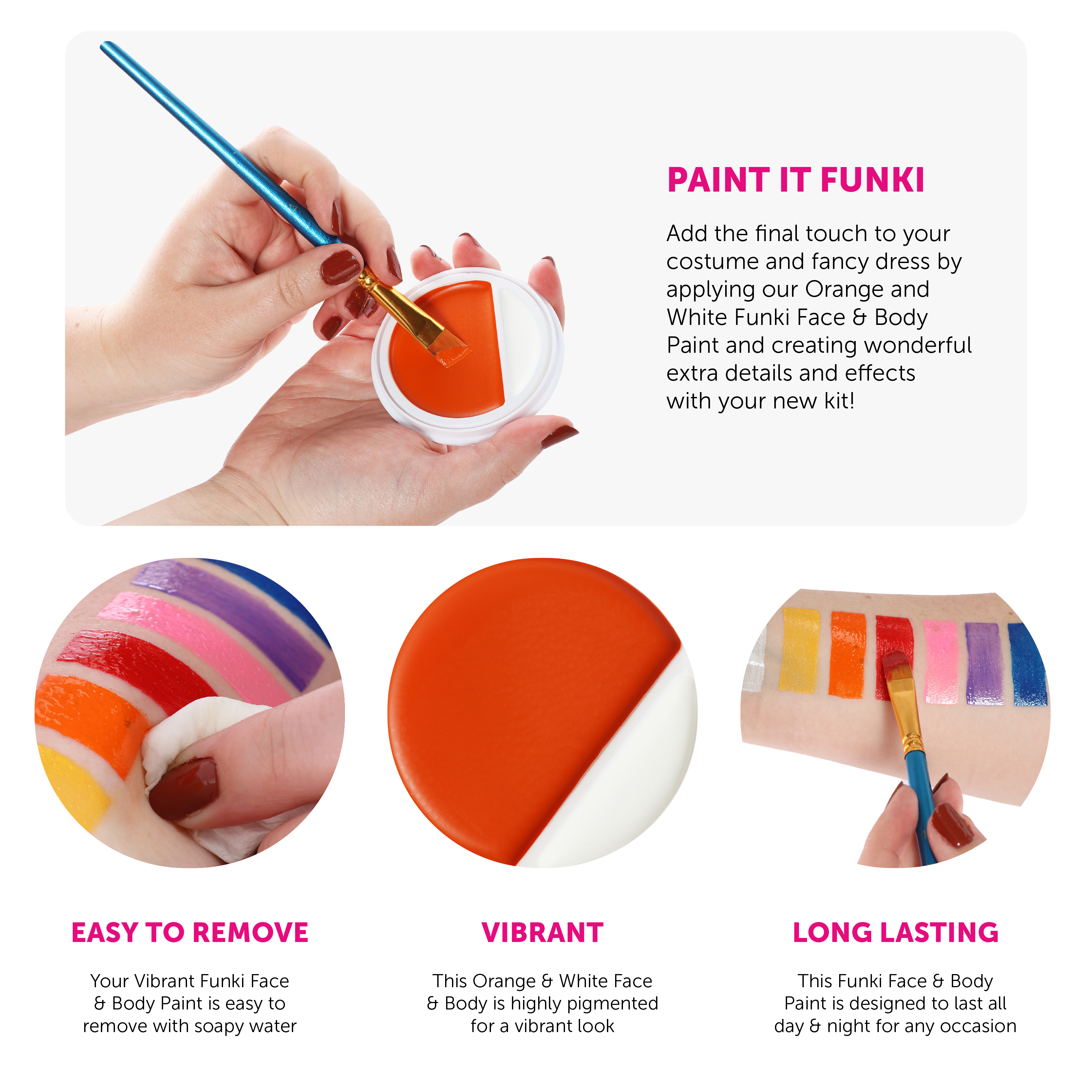 - ORANGE & WHITE FUNKI FACE & BODY PAINT: Add the final touch to your costume and fancy dress by applying our Orange and White Funki Face & Body Paint and creating wonderful extra details and effects with your new kit!